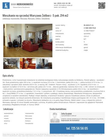 tel. (022) 412 41 50 email: [email protected] www: scn.waw.pl Mieszkanie na sprzedaż Warszawa Żoliborz - 5 pok. 214 m2 Lokalizacja: mazowieckie, Warszawa, Warszawa, Żoliborz, Gwiaździsta numer oferty M-20317-11 cena 2 500 000 PLN cena m 11 683 PLN/m2 mieszkanie sprzedaż, metraż 214 m2 piętro 6/7 liczba pokoi 5 rok budowy 2000 informacje dodatkowe garaż materiał budynku cegła 2 Opis oferty Przestronne, ciche 3-poziomowe mieszkanie na ostatniej kondygnacji bloku luksusowego osiedla na Żoliborzu. Poziom główny - wysokości 3m. Duży przestronny salon (50 m kw. ) z wyjściem na taras (13 m kw. ) i kominkiem, pokój (24 m kw. ) , widna kuchnia (17,5 m kw. ) z zabudową i sprzętem AGD, łazienka (6,8 m kw. )z wanną, WC i bidetem. Poziom niższy - wysokości 2,7m. Sypialnia (15,6 m kw. ) z wyjściem na balkon (17,6 m kw. ) od strony płd, pokój (14,7 m kw. , obecnie garderoba), łazienka (6,6 m kw. ) z WC i oknem na stronę płd. , mała pralnia i pomieszczenie gospodarcze. Poziom najwyższy wysokości 2,7m Klimatyzowany pokój (19,4 m kw. ) ze świetlikiem i wyjściem na taras, przeszkloną łazienką ( 3,2 m kw. ) z prysznicem, WC i 2-osobową sauną, oraz przeszklony przedsionek z kuchnią (9,8 m kw. ). DużyTARAS (77 m kw. ) z ogródkiem, trawnikiem i grillem z podłogą z decku drewnianego. Mieszkanie klimatyczne, designerskie urządzone w wysokim standardzie. Podłogi z klepki dębowej, w łazienkach terakota i glazura mozaikowa szklana. Drzwi na głównym poziomie szklane, na niższym poziomie drewniane. Do mieszkania przynależą 2 komfortowe miejsca parkingowe (16 i 21 m kw. ) W CENIE , schowek w garażu i schowek na strychu. Mieszkanie dokładnie vis a vis parku Kępa Potocka. Wokół zieleń i cisza, a dojazd do centrum Warszawy zajmuje 15 minut Osiedle zamknięte z ochroną. W pobliżu pełna infrastruktura. Polecam i zapraszam do oglądania! Pośrednik prowadzący Magdalena Armijak, nr licencji 19420 Lokalizacja Osoba kontaktowa Zofia Grzybek województwo mazowieckie powiat Warszawa [email protected] miasto Warszawa dzielnica Żoliborz Chętnie udzielę dodatkowych informacji związanych z tą ofertą. Zapraszam do kontaktu! ulica Gwiaździsta tel. 725 56 56 05 Zawsze dążymy do tego, aby informacje o proponowanych przez nas ofertach były jak najbardziej dokładne. Niekiedy jednak, ze względu na fakt, iż uzyskujemy je od osób trzecich nie jest możliwe ich zweryfikowanie, wobec czego należy traktować je orientacyjnie i nie stanowią one oferty w rozumieniu kodeksu cywilnego.