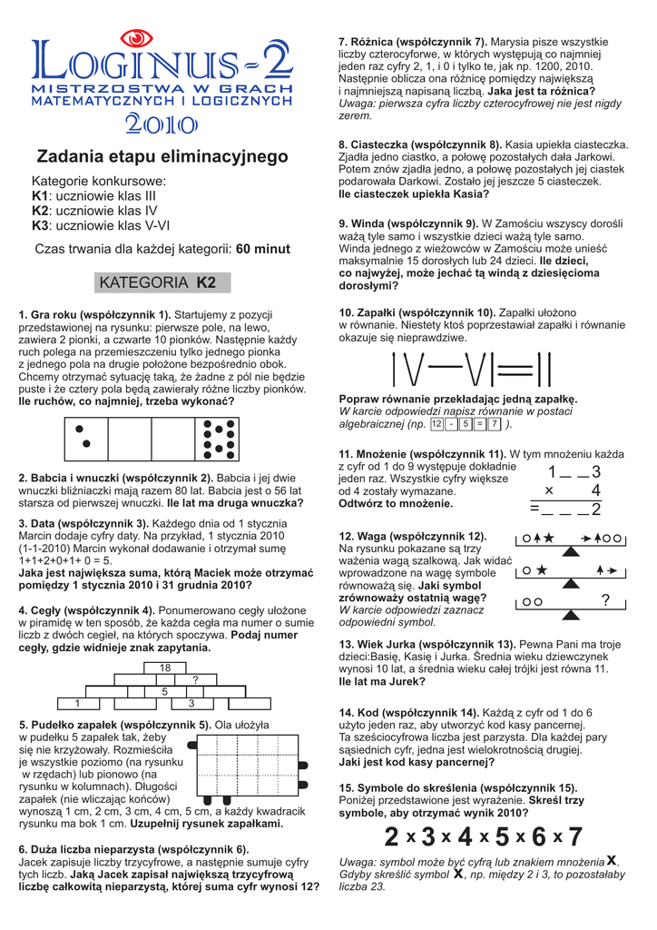 7. Różnica (współczynnik 7). Marysia pisze wszystkie liczby czterocyforwe, w których występują co najmniej jeden raz cyfry 2, 1, i 0 i tylko te, jak np. 1200, 2010. Następnie oblicza ona różnicę pomiędzy największą i najmniejszą napisaną liczbą. Jaka jest ta różnica? Uwaga: pierwsza cyfra liczby czterocyfrowej nie jest nigdy zerem. Zadania etapu eliminacyjnego Kategorie konkursowe: K1: uczniowie klas III K2: uczniowie klas IV K3: uczniowie klas V-VI Czas trwania dla każdej kategorii: 60 minut KATEGORIA K2 1. Gra roku (współczynnik 1). Startujemy z pozycji przedstawionej na rysunku: pierwsze pole, na lewo, zawiera 2 pionki, a czwarte 10 pionków. Następnie każdy ruch polega na przemieszczeniu tylko jednego pionka z jednego pola na drugie położone bezpośrednio obok. Chcemy otrzymać sytuację taką, że żadne z pól nie będzie puste i że cztery pola będą zawierały różne liczby pionków. Ile ruchów, co najmniej, trzeba wykonać? 2. Babcia i wnuczki (współczynnik 2). Babcia i jej dwie wnuczki bliźniaczki mają razem 80 lat. Babcia jest o 56 lat starsza od pierwszej wnuczki. Ile lat ma druga wnuczka? 3. Data (współczynnik 3). Każdego dnia od 1 stycznia Marcin dodaje cyfry daty. Na przykład, 1 stycznia 2010 (1-1-2010) Marcin wykonał dodawanie i otrzymał sumę 1+1+2+0+1+ 0 = 5. Jaka jest największa suma, którą Maciek może otrzymać pomiędzy 1 stycznia 2010 i 31 grudnia 2010? 4. Cegły (współczynnik 4). Ponumerowano cegły ułożone w piramidę w ten sposób, że każda cegła ma numer o sumie liczb z dwóch cegieł, na których spoczywa. Podaj numer cegły, gdzie widnieje znak zapytania. 18 ? 8. Ciasteczka (współczynnik 8). Kasia upiekła ciasteczka. Zjadła jedno ciastko, a połowę pozostałych dała Jarkowi. Potem znów zjadła jedno, a połowę pozostałych jej ciastek podarowała Darkowi. Zostało jej jeszcze 5 ciasteczek. Ile ciasteczek upiekła Kasia? 9. Winda (współczynnik 9). W Zamościu wszyscy dorośli ważą tyle samo i wszystkie dzieci ważą tyle samo. Winda jednego z wieżowców w Zamościu może unieść maksymalnie 15 dorosłych lub 24 dzieci. Ile dzieci, co najwyżej, może jechać tą windą z dziesięcioma dorosłymi? 10. Zapałki (współczynnik 10). Zapałki ułożono w równanie. Niestety ktoś poprzestawiał zapałki i równanie okazuje się nieprawdziwe. Popraw równanie przekładając jedną zapałkę. W karcie odpowiedzi napisz równanie w postaci algebraicznej (np. 12 - 5 = 7 ). 11. Mnożenie (współczynnik 11). W tym mnożeniu każda z cyfr od 1 do 9 występuje dokładnie 1 3 jeden raz. Wszystkie cyfry większe x od 4 zostały wymazane. 4 Odtwórz to mnożenie. = 12. Waga (współczynnik 12). Na rysunku pokazane są trzy ważenia wagą szalkową. Jak widać wprowadzone na wagę symbole równoważą się. Jaki symbol zrównoważy ostatnią wagę? W karcie odpowiedzi zaznacz odpowiedni symbol. 2 ? 13. Wiek Jurka (współczynnik 13). Pewna Pani ma troje dzieci:Basię, Kasię i Jurka. Średnia wieku dziewczynek wynosi 10 lat, a średnia wieku całej trójki jest równa 11. Ile lat ma Jurek? 5 1 3 5. Pudełko zapałek (współczynnik 5). Ola ułożyła w pudełku 5 zapałek tak, żeby się nie krzyżowały. Rozmieściła je wszystkie poziomo (na rysunku w rzędach) lub pionowo (na rysunku w kolumnach). Długości zapałek (nie wliczając końców) wynoszą 1 cm, 2 cm, 3 cm, 4 cm, 5 cm, a każdy kwadracik rysunku ma bok 1 cm. Uzupełnij rysunek zapałkami. 6. Duża liczba nieparzysta (współczynnik 6). Jacek zapisuje liczby trzycyfrowe, a następnie sumuje cyfry tych liczb. Jaką Jacek zapisał największą trzycyfrową liczbę całkowitą nieparzystą, której suma cyfr wynosi 12? 14. Kod (współczynnik 14). Każdą z cyfr od 1 do 6 użyto jeden raz, aby utworzyć kod kasy pancernej. Ta sześciocyfrowa liczba jest parzysta. Dla każdej pary sąsiednich cyfr, jedna jest wielokrotnością drugiej. Jaki jest kod kasy pancernej? 15. Symbole do skreślenia (współczynnik 15). Poniżej przedstawione jest wyrażenie. Skreśl trzy symbole, aby otrzymać wynik 2010? 2 x3x 4 x5x6 x7 x Uwaga: symbol może być cyfrą lub znakiem mnożenia . Gdyby skreślić symbol , np. między 2 i 3, to pozostałaby liczba 23. x