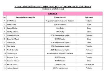 WYNIKI WOJEWÓDZKIEGO KONKURSU MUZYCZNEGO ESTRADA MŁODYCH (ułoŜone są alfabetycznie) II MIEJSCE Lp. Nazwisko i imię uczestnika Nazwa placówki Instrument 1 Brol Mateusz Niepubliczna Szkoła Muzyczna - Koszęcin Fortepian 2 Bryła Dorota SEAOM Pszczyna Śpiew 3 Czerny Monika SOA Tychy Śpiew 4 Czudaj Zuzanna SOA Tychy Śpiew 5 Czulewicz Kamila SOM Siemianowice Śląskie Fortepian 6 Duszyński Michał SOM Chorzów Gitara 7 Dźwil Alicja SOM Siemianowice Śląskie Gitara 8 Filuś Michał SOM Siemianowice Śląskie Fortepian 9 Franki Dominika SOM Siemianowice Śląskie Keyboard 10 Glura Martyna Konserwatorium Muzyczne - Katowice Fortepian 11 Grycman Kinga SOM Chorzów Fortepian 12 Grycman Mateusz SOM Chorzów Gitara 13 Kaczor Justyna SOM Chorzów Flet podłuŜny 14 Kalinowska Julia SOA Tarnowskie Góry Fortepian 15 Kania Paulina SEAOM Pszczyna Fortepian 16 Kobylec Karolina SOM Chorzów Fortepian 17 Kowalska Katarzyna SOM Chorzów Śpiew klasyczny 18 Kułacz Marta SOM Chorzów Flet 19 Kuś Klaudia SOM Siemianowice Śląskie Fortepian 20 Kuźnik Dorota SEAOM Pszczyna Fortepian 21 Kwiecień Martyna SOM Chorzów Keyboard 22 Ledwoń Jakub SOM Rybnik Keyboard 23 Mafa Oscar Konserwatorium Katowice Wiolonczela 24 Mamica Daria SOM Jaworzno Saksofon 25 Maroń Katarzyna SOM Chorzów Fortepian 26 Mazur Aleksandra SOM Siemianowice Śłąskie Fortepian 27 Mochnacki Mikołaj SOM Gliwice Skrzypce 28 Ogiński Daniel SOM Siemianowice Śląskie Gitara 29 Ośliźniok Eryk SOM Ruda Śląska Keyboard 30 Pawlik Katarzyna SOA Tarnowskie Góry Fortepian 31 Płotkowska Maria SOM Chorzów Gitara 32 Rogólska Agata SOM Jaworzno Fortepian 33 Siwek Marta SOM Piekary Śląskie Gitara 34 Skiba Joanna SOM Gliwice Fortepian 35 Skrzypek Agata SOM Chorzów Śpiew 36 Smolarczyk Katarzyna SOM Jaworzno Skrzypce 37 Walasik Szymon SOM Jaworzno Trąbka 38 Wątroba Jarosław SOM Chorzów Keyboard 39 Widera Joanna SOM Siemianowice Śląskie Fortepian 40 Wituła Patrycja SEAOM Pszczyna Śpiew solowo – estradowy 41 Zając Maja SOM Gliwice Fortepian 42 Zemczak Sara SOM Siemianowice Śląskie Gitara 43 śywczak Paweł SOM Siemianowice Śląskie Keyboard SOM Piekary Śląskie Duet gitarowy SOM Gliwice Duet gitarowy SOM Siemianowice Śląskie Duet gitarowy Płaszczymąka Patrycja 44 Widera Aleksandra Pollak Łukasz 45 Wysocki Łukasz Tutaj Magdalena 46 Dźwil Alicja Przywuska Aleksandra 47 Skrzypce SOM Gliwice Przywuski Michał Fortepian Kosak Adrianna 48 Wydra Justyna SOA Tarnowskie Góry Trio fletowe SOM Siemianowice Śląskie Duet fortepianowy SOM Gliwice - Do Re Mi Łaziska Górne - Kubicius Karina Sperling Edyta 49 Jabłońska Magdalena 1 Chór dziecięcy 2 Zespół Wokalny „Fantazja”
