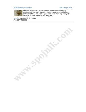 POZOSTAŁE | Wszystkie 25 Lutego 2015 oddam w dobre rece 2 letnia (pitbull/labrador mix) imie Keyssy uwielbia dzieci ,spacery ,zabawe , nasza rodzina sie powieksza i nie bedziemy zdolni nadal sie nia opiekowac. buda miski i itp mamy dla niej. bylo by milo jakby ktos mial duzy jard w w w .s po jn ik .c o m Justyna, Philadelphia, NJ,Trenton Tel.: 267-770-2360