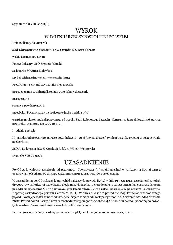 Sygnatura akt VIII Ga 311/13 WYROK W IMIENIU RZECZYPOSPOLITEJ POLSKIEJ Dnia 22 listopada 2013 roku Sąd Okręgowy w Szczecinie VIII Wydział Gospodarczy w składzie następującym: Przewodniczący: SSO Krzysztof Górski Sędziowie: SO Anna Budzyńska SR del. Aleksandra Wójcik-Wojnowska (spr.) Protokolant: sekr. sądowy Monika Ziębakowska po rozpoznaniu w dniu 22 listopada 2013 roku w Szczecinie na rozprawie sprawy z powództwa A. I. przeciwko Towarzystwu (...) spółce akcyjnej z siedzibą w W. o zapłatę na skutek apelacji pozwanego od wyroku Sądu Rejonowego Szczecin - Centrum w Szczecinie z dnia 6 czerwca 2013 roku, sygnatura akt X GC 286/13 I. oddala apelację; II. zasądza od pozwanego na rzecz powoda kwotę 300 zł (trzystu złotych) tytułem kosztów procesu w postępowaniu apelacyjnym. SSO A. Budzyńska SSO K. Górski SSR del. A. Wójcik-Wojnowska Sygn. akt VIII Ga 311/13 UZASADNIENIE Powód A. I. wniósł o zasądzenie od pozwanego Towarzystwa (...) spółki akcyjnej w W. kwoty 4 800 zł wraz z ustawowymi odsetkami od dnia 25 października 2011 r. oraz kosztów postępowania. W uzasadnieniu powód wskazał, iż samochód należący do powoda R. (...) w dniu 19 lipca 2011r. uczestniczył w kolizji drogowej w wyniku której uszkodzeniu uległa min. klapa tylna, belka zderzaka, podłoga bagażnika. Sprawca zdarzenia posiadał ubezpieczenie OC w pozwanym przedsiębiorstwie. Powód zgłosił zdarzenie w pozwanym Towarzystwie. Naprawę uszkodzonego pojazdu zlecono M. B. (1). W okresie, w jakim powód nie mógł korzystać z uszkodzonego pojazdu, wynajęty został samochód zastępczy. Najem samochodu zastępczego trwał od 17 sierpnia 2011r do 2 września 2011r. Powód pokrył koszty najmu samochodu zastępczego w wysokości 4 800 zł. oraz wezwał pozwaną do zwrotu tych kosztów. Pozwana odmówiła zwrotu kosztów samochodu. W dniu 30 stycznia 2013r wydany został nakaz zapłaty, od którego pozwana i wniosła sprzeciw. W sprzeciwie od nakazu zapłaty pozwana wniosła o oddalenie powództwa w całości i zasądzenie kosztów procesu. W uzasadnieniu pozwana wskazała, iż kwestionuje zasadność i niezbędność najmu pojazdu zastępczego. W ocenie pozwanej powód mógł planując naprawę pojazdu zaplanować zastępstwo dla uszkodzonego samochodu spośród innych posiadanych przez siebie pojazdów. Ponadto zdaniem pozwanej powód i działający w jego imieniu zakład naprawczy przyczynili się do nieuzasadnionego wydłużenia czasu naprawy. Samochód oddany został do warsztatu w dniu 17 sierpnia 2011r. zaś konieczność powtórnych oględzin zgłoszona została dopiero 24 sierpnia 2011r. W dniu 6 czerwca 2013r. Sąd Rejonowy Szczecin-Centrum w Szczecinie wydał wyrok, w którym zasądził od pozwanego na rzecz powoda kwotę 4800 zł wraz z ustawowymi odsetkami od dnia 25 października 2011r. zasądził także kwotę 857 zł tytułem kosztów procesu. Swoje rozstrzygnięcie Sąd Rejonowy oparł o następujące ustalenia faktyczne: Powód prowadzi działalność gospodarczą, m. in. z zakresu nauki jazdy. Powód wynajmuje posiadane przez siebie pojazdy innym podmiotom świadczącym usługi szkoleniowe. Powód wynajmował swój samochód marki R. (...) o numerze rejestracyjnym (...) M. I. (1) w celu wykorzystywania go do prowadzenia szkoleń z zakresu nauki jazdy. W dniu 19 lipca 2011r. doszło do kolizji drogowej podczas prowadzenia praktycznych zajęć dydaktycznych przez instruktora M. B. (2). W wyniku zdarzenia uszkodzeniu uległ tył pojazdu: zderzak, tylna klapa, lampa tylna, pas tylny, pokrywa tylna, tablica rejestracyjna, osłona tapicerska dołu drzwi, podłoga tylna. Szkoda została zgłoszona ubezpieczycielowi sprawcy szkody- pozwanej przez przedstawiciela powoda P. N.. Po zdarzeniu samochód jeździł i był wykorzystywany do sprawdzenia zajęć praktycznych. Ubezpieczyciel wycenił szkodę w pojeździe na kwotę 1494,44 zł. W dniu 17 sierpnia 2011r. samochód został oddany do naprawy M. B. (1). Drugiego dnia po przyjęciu samochodu do naprawy M. B. (1) zgłosił konieczność powtórnych oględzin albowiem rozmiar uszkodzeń samochodu były większy niż te wskazane w kalkulacji. Z uwagi na brak reakcji ubezpieczyciela na pierwsze zgłoszenie, po kilku dniach wysłano faxem zgłoszenie dodatkowych oględzin. W związku z oddaniem samochodu do warsztatu, koniecznym było wynajęcie samochodu zastępczego. Powód wynajął samochód zastępczy w Akademii (...) spółce z o.o. Wynajęty samochód był technicznie przystosowany do prowadzenia nauki jazdy. Okres najmu strony ustaliły od dnia 17 sierpnia 2011r. do dnia zakończenia naprawy powypadkowej. Opłatę za najem ustalono na kwotę 300,00 zł netto za każdą dobę najmu pojazdu. W dniu 17 sierpnia 2011 r powód poinformował pozwaną o wynajęciu samochodu zastępczego. Dodatkowe oględziny odbyły się 28 sierpnia 2011r. Technologiczny czas naprawy uszkodzonego pojazdu wyniósł 4 dni. Oczekiwanie na zamówione części wyniosło 2 dni. M. B. (1) rozpoczął naprawę uszkodzonego pojazdu jeszcze przed otrzymaniem uzupełnionej kalkulacji kosztów naprawy sporządzanej przez pozwaną na zawiadomienie o konieczności dodatkowych oględzin. Na skutek dodatkowych oględzin pozwana wyceniła wartość naprawy na kwotę 3 751,58 zł. Naprawa pojazdu trwała do dnia 2 września 2011r. Wynajęty pojazd wykorzystywany był w okresie od 17 sierpnia 2011 r. do dnia 2 września 2011r. do prowadzenia zajęć praktycznych z nauki jazdy i w tym celu wynajmowany był przez powoda M. I. (2). Akademia (...) Sp. z o.o. z siedzibą w S. wystawiła w dniu 9 września 2011r rachunek z tytułu najmu pojazdu zastępczego opiewający na kwotę 4.800 zł. Rachunek dotyczył najmu pojazdu w okresie od 17 sierpnia 2011r. do 2 września 2011r. Powód uiścił należność za najem pojazdu. W dniach 6 października i 19 grudnia 2011r. powód wezwał pozwaną do zapłaty kwoty 4.800,00 zł tytułem zwrotu poniesionych kosztów wynajmu pojazd