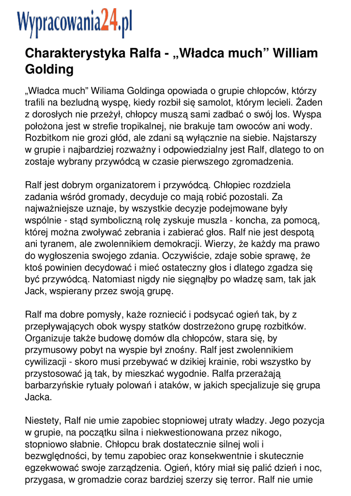 Charakterystyka Ralfa - „Władca much” William Golding „Władca much” Wiliama Goldinga opowiada o grupie chłopców, którzy trafili na bezludną wyspę, kiedy rozbił się samolot, którym lecieli. Żaden z dorosłych nie przeżył, chłopcy muszą sami zadbać o swój los. Wyspa położona jest w strefie tropikalnej, nie brakuje tam owoców ani wody. Rozbitkom nie grozi głód, ale zdani są wyłącznie na siebie. Najstarszy w grupie i najbardziej rozważny i odpowiedzialny jest Ralf, dlatego to on zostaje wybrany przywódcą w czasie pierwszego zgromadzenia. Ralf jest dobrym organizatorem i przywódcą. Chłopiec rozdziela zadania wśród gromady, decyduje co mają robić pozostali. Za najważniejsze uznaje, by wszystkie decyzje podejmowane były wspólnie - stąd symboliczną rolę zyskuje muszla - koncha, za pomocą, której można zwoływać zebrania i zabierać głos. Ralf nie jest despotą ani tyranem, ale zwolennikiem demokracji. Wierzy, że każdy ma prawo do wygłoszenia swojego zdania. Oczywiście, zdaje sobie sprawę, że ktoś powinien decydować i mieć ostateczny głos i dlatego zgadza się być przywódcą. Natomiast nigdy nie sięgnąłby po władzę sam, tak jak Jack, wspierany przez swoją grupę. Ralf ma dobre pomysły, każe rozniecić i podsycać ogień tak, by z przepływających obok wyspy statków dostrzeżono grupę rozbitków. Organizuje także budowę domów dla chłopców, stara się, by przymusowy pobyt na wyspie był znośny. Ralf jest zwolennikiem cywilizacji - skoro musi przebywać w dzikiej krainie, robi wszystko by przystosować ją tak, by mieszkać wygodnie. Ralfa przerażają barbarzyńskie rytuały polowań i ataków, w jakich specjalizuje się grupa Jacka. Niestety, Ralf nie umie zapobiec stopniowej utraty władzy. Jego pozycja w grupie, na początku silna i niekwestionowana przez nikogo, stopniowo słabnie. Chłopcu brak dostatecznie silnej woli i bezwględności, by temu zapobiec oraz konsekwentnie i skutecznie egzekwować swoje zarządzenia. Ogień, który miał się palić dzień i noc, przygasa, w gromadzie coraz bardziej szerzy się terror. Ralf nie umie poradzić sobie z Jackiem i jego zwolennikami, którzy zajmują się polowaniem i dlatego twierdzą, że są ważniejsi od innych. Dochodzi do ostatecznej rozgrywki - Ralf z najbliższym przyjacielem Prosiaczkiem idą do kwatery głównej Jacka, by odzyskać okulary, niezbędne do rozpalania ognia. Kolega Ralfa ginie, a on sam musi ratować się ucieczką przed zwolennikami Jacka. Okazuje się, że uczciwy, dobry i sprawiedliwy Ralf poniósł klęskę, zatryumfowała prymitywna przemoc, wyznawana przez Jacka. Ralfowi zabrakło silnej woli, a może był zbyt wielkim marzycielem, wierzącym w dobroć ludzką i srogo się na tym zawiódł. Chłopiec rozumie swoją przegraną, płacze nad swoim losem, a jednocześnie nie może pogodzić się z faktem, że w naturze ludzkiej tkwi tyle zła.