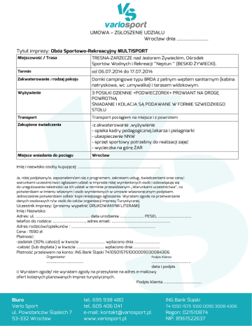 UMOWA – ZGŁOSZENIE UDZIAŁU Wrocław dnia ………………….. Tytuł imprezy: Obóz Sportowo-Rekreacyjny MULTISPORT Miejscowość / Trasa TRESNA-ZARZECZE nad Jeziorem Żywieckim, Ośrodek Sportów Wodnych i Rekreacji ‘’Neptun ‘’ (BESKID ŻYWIECKI). Termin od 06.07.2014 do 17.07.2014 Zakwaterowanie / rodzaj pokoju Domki campingowe typu BRDA z pełnym węzłem sanitarnym (kabina natryskowa, wc ,umywalka) i tarasem widokowym. Wyżywienie 3 POSIŁKI DZIENNIE +PODWIECZOREK+ PROWIANT NA DROGĘ POWROTNĄ ŚNIADANIE I KOLACJA SĄ PODAWANE W FORMIE SZWEDZKIEGO STOŁU Transport Transport pociągiem na miejsce i z powrotem Zakupione świadczenia -z akwaterowanie ,wyżywienie - opieka kadry pedagogicznej,lekarza i pielęgniarki - ubezpieczenie NNW - sprzęt sportowy potrzebny do realizacji zajęć - wycieczka na górę ŻAR Miejsce wsiadania do pociągu Wrocław Imię i nazwisko osoby kupującej: ……………………………………………………………… Ja, niżej podpisany/a, zapoznałem/am się z programem, zakresem usług, świadczeniami oraz ceną i warunkami uczestnictwa i zgłaszam udział w imprezie niżej wymienionych osób i zobowiązuję się do uregulowania należności za ich udział w terminie przewidzianym „Warunkami uczestnictwa”, co potwierdzam w imieniu własnym i osób wymienionych w umowie własnoręcznym podpisem. Jednocześnie potwierdzam odbiór kopii niniejszego zgłoszenia. Wyrażam zgodę na przetwarzanie danych osobowych n/w osób do celów organizacji imprezy Turystycznej. Uczestnik imprezy: (prosimy wypełnić DRUKOWANYMI LITERAMI) Imię i Nazwisko: Adres: ul. ……………………………………….. data urodzenia ………………... PESEL ……………………….. telefon do rodzica: …………………......., adres email: …………………………………………… Adres rodziców/opiekunów : ………………………………………………………………. Cena : 1590 zł Płatność: -zadatek (30% całości) w kwocie …………………. wpłacono dnia …………………. -całość (lub dopłata ) w kwocie …………………… wpłacono dnia ………………….. Płatność przelewem na konto: ING Bank Śląski 74105015751000009030084306 Organizator Podpis Klienta .................................. .................................... data i podpis O Wyrażam zgodę/ nie wyrażam zgody na przesyłanie na adres e-mailowy ofert kolejnych planowanych imprez turystycznych. Podpis klienta …………………………… Biuro Vario Sport ul. Powstańców Śląskich 7 53-332 Wrocław tel. 695 938 480 tel. 605 406 041 e-mail: [email protected] www.variosport.pl ING Bank Śląski 74 1050 1575 1000 0090 3008 4306 Regon: 021510874 NIP: 8961522637 WARUNKI UCZESTNICTWA 1. Udział w imprezach organizowanych przez Klub Sportowy „Ultratenis” NIP:8961522637, Regon:021510874, zwany dalej organizatorem, a osobą prawną lub fizyczną, zwaną dalej uczestnikiem odbywa się na podstawie umowy zawartej między organizatorem a uczestnikiem. 2. Przedmiotem umowy jest oferta przełożona uczestnikowi przez organizatora zawierającą proponowane usługi oraz termin i sposób ich realizacji. 3. Przed zawarciem umowy uczestnik powinien zapoznać się z warunkami uczestnictwa i z chwilą ich akceptacji poświadczyć ten fakt na egzemplarzu umowy. 4. Uczestnik może zawrzeć umowę z organizatorem w imieniu osób trzecich działając z ich upoważnienia i dokonać w ich imieniu akceptacji warunków uczestnictwa. 5. Zawarcie umowy uczestnictwa następuje z chwilą ich podpisania przez organizatora i uczestnika. 6. Przy podpisaniu umowy uczestnik zobowiązany jest wpłacić co najmniej 30% ceny imprezy, a pozostałą kwotę uiścić nie później niż 14 dni przed jej rozpoczęciem pod rygorem unieważnienia umowy przez organizatora, lub w terminach uzgodnionych z organizatorem i wpisanych do umowy. 7. W szczególnych przypadkach, wymienionych w ustawie o usługach turystycznych, organizator zastrzega sobie prawo zmiany warunków umowy o czym musi niezwłocznie powiadomić uczestnika. Uczestnik może w takim wypadku zaakceptować zmianę lub odstąpić od umowy otrzymując wpłacone zaliczkowo kwoty w całości. 8. Uczestnik zobowiązany jest dostarczyć w wyznaczonym przez organizatora terminie wszystkie dokumenty wymagane do realizacji imprezy. 9. Organizator zastrzega sobie prawo anulowania imprezy z przyczyn działania „siły wyższej” lub gdyby jej realizacja była uwarunkowana określoną liczbą uczestników. Anulowanie imprezy może nastąpić również w przypadku istnienia realnego zagrożenia życia lub zdrowia uczestników. Uczestnik otrzymuje zwrot wpłaconych kwot w całości. 10. W przypadku zmiany programu (zaakceptowanego przez uczestnika), organizator zobowiązany jest do zapewnienia świadczeń ekwiwalentnych, bądź zwrotu należności za te świadczenia. 11. Uczestnikowi przysługuje zwrot kosztów za świadczenia nie wykorzystane z winy własnej wyłącznie wówczas, jeśli na niewykorzystane świadczenia biuro nie poniosło kosztów. Zastrzeżenie to dotyczy również przerwania podróży lub pobytu lub zatrzymania uczestnika przez uprawnione władze z powodów, na które organizator nie miał wpływu. Każdy ewentualny zwrot kosztów ustalany jest indywidualnie dla każdego klienta. 12. Uczestnik rezygnuje z imprezy w momencie złożenia pisemnego oświadczenia. 13. Jeżeli uczestnik nie weźmie udziału w imprezie z przyczyn niezależnych od organizatora, z wniesionych przez niego opłat potrąca się kwotę wydatkowaną na przygotowanie imprezy Turystycznej. 14. Gdy uczestnik wykupuje tylko jedno miejsce musi liczyć się z koniecznością zakwaterowania z inną osobą gdy organizator nie dysponuje pokojami 1 – osobowymi i jeśli pokój 1 os nie został zagwarantowany w umowie. 15. Uczestnik udający się na miejsce indywidualnie realizuje świadczenia na podstawie dokumentu wystaw