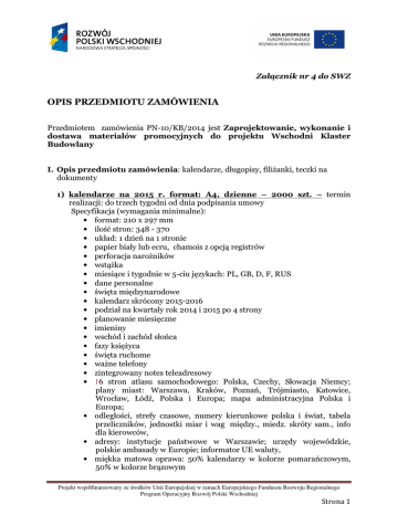 Załącznik nr 4 do SWZ OPIS PRZEDMIOTU ZAMÓWIENIA Przedmiotem zamówienia PN-10/KB/2014 jest Zaprojektowanie, wykonanie i dostawa materiałów promocyjnych do projektu Wschodni Klaster Budowlany I. Opis przedmiotu zamówienia: kalendarze, długopisy, filiżanki, teczki na dokumenty 1) kalendarze na 2015 r. format: A4, dzienne – 2000 szt. – termin realizacji: do trzech tygodni od dnia podpisania umowy Specyfikacja (wymagania minimalne): • format: 210 x 297 mm • ilość stron: 348 - 370 • układ: 1 dzień na 1 stronie • papier biały lub ecru, chamois z opcją registrów • perforacja narożników • wstążka • miesiące i tygodnie w 5-ciu językach: PL, GB, D, F, RUS • dane personalne • święta międzynarodowe • kalendarz skrócony 2015-2016 • podział na kwartały rok 2014 i 2015 po 4 strony • planowanie miesięczne • imieniny • wschód i zachód słońca • fazy księżyca • święta ruchome • ważne telefony • zintegrowany notes teleadresowy • 16 stron atlasu samochodowego: Polska, Czechy, Słowacja Niemcy; plany miast: Warszawa, Kraków, Poznań, Trójmiasto, Katowice, Wrocław, Łódź, Polska i Europa; mapa administracyjna Polska i Europa; • odległości, strefy czasowe, numery kierunkowe polska i świat, tabela przeliczników, jednostki miar i wag między., miedz. skróty sam., info dla kierowców, • adresy: instytucje państwowe w Warszawie; urzędy wojewódzkie, polskie ambasady w Europie; informator UE waluty, • miękka matowa oprawa: 50% kalendarzy w kolorze pomarańczowym, 50% w kolorze brązowym Projekt współfinansowany ze środków Unii Europejskiej w ramach Europejskiego Funduszu Rozwoju Regionalnego Program Operacyjny Rozwój Polski Wschodniej Strona 1 zdjęcie poglądowe oprawy: • elementy dodatkowe: - tłoczone logo Wschodniego Klastra Budowlanego na okładce -wklejka reklamowa przed stroną tytułową, z kolorowym nadrukiem jednostronnym: Zamówienie obejmuje także: -opracowanie treści, tj. skład graficzny i przygotowanie do druku wkładki, na podstawie materiałów przekazanych przez Zamawiającego - obróbkę graficzną - dostawę kalendarzy do siedziby Zamawiającego Wykonawca przygotuje 3 projekty layoutu wkładki reklamowej na podstawie przekazanych przez Zamawiającego materiałów oraz uwzględni uwagi Zamawiającego na etapie konsultacji projektu. Zamawiający wybierze jeden layout, zgodnie z którym Wykonawca wykona wkładkę reklamową. 2) długopisy – 2000 szt. - termin realizacji: do czterech tygodni od dnia podpisania umowy Długopis plastikowy z dużym, niebieskim wkładem, wyposażony w srebrny, metalowy klip oraz gumkę ułatwiającą pisanie. Wymiary: 14,5 x ø 1,2 (cm). Na wybranym rodzaju długopisu Wykonawca na korpusie umieści, trwały nadruk: Po jednej stronie logotypy – Program Operacyjny Rozwój Polski Wschodniej i Unia Europejska + Europejski Fundusz Rozwoju Regionalnego Po drugiej stronie – logotyp Wschodniego Klastra Budowlanego Zdjęcie poglądowe długopisów: Projekt współfinansowany ze środków Unii Europejskiej w ramach Europejskiego Funduszu Rozwoju Regionalnego Program Operacyjny Rozwój Polski Wschodniej Strona 2 3) filiżanki – 3000 szt. - termin realizacji: do czterech tygodni od dnia podpisania umowy Filiżanki z białej porcelany, min. poj. 220 ml, min. wielkość spodka 145 mm. Na filiżankach Wykonawca umieści kolorowy logotyp projektu oraz logotypy wraz z odwołaniem słownym o źródle współfinansowania; zdobienie: nadruk w kolorze, kalkomania 2 rzuty. Filiżanki wraz ze spodkami pakowane w opakowania z tektury w kolorze białym po 4 sztuki (750 opakowań). Zdjęcie poglądowe: 4) teczki na dokumenty – 3 000 szt. – termin realizacji: do czterech tygodni od dnia podpisania umowy • kolorystyka 4+0 • papier kreda mat 350 g/m2 • lakier UV błyszczący po całości • standardowy wymiar, z grzbietem min 5 mm pozwalającym zmieścić co najmniej 10 1-kartkowych dokumentów formatu A4 drukowanych na papierze xero 80 g/m2, miejsce na włożenie wizytówki. Projekt współfinansowany ze środków Unii Europejskiej w ramach Europejskiego Funduszu Rozwoju Regionalnego Program Operacyjny Rozwój Polski Wschodniej Strona 3 • • teczki złożone, ze sklejoną kieszenią na dokumenty, tzn. gotowe do użycia i niewymagające składania. pakowanie w kartony z tektury falistej Zamówienie obejmuje także: - opracowanie treści, tj., przygotowanie projektów graficznych teczek na podstawie materiałów przekazanych przez zamawiającego, skład graficzny, przygotowanie do druku - dostawę do siedziby Zamawiającego z wniesieniem po schodach na piętro Wykonawca przygotuje 3 projekty graficzne teczki na podstawie przekazanych przez Zamawiającego materiałów oraz uwzględni uwagi Zamawiającego na etapie konsultacji projektu. Zamawiający wybierze jedną propozycję, zgodnie z którym Wykonawca wykona teczki. Zamówienie obejmuje również przechowywanie materiałów. Wykonawca przechowa materiały promocyjne przez okres 3 miesięcy od daty ich wykonania w warunkach odpowiednich do zachowania ich właściwości technicznych i użytkowych. Przechowywane materiały dostarczane będą Zamawiającemu sukcesywnie, każdorazowo po otrzymania wezwania od Zamawiającego (maksymalnie 4 dostawy). Dostawa, rozładunek i wniesienie materiałów będą każdorazowo przez Wykonawcę na jego koszt i ryzyko. dokonywane Na wszystkich materiałach promocyjnych obligatoryjnie należy umieścić informację o współfinansowaniu projektu ze środków Unii Europejskiej zgodnie z Zasadami Promocji projektów dla Programu Operacyjnego Rozwój Polski Wschodniej - dostępne na stronie: http://www.polskawschodnia.gov.pl/ZPFE/Strony/zasady.aspx Projekt współfinansowany ze środków Unii Europejskiej w ramach Europejskiego Funduszu Rozwoju Regionalnego Program Operacyjny Rozwój Polski Wschodniej Strona 4