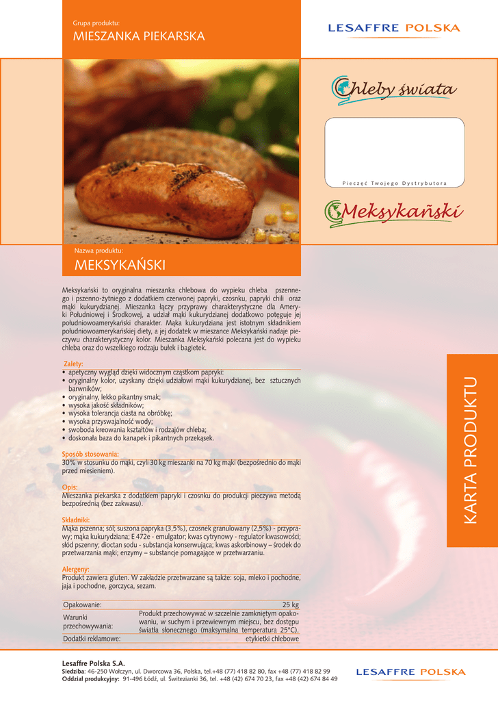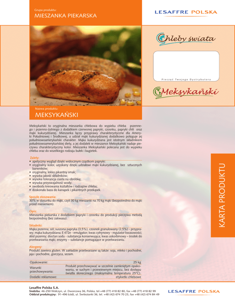 Grupa produktu: MIESZANKA PIEKARSKA P i e c z ´ ç Tw o j e g o D y s t r y b u t o r a Nazwa produktu: MEKSYKA¡SKI Zalety: • apetyczny wyglàd dzi´ki widocznym czàstkom papryki: • oryginalny kolor, uzyskany dzi´ki udzia∏owi màki kukurydzianej, bez sztucznych barwników; • oryginalny, lekko pikantny smak; • wysoka jakoÊç sk∏adników; • wysoka tolerancja ciasta na obróbk´; • wysoka przyswajalnoÊç wody; • swoboda kreowania kszta∏tów i rodzajów chleba; • doskona∏a baza do kanapek i pikantnych przekàsek. Sposób stosowania: 30% w stosunku do màki, czyli 30 kg mieszanki na 70 kg màki (bezpoÊrednio do màki przed miesieniem). Opis: Mieszanka piekarska z dodatkiem papryki i czosnku do produkcji pieczywa metodà bezpoÊrednià (bez zakwasu). Sk∏adniki: Màka pszenna; sól; suszona papryka (3,5%), czosnek granulowany (2,5%) - przyprawy; màka kukurydziana; E 472e - emulgator; kwas cytrynowy - regulator kwasowoÊci; s∏ód pszenny; dioctan sodu - substancja konserwujàca; kwas askorbinowy – Êrodek do przetwarzania màki; enzymy – substancje pomagajàce w przetwarzaniu. Alergeny: Produkt zawiera gluten. W zak∏adzie przetwarzane sà tak˝e: soja, mleko i pochodne, jaja i pochodne, gorczyca, sezam. Opakowanie: Warunki przechowywania: Dodatki reklamowe: Lesaffre Polska S.A. 25 kg Produkt przechowywaç w szczelnie zamkni´tym opakowaniu, w suchym i przewiewnym miejscu, bez dost´pu Êwiat∏a s∏onecznego (maksymalna temperatura 25°C). etykietki chlebowe Siedziba: 46-250 Wo∏czyn, ul. Dworcowa 36, Polska, tel.+48 (77) 418 82 80, fax +48 (77) 418 82 99 Oddział produkcyjny: 91-496 Łódê, ul. Âwitezianki 36, tel. +48 (42) 674 70 23, fax +48 (42) 674 84 49 KARTA PRODUKTU Meksykaƒski to oryginalna mieszanka chlebowa do wypieku chleba pszennego i pszenno-˝ytniego z dodatkiem czerwonej papryki, czosnku, papryki chili oraz màki kukurydzianej. Mieszanka ∏àczy przyprawy charakterystyczne dla Ameryki Po∏udniowej i Ârodkowej, a udzia∏ màki kukurydzianej dodatkowo pot´guje jej po∏udniowoamerykaƒski charakter. Màka kukurydziana jest istotnym sk∏adnikiem po∏udniowoamerykaƒskiej diety, a jej dodatek w mieszance Meksykaƒski nadaje pieczywu charakterystyczny kolor. Mieszanka Meksykaƒski polecana jest do wypieku chleba oraz do wszelkiego rodzaju bu∏ek i bagietek. Grupa produktu: MIESZANKA PIEKARSKA P i e c z ´ ç Tw o j e g o D y s t r y b u t o r a Nazwa produktu: MEKSYKA¡SKI Namiar surowców [g] Sk∏adniki Pieczywo typu „Ciabata” Namiar surowców [g] Sk∏adniki Bu∏ki Meksykaƒskie Namiar surowców [g] Sk∏adniki 20% 25% 30% Ciasto Ciasto Ciasto Màka pszenna typ 750 6 000 Màka pszenna typ 550 7 500 Màka pszenna typ 550 8 000 Màka ˝tynia typ 720 1 000 MIESZANKA 2 500 MIESZANKA 2 000 MIESZANKA 3 000 Dro˝d˝e 200 Dro˝d˝e 400 Dro˝d˝e 300 Woda 6 400 Woda 5 200 Woda 6000-6200 Miesienie 2’ + 8’ Miesienie 3’ + 4’ Miesienie 3’ + 4’ Temperatura ciasta 25 - 26°C Temperatura ciasta 26 - 27°C Temperatura ciasta 28 - 29°C Wst´pna fermentacja 60 minut Wst´pna fermentacja 15 minut Wst´pna fermentacja 15 minut Wytwarzanie: Wszystkie sk∏adniki ciasta wymiesiç i odstawiç ciasto do wst´pnej fermentacji. Nast´pnie odwa˝yç po˝àdanà gramatur´, uformowaç k´s ciasta i u∏o˝yç w formie, koszyku lub na taÊmie. Fermentowaç w temperaturze 33-35°C i wilgotnoÊci powietrza oko∏o 85% przez 35 – 45 minut. Wytwarzanie: Wszystkie sk∏adniki ciasta wymiesiç do doÊç luênej konsystencji (wod´ dodawaç partiami). Odstawiç ciasto do wst´pnej fermentacji na 60 minut pod przykryciem. Po tym czasie ciasto uformowaç w po˝àdane k´sy, fermentowaç w 33-35°C i wilgotnoÊci powietrza oko∏o 85% przez kolejne 20 minut. Wytwarzanie: Wszystkie sk∏adniki ciasta wymiesiç do normalnej konsystencji. Odstawiç ciasto do wst´pnej fermentacji na 15 minut, a nast´pnie podzieliç i zaokràgliç na dzielarce. Po∏o˝yç uformowane bu∏eczki na blachach i wstawiç do komory fermentacyjnej. Fermentowaç w temperaturze 33 - 35 stopni Celsjusza i wilgotnoÊci powietrza 85% przez oko∏o 35 - 45 minut. Wypiek: 200°C z zaparowaniem 20 Wypiek: 200-220°C z zaparowaniem minut 180°C Wypiek: 180°C z zaparowaniem Po 13-15 minutach zerwaç luft Czas wypieku: oko∏o 35 – 45 minut Czas wypieku: 18-20 minut Lesaffre Polska S.A. Czas wypieku: oko∏o 25 minut Siedziba: 46-250 Wo∏czyn, ul. Dworcowa 36, Polska, tel.+48 (77) 418 82 80, fax +48 (77) 418 82 99 Oddział produkcyjny: 91-496 Łódê, ul. Âwitezianki 36, tel. +48 (42) 674 70 23, fax +48 (42) 674 84 49 RECEPTURA Chleb Meksykaƒski