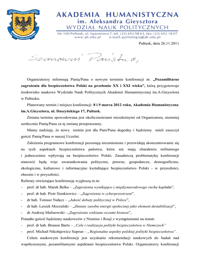 Pułtusk, dnia 26.11.2011 Organizatorzy informują Panią/Pana o nowym terminie konferencji nt. „Pozamilitarne zagrożenia dla bezpieczeństwa Polski na przełomie XX i XXI wieku”, którą przygotowuje środowisko naukowe Wydziału Nauk Politycznych Akademii Humanistycznej im.A.Gieysztora w Pułtusku. Planowany termin i miejsce konferencji: 8 i 9 marca 2012 roku, Akademia Humanistyczna im.A.Gieysztora, ul. Daszyńskiego 17, Pułtusk. Zmiana terminu spowodowana jest okolicznościami niezależnymi od Organizatora, niemniej serdecznie Panią/Pana za tę zmianę przepraszamy. Mamy nadzieję, że nowy termin jest dla Pani/Pana dogodny i będziemy mieli zaszczyt gościć Panią/Pana w naszej Uczelni. Założenia programowe konferencji pozostają niezmienione i przewidują skoncentrowanie się na tych aspektach bezpieczeństwa państwa, które nie mają charakteru militarnego i jednocześnie wpływają na bezpieczeństwo Polski. Zasadniczą problematykę konferencji stanowić będą więc uwarunkowania polityczne, prawne, gospodarcze, demograficzne, ekologiczne, kulturowe i informacyjne kształtujące bezpieczeństwo Polski - w przeszłości, obecnie i w przyszłości. Referaty otwierające konferencję wygłoszą m.in: - prof. dr hab. Marek Belka – „Zagrożenia wynikające z międzynarodowego ruchu kapitału”, - prof. dr hab. Piotr Sienkiewicz – „Zagrożenia w cyberprzestrzeni”. - dr hab. Tomasz Nałęcz – „Jakość debaty politycznej w Polsce”, - dr hab. Leszek Moczulski – „Zmiany zasobu energii społecznej jako element destabilizacji”, - dr Andrzej Malinowski –„Zagrożenia widziane oczami biznesu”, Ponadto gościć będziemy naukowców z Niemiec i Rosji z wystąpieniami na temat: - prof. dr hab. Brunon Bartz – „Cele i realizacja polityki bezpieczeństwa w Niemczech” - prof. Michaił Nikołajewicz Suprun – „Regionalne aspekty polskiej polityki bezpieczeństwa”. Celem naukowym konferencji jest uzyskanie rekomendacji naukowych do badań nad współczesnymi, pozamilitarnymi aspektami bezpieczeństwa Polski. Organizatorzy konferencji zakładają również osiągnięcie celu pragmatycznego, czyli wypracowanie i zintegrowanie wniosków z analizy współczesnych i historycznych, pozamilitarnych aspektów bezpieczeństwa Polski użytecznych w działalności politycznej i administrowaniu, w procesie dydaktycznym w szkole wyższej, w zarządzaniu przedsiębiorczością etc. Konferencja będzie trwała dwa dni, a jej obrady będą prowadzone w ramach 4 paneli tematycznych, poświęconych następującym problemom: Panel 1. Zagrożenia społeczno-polityczne (bezpieczeństwo socjalne, przemiany demograficzne, stan reprezentacji i aktywności politycznej, poziom społeczeństwa obywatelskiego, nadmierne lub niekontrolowane migracje, relacje międzynarodowe, w tym sojusze i koalicje strategiczne i doraźne, rasizm, szowinizm i konflikty religijne i narodowościowe, polityka historyczna, naruszenia prawa, masowe naruszenia porządku publicznego, terroryzm), Panel 2. Zagrożenia ekonomiczne (stan zasobów surowcowych, w tym energetycznych, możliwości produkcyjne, w tym produkcja żywności, skala i właściwości obrotu pieniężnego, europejskie i globalne uwarunkowania bezpieczeństwa ekonomicznego, katastrofy i awarie techniczne, deregulacja obrotu gospodarczego, procesy prywatyzacyjne), Panel 3. Zagrożenia cywilizacyjno-kulturowe (zmiany w tożsamości narodowej, w edukacji i oświacie, w twórczości i ochronie praw autorskich, w wiedzy i badaniach naukowych, w wytwarzaniu i przesyle informacji, stan zdrowia obywateli, epidemie i pandemie,) Panel 4. Zagrożenia klimatyczno-przyrodnicze (zmiany klimatyczne i pogodowe, klęski żywiołowe, degradacja środowiska naturalnego, wymieranie fauny i flory, zmiany w produktywności gleby, zmiany w zalesieniu, zasoby wody pitnej i poziom wód gruntowych). Propozycję uczestnictwa w konferencji kierujemy do środowisk naukowych, polityków i urzędników administracji publicznej, przedstawicieli organizacji pozarządowych i przedsiębiorców. Przewidujemy upowszechnienie wyników konferencji w formie monografii naukowej. Dlatego też, jeśli jest Pani/Pan zainteresowana/zainteresowany udziałem w naszej konferencji to prosimy o wypełnienie załączonej karty zgłoszeniowej i przesłanie na wskazany adres do dnia 15 lutego 2012 r. Pozostałe informacje organizacyjne zawarte zostały w załączniku. Liczymy na uczestnictwo Pani/Pana w naszej Konferencji. Z poważaniem Sekretarz konferencji dr Mirosław Marciniak Informacje organizacyjne Konferencja nt „Pozamilitarne zagrożenia dla bezpieczeństwa Polski na przełomie XX i XX wieku” Pułtusk, 8-9.03.2012r. K o mitet org a nizacyj n y ko nferen cji: prof. dr hab. Tadeusz Panecki - przewodniczący dr Mirosław Marciniak - sekretarz prof. dr hab. Andrzej Skrzypek dr hab. Dariusz Kozerawski dr Dariusz Faszcza dr Andrzej Murawski dr Gabriel Zmarzliński Prze wi dy w a n y pro gr a m: 07.03.2012 - środa - 17.00 – przyjazd i zakwaterowanie uczestników konferencji, - 18.00 – 19.30 – kolacja, 0 8.03.20 1 2 - cz w a rte k - 7.00 – 8.00 – śniadanie, - 8.00 – 8.45 – spra w y organizac yjne, rejestracja uczestnikó w k on ferencji, - 8.45 – 9.00 – wsp ólna foto grafia, - 9.00 – 9.15 – otwarcie konferencji, powitanie Gości, wystąpienie JM Rektora AH im. A.Gieysztora prof. dr. hab. Adama Koseskiego, - 9.15 – 11.00 – posiedzenie plenarne, 3-4 referaty wprowadzające - w problematykę konferencji, - 11.00 – 11.30 – przerwa na kawę, - 11.30 – 14.00 – referaty i dyskusje w grupach panelowych, - 14.00 – 15.00 – obiad - 15.00 – 19.00 – referaty i dyskusje w grupach panelowych, - 19.00 – 21.00 – uroczysta kolacja w Domu Polonii. 09.03.2012 - piątek - 7.00 – 8.00 – śniadanie, - 8.30 – 11.00 – referaty i dyskusje w grupach panelowych, - 11.00 – 11.30 – przerwa na kawę, - 11.30 – 13.30 – posiedzenie plenarne, wystąpie