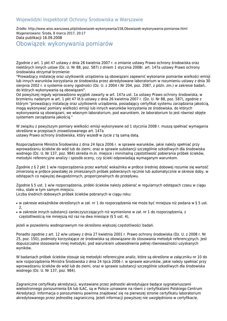 Wojewódzki Inspektorat Ochrony Środowiska w Warszawie Źródło: http://www.wios.warszawa.pl/pl/obowiazek-wykonywania/158,Obowiazek-wykonywania-pomiarow.html Wygenerowano: Środa, 8 marca 2017, 20:17 Data publikacji 16.09.2008 Obowiązek wykonywania pomiarów Zgodnie z art. 1 pkt 47 ustawy z dnia 26 kwietnia 2007 r. o zmianie ustawy Prawo ochrony środowiska oraz niektórych innych ustaw (Dz. U. Nr 88, poz. 587) z dniem 1 stycznia 2008r. art. 147a ustawy Prawo ochrony środowiska otrzymał brzmienie: "Prowadzący instalację oraz użytkownik urządzenia są obowiązani zapewnić wykonanie pomiarów wielkości emisji lub innych warunków korzystania ze środowiska przez akredytowane laboratorium w rozumieniu ustawy z dnia 30 sierpnia 2002 r. o systemie oceny zgodności (Dz. U. z 2004 r.Nr 204, poz. 2087, z późn. zm.) w zakresie badań, do których wykonywania są obowiązani". Od powyższej reguły wprowadzono wyjątek zawarty w art. 147a ust. 1a ustawy Prawo ochrony środowiska, w brzmieniu nadanym w art. 1 pkt 47 lit.b ustawy z dnia 26 kwietnia 2007 r. (Dz. U. Nr 88, poz. 587), zgodnie z którym "prowadzący instalację oraz użytkownik urządzenia, posiadający certyfikat systemu zarządzania jakością, mogą wykonywać pomiary wielkości emisji lub innych warunków korzystania ze środowiska, do których wykonywania są obowiązani, we własnym laboratorium, pod warunkiem, że laboratorium to jest również objęte systemem zarządzania jakością." W związku z powyższym pomiary wielkości emisji wykonywane od 1 stycznia 2008 r. muszą spełniać wymagania określone w przepisach znowelizowanego art. 147a ustawy Prawo ochrony środowiska, który wszedł w życie z tą samą datą. Rozporządzenie Ministra Środowiska z dnia 24 lipca 2006 r. w sprawie warunków, jakie należy spełniać przy wprowadzaniu ścieków do wód lub do ziemi, oraz w sprawie substancji szczególnie szkodliwych dla środowiska wodnego (Dz. U. Nr 137, poz. 984) określa m.in. miejsce i minimalną częstotliwość pobierania próbek ścieków, metodyki referencyjne analizy i sposób oceny, czy ścieki odpowiadają wymaganym warunkom. Zgodnie z § 2 pkt 1 w/w rozporządzenia przez wartość wskaźnika w próbce średniej dobowej rozumie się wartość zmierzoną w próbce powstałej ze zmieszanych próbek pobieranych ręcznie lub automatycznie w okresie doby, w odstępach co najwyżej dwugodzinnych, proporcjonalnych do przepływu. Zgodnie § 5 ust. 1 w/w rozporządzenia, próbki ścieków należy pobierać w regularnych odstępach czasu w ciągu roku, stale w tym samym miejscu. Liczba średnich dobowych próbek ścieków pobranych w ciągu roku: ● ● w zakresie wskaźników określonych w zał. nr 1 do rozporządzenia nie może być mniejsza niż podana w § 5 ust. 2, w zakresie innych substancji zanieczyszczających niż wymienione w zał. nr 1 do rozporządzenia, z częstotliwością nie mniejszą niż raz na dwa miesiące (§ 5 ust. 4), jeżeli w pozwoleniu wodnoprawnym nie określono większej częstotliwości badań. Ponadto zgodnie z art. 12 w/w ustawy z dnia 27 kwietnia 2001 r. Prawo ochrony środowiska (Dz. U. z 2008 r. Nr 25, poz. 150), podmioty korzystające ze środowiska są obowiązane do stosowania metodyk referencyjnych. Jest dopuszczalne stosowanie innej metodyki, pod warunkiem udowodnienia pełnej równoważności uzyskanych wyników. W badaniach próbek ścieków stosuje się metodyki referencyjne analiz, które są określone w załączniku nr 10 do w/w rozporządzenia Ministra Środowiska z dnia 24 lipca 2006 r. w sprawie warunków, jakie należy spełniać przy wprowadzaniu ścieków do wód lub do ziemi, oraz w sprawie substancji szczególnie szkodliwych dla środowiska wodnego (Dz. U. Nr 137, poz. 984). Zagraniczne certyfikaty akredytacji, wystawiane przez jednostki akredytujące będące sygnatariuszami wielostronnego porozumienia EA lub ILAC, są w Polsce uznawane na równi z certyfikatami Polskiego Centrum Akredytacji. Informacja o porozumieniu powinna znajdować się na pierwszej stronie certyfikatu laboratorium akredytowanego przez jednostkę zagraniczną. Jeżeli informacji powyższej nie uwzględniono w certyfikacie, laboratorium musi udowodnić, że jednostka certyfikująca przystąpiła do porozumienia EA lub ILAC. Więcej informacji znajduje się na stronie www.pca.gov.pl Data publikacji 16.09.2008 Data modyfikacji 10.09.2013Rejestr zmian Liczba wizyt: 37251 Autor: Administrator WIOŚ Opublikowane przez Administrator WIOŚ