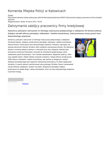 Komenda Miejska Policji w Katowicach Źródło: http://www.katowice.slaska.policja.gov.pl/k14/informacje/wiadomosci/34547,Zatrzymanie-zabojcy-pracownicy-firmy-kredyto wej.html Wygenerowano: Środa, 8 marca 2017, 20:16 Zatrzymanie zabójcy pracownicy firmy kredytowej Katowiccy policjanci zatrzymali 21-letniego mężczyznę podejrzanego o zabójstwo 55-letniej kobiety. Zabójca ukradł ofierze pieniądze, kalkulator i telefon komórkowy. Zatrzymanemu może grozić kara dożywotniego więzienia. Katowiccy policjanci zatrzymali 21-letniego mężczyznę podejrzanego o zabójstwo 55-letniej kobiety. Zabójca ukradł ofierze pieniądze, kalkulator i telefon komórkowy. Zatrzymanemu może grozić kara dożywotniego więzienia. Policjanci zajmujący się sprawą zatrzymali również 18-latka, który wiedział o planowanej zbrodni. Do zdarzenia doszło w minioną sobotę w jednym z mieszkań przy ulicy Załęskiej. Kobieta była pracownicą instytucji finansowej i przyszła do mieszkania podejrzanego celem załatwienia spraw finansowych. Tam została zaatakowana. Napastnik pobił ją i kilka razy ugodził nożem. Zwłoki kobiety schował w łazience. Swojej ofierze ukradł ponad 2000 zlotych, kalkulator i telefon komórkowy. Jak wynika ze wstępnych ustaleń śledztwa prowadzonego pod nadzorem katowickiej prokuratury 21-latek zaplanował zbrodnię. O swoich planach poinformował zatrzymanego 18-latka. Razem zastanawiali się jak dokonać zabójstwa i pozbyć się zwłok. Skradzione pieniądze zabójca przeznaczył na spłatę długu i zakup narkotyków. Grozi mu kara dożywotniego więzienia. Czynności trwają... Ocena: 0/5 (0) Tweetnij