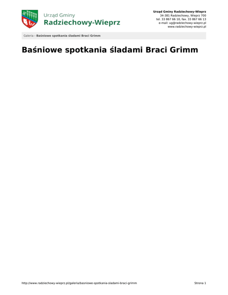 Urząd Gminy Radziechowy-Wieprz 34-381 Radziechowy, Wieprz 700 tel. 33 867 66 10, fax. 33 867 66 13 e-mail: [email protected] www.radziechowy-wieprz.pl Galeria › Baśniowe spotkania śladami Braci Grimm Baśniowe spotkania śladami Braci Grimm http://www.radziechowy-wieprz.pl/galeria/basniowe-spotkania-sladami-braci-grimm Strona 1