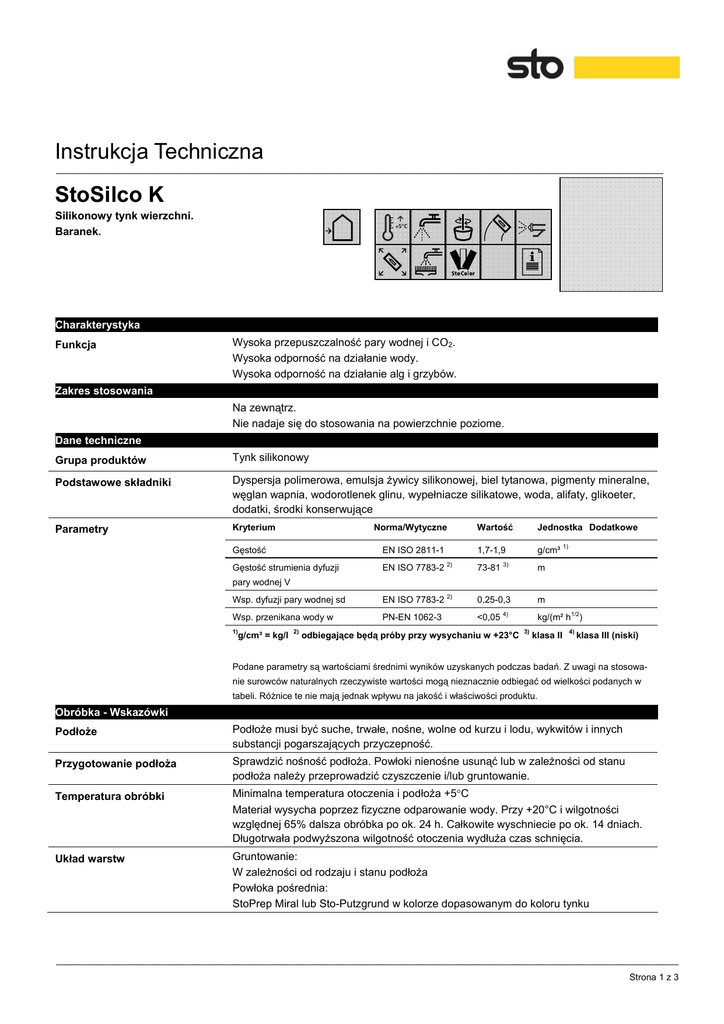 Instrukcja Techniczna _______________________________________________________________________________________________________________________ StoSilco K Silikonowy tynk wierzchni. Baranek. +5°C Charakterystyka Funkcja Wysoka przepuszczalność pary wodnej i CO2. Wysoka odporność na działanie wody. Wysoka odporność na działanie alg i grzybów. Zakres stosowania Na zewnątrz. Nie nadaje się do stosowania na powierzchnie poziome. Dane techniczne Grupa produktów Tynk silikonowy Podstawowe składniki Dyspersja polimerowa, emulsja żywicy silikonowej, biel tytanowa, pigmenty mineralne, węglan wapnia, wodorotlenek glinu, wypełniacze silikatowe, woda, alifaty, glikoeter, dodatki, środki konserwujące Parametry Kryterium Norma/Wytyczne Wartość Jednostka Dodatkowe Gęstość EN ISO 2811-1 1,7-1,9 g/cm³ 1) Gęstość strumienia dyfuzji EN ISO 7783-2 2) 73-81 3) m pary wodnej V Wsp. dyfuzji pary wodnej sd EN ISO 7783-2 2) 0,25-0,3 m Wsp. przenikana wody w PN-EN 1062-3 <0,05 4) kg/(m² h1/2) 1) g/cm³ = kg/l 2) odbiegające będą próby przy wysychaniu w +23°C 3) klasa II 4) klasa III (niski) Podane parametry są wartościami średnimi wyników uzyskanych podczas badań. Z uwagi na stosowanie surowców naturalnych rzeczywiste wartości mogą nieznacznie odbiegać od wielkości podanych w tabeli. Różnice te nie mają jednak wpływu na jakość i właściwości produktu. Obróbka - Wskazówki Podłoże Podłoże musi być suche, trwałe, nośne, wolne od kurzu i lodu, wykwitów i innych substancji pogarszających przyczepność. Przygotowanie podłoża Sprawdzić nośność podłoża. Powłoki nienośne usunąć lub w zależności od stanu podłoża należy przeprowadzić czyszczenie i/lub gruntowanie. Temperatura obróbki Minimalna temperatura otoczenia i podłoża +5°C Materiał wysycha poprzez fizyczne odparowanie wody. Przy +20°C i wilgotności względnej 65% dalsza obróbka po ok. 24 h. Całkowite wyschniecie po ok. 14 dniach. Długotrwała podwyższona wilgotność otoczenia wydłuża czas schnięcia. Układ warstw Gruntowanie: W zależności od rodzaju i stanu podłoża Powłoka pośrednia: StoPrep Miral lub Sto-Putzgrund w kolorze dopasowanym do koloru tynku __________________________________________________________________________________________________________________________ Strona 1 z 3 Instrukcja Techniczna _______________________________________________________________________________________________________________________ StoSilco K Powłoka końcowa: StoSilco K Przygotowanie materiału Uzyskać odpowiednia konsystencję roboczą poprzez ew. dodanie wody. Przed obróbką materiał dokładnie wymieszać. W przypadku obróbki maszynowej każdorazowo ustalić ilość dozowanej wody w zależności od używanej maszyny. Intensywne kolory z reguły wymagają dodania mniejszej ilości wody do uzyskania odpowiedniej konsystencji roboczej. W przypadku zbytniego rozcieńczenia materiał będzie uciążliwy w obróbce i może nie zapewniać odpowiedniego krycia. Zużycie Artykuł Zastosowanie Zużycie ok. 1,0 mm 1,9-2,2 kg/m2 1,5 mm 2,3-2,6 kg/m2 2,0 mm 3,1-3,5 kg/m2 3,0 mm 4,4-4,7 kg/m2 Zużycie zależne jest od podłoża i techniki nanoszenia. Podana wartość jest wielkością orientacyjną. Dokładne wartości zużycia należy ustalić dla danego podłoża. Obróbka StoSilco K nanosić równomiernie na grubość ziarna pacą ze stali nierdzewnej. Strukturowanie przy pomocy pacy z utwardzonego tworzywa lub pacą styropianową. StoSilco K 3,0 mm można strukturować pacą drewnianą. StoSilco K można nanosić mechanicznie przy pomocy pistoletu Sto-Trichterpistole lub dostępnych urządzeń do natrysku tynków drobnoziarnistych. Technika nanoszenia, narzędzia jak również podłoże mogą mieć znaczący wpływ na końcowy rezultat. Czyszczenie narzędzi Wodą natychmiast po użyciu. Forma dostawy Opakowanie Wiadro 25 kg Barwa Biały i w ograniczonym zakresie kolorów systemu StoColor. Przy stosowaniu jako powłoka końcowa w systemach ociepleń należy stosować kolory o współczynniku odbicia rozproszonego > 20%. Przy kolorach o współczynniku odbicia rozproszonego poniżej 20% możliwe jest obiektowe zwolnienie z w/w warunku. W przypadku stosowania jako powłoki końcowej w systemie StoTherm Cell należy stosować kolory o współczynniku odbicia rozproszonego > 25%. W związku ze stosowaniem surowców naturalnych mogą sporadycznie powstawać różnice kolorystyczne wywołane lekko ciemniejszym kruszywem lub niejednorodnością uziarnienia. Nie jest to wada żadna produktu. Przy wysokich obciążeniach mechanicznych na ciemnych, intensywnych kolorach mogą występować miejscowe przebarwienia. Miejsca te oznaczają, że zastosowane w podłożu kruszywo lub pigmenty są jaśniejsze od zastosowanych naturalnych, białych piasków lub naturalnych wypełniaczy. Przebarwienia nie wpływają na jakość i funkcjonalność powłoki. Możliwość zabarwiania Przy użyciu StoColor Tint lub max 1% StoTint Aqua Składowanie Warunki składowania Opakowania muszą być szczelnie zamknięte. Chronić przed mrozem. __________________________________________________________________________________________________________________________ Strona 2 z 3 Instrukcja Techniczna _______________________________________________________________________________________________________________________ StoSilco K Czas składowania Najlepsza jakość w oryginalnym opakowaniu do ... (patrz opakowanie). Data przydatności do użycia zawarta w numerze szarży: pierwsza cyfra oznacza rok, dwie kolejne nr tygodnia kalendarzowego (np.0270052541 oznacza 27 tydzień kalendarzowy 2010 roku). Dodatkowe informacje Bezpieczeństwo Produkt oznaczony zgodnie z wytycznymi UE. Szczegółowe informacje dot. obchodzenia się z materiałem, składowania i usuwania znajdują się w Karcie Charakterystyki Preparatu Niebezpiecznego. GIS-CODE M-SF01 Zastosowania nie wymienione w niniejszej Instrukcji Technicznej należy