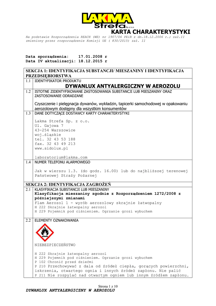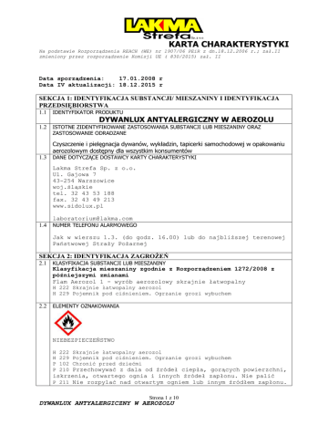 KARTA CHARAKTERYSTYKI Na podstawie Rozporządzenia REACH (WE) nr 1907/06 PEiR z dn.18.12.2006 r.; zał.II zmieniony przez rozporządzenie Komisji UE ( 830/2015) zał. II Data sporządzenia: 17.01.2008 r Data IV aktualizacji: 18.12.2015 r SEKCJA 1: IDENTYFIKACJA SUBSTANCJI/ MIESZANINY I IDENTYFIKACJA PRZEDSIĘBIORSTWA 1.1 IDENTYFIKATOR PRODUKTU DYWANLUX ANTYALERGICZNY W AEROZOLU 1.2 ISTOTNE ZIDENTYFIKOWANE ZASTOSOWANIA SUBSTANCJI LUB MIESZANINY ORAZ ZASTOSOWANIE ODRADZANE Czyszczenie i pielęgnacja dywanów, wykładzin, tapicerki samochodowej w opakowaniu aerozolowym dostępny dla wszystkim konsumentów 1.3 DANE DOTYCZĄCE DOSTAWCY KARTY CHARAKTERYSTYKI Lakma Strefa Sp. z o.o. Ul. Gajowa 7 43-254 Warszowice woj.śląskie tel. 32 43 53 188 fax. 32 43 49 213 www.sidolux.pl [email protected] 1.4 NUMER TELEFONU ALARMOWEGO Jak w wierszu 1.3. (do godz. 16.00) lub do najbliŜszej terenowej Państwowej StraŜy PoŜarnej SEKCJA 2: IDENTYFIKACJA ZAGROśEŃ 2.1 KLASYFIKACJA SUBSTANCJI LUB MIESZANINY Klasyfikacja mieszaniny zgodnie z Rozporządzeniem 1272/2008 z późniejszymi zmianami Flam Aerozol 1 - wyrób aerozolowy skrajnie łatwopalny H 222 Skrajnie łatwopalny aerozol H 229 Pojemnik pod ciśnieniem. Ogrzanie grozi wybuchem 2.2 ELEMENTY OZNAKOWANIA NIEBEZPIECZEŃSTWO H H P P 222 229 102 210 Skrajnie łatwopalny aerozol Pojemnik pod ciśnieniem. Ogrzanie grozi wybuchem Chronić przed dziećmi Przechowywać z dala od źródeł ciepła, gorących powierzchni, iskrzenia, otwartego ognia i innych źródeł zapłonu. Nie palić P 211 Nie rozpylać nad otwartym ogniem lub innym źródłem zapłonu. Strona 1 z 10 DYWANLUX ANTYALERGICZNY W AEROZOLU KARTA CHARAKTERYSTYKI Na podstawie Rozporządzenia REACH (WE) nr 1907/06 PEiR z dn.18.12.2006 r.; zał.II zmieniony przez rozporządzenie Komisji UE ( 830/2015) zał. II P 251 Nie przekłuwać ani nie spalać, nawet po zuŜyciu. P 410+ P412 Chronić przed światłem słonecznym. Nie wystawiać na działanie temperatury przekraczającej 50 °C/122 °F.: Składniki: Dywanlux antyalergiczny o zapachu morskim: < 5% anionowe środki powierzchniowo-czynne, kompozycja zapachowa Dywanlux antyalergiczny o zapachu kwiatowym: < 5% anionowe środki powierzchniowo-czynne, kompozycja zapachowa ( Hexyl Cinnamal) 2.3 INNE ZAGROśENIA Mieszanina nie jest ani PBT ( trwała, ulegająca bioakumulacji) ani vPvB ( bardzo trwała i ulegająca bioakumulacji w duŜym stopniu) SEKCJA 3: SKŁAD/ INFORMACJA O SKŁADNIKACH 3.1 SUBSTANCJE 3.2 MIESZANINY NIEBEZPIECZNE SKŁADNIKI MIESZANINY wg Rozporządzenia (WE) 1272/2008 Nie dotyczy Nazwa substancji/ INCI Nr indeksowy Nr WE name mieszanina gazów płynnych propan-butan- izobutan Nr CAS 100 % mieszanina gazów płynnych propan- butan- izobutan zawiera: Butan 601-004-00-0 203-448-7 106-97-8 Izobutan 601-004-00-0 200-857-2 75-28-5 Propan 601-003-00-5 200-827-9 74-98-6 Alkohol izopropylowy 603-117-00-0 200-661-7 67-63-0 Nr rejestru % wagowy Klasa zagroŜenia Zwroty H ------- 10-15 % Flam gas 1 Press gas H 220 H 280 01211947469132 01211948539527 01211948694421 01211945755825-xxxx 0-100 % Flam gas 1 Press gas H 220 H 280 0-100 % Flam gas 1 Press gas H 220 H 280 0-100 % Flam gas 1 Press gas H 220 H 280 1 -3 % Flam. Liq 2 Eye Irrit. 2 STOT SE 3 H225 H319 H 336 SEKCJA 4: ŚRODKI PIERWSZEJ POMOCY 4.1 Opis środków pierwszej pomocy W przypadku wystąpienia jakichkolwiek niepokojących objawów wezwać natychmiast lekarza lub odwieźć poszkodowanego do szpitala, pokazać kartę charakterystyki, opakowanie produktu lub etykietę. Inhalacja W warunkach normalnych zagroŜenie praktycznie nie istnieje. W warunkach awaryjnych wyprowadzić lub wynieść poszkodowanego na świeŜe powietrze. Kontakt z Przepłukać obficie wodą, jeŜeli podraŜnienie oczu oczami utrzymuje się, skonsultować się ze specjalistą. Kontakt ze Zapobiegawczo umyć wodą z mydłem. W przypadku skórą podraŜnienia skóry skonsultować się z lekarzem. Połknięcie: Wypić 1-2 szklanki wody. W razie potrzeb skontaktować się z lekarzem, pokazać kartę charakterystyki, opakowanie produktu lub etykietę. Nieprzytomnej osobie nigdy nie podawać nic doustnie. 4.2 NAJWAśNIEJSZE OSTRE I OPÓśNIONE OBJAWY ORAZ SKUTKI NARAśENIA Strona 2 z 10 DYWANLUX ANTYALERGICZNY W AEROZOLU KARTA CHARAKTERYSTYKI Na podstawie Rozporządzenia REACH (WE) nr 1907/06 PEiR z dn.18.12.2006 r.; zał.II zmieniony przez rozporządzenie Komisji UE ( 830/2015) zał. II Patrz pkt 11. 4.3 WSKAZANIA DOTYCZĄCE WSZELKIEJ NATYCHMIASTOWEJ POMOCY LEKARSKIEJ I SZCZEGÓLNEGO POSTĘPOWANIA Z POSZKODOWANYM Brak danych SEKCJA 5:POSTĘPOWANIE W PRZYPADKU POśARU 5.1 ŚRODKI GAŚNICZE dwutlenek węgla, proszki gaśnicze, gaśnica pianowa, prądy wodne rozproszone. 5.2 SZCZEGÓLNE ZAGROśENIE ZWIĄZANE Z SUBSTANCJĄ LUB MIESZANINĄ podczas poŜaru powstają niebezpieczne dla zdrowia pary i dymy, które mogą zawierać tlenki węgla, siarki oraz związki organiczne i nieorganiczne. Nie wdychać dymów. 5.3 INFORMACJE DLA STRAśY POśARNEJ: odzieŜ gazoszczelna i aparaty izolujące drogi oddechowe niezaleŜne od otaczającego powietrza. SEKCJA 6: POSTĘPOWANIE W PRZYPADKU NIEZAMIERZONEGO UWOLNIENIA 6.1 INDYWIDUALNE ŚRODKI OSTROśNOŚCI, WYPOSAśENIE OCHRONNE I PROCEDURY W SYTUACJACH AWARYJNYCH Nie dopuszczać osób postronnych i nieupowaŜnionych. Unikać bezpośredniego kontaktu z produktem, zapewnić wentylację, stosować odpowiednie środki ochrony indywidualnej, patrz pkt.8. 6.2 ŚRODKI OSTROśNOŚCI W ZAKRESIE OCHRONY ŚRODOWISKA Zapobiegać zanieczyszczeniu gleby i wody oraz przedostaniu się do kanalizacji, rowów lub rzek. 6.3 6.4 METODY I MATERIAŁY ZAPOBIEGAJĄCE ROZPRZESTRZENIANIU SIĘ SKAśENIA I SŁUśĄCE DO USUWANIA SKAśENIA wchłaniać za pomocą materiałów neutralnych (ziemia, piasek) i umieścić w odpowiednio oznakowanym pojemniku. Oczyścić skaŜony teren. Przekazać do utylizacji. ODNIESIENIE DO INNYCH SEKCJI Informacje dotyczące odpowiedniego sprzętu ochrony osobistej podano w sekcji 8 Inform