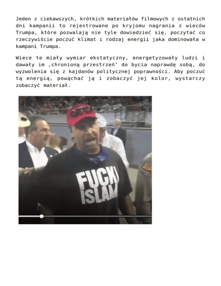 Jeden z ciekawszych, krótkich materiałów filmowych z ostatnich dni kampanii to rejestrowane po kryjomu nagrania z wieców Trumpa, które pozwalają nie tyle dowiedzieć się, poczytać co rzeczywiście poczuć klimat i rodzaj energii jaka dominowała w kampani Trumpa. Wiece te miały wymiar ekstatyczny, energetyzowały ludzi i dawały im ‚chronioną przestrzeń’ do bycia naprawdę sobą, do wyzwolenia się z kajdanów politycznej poprawności. Aby poczuć tą energią, powąchać ją i zobaczyć jej kolor, wystarczy zobaczyć materiał.