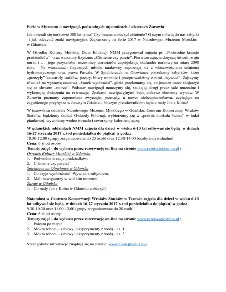 Ferie w Muzeum: o nawigacji, podwodnych tajemnicach i sekretach Żurawia Jak ubierali się nurkowie 300 lat temu? Czy można zobaczyć ciśnienie? O czym mówią do nas zabytki i jak odczytać znaki nawigacyjne. Zapraszamy na ferie 2017 w Narodowym Muzeum Morskim w Gdańsku. W Ośrodku Kultury Morskiej Dział Edukacji NMM przygotował zajęcia pt. „Podwodne kreacje pradziadków” oraz warsztaty fizyczne: „Ciśnienie czy parcie”. Pierwsze zajęcia dotyczą historii stroju nurka i … jego przyszłości: uczestnicy warsztatów zaprojektują skafander nurkowy na miarę 2090 roku. Na warsztatach fizycznych młodzi naukowcy zapoznają się z właściwościami ciśnienia hydrostatycznego oraz prawa Pascala. W Spichlerzach na Ołowiance poszukamy zabytków, które „przeżyły” katastrofy statków, pożary, bitwy morskie i przeprowadzimy z nimi „wywiad”. Zajrzymy również na wystawę czasową „Statek wyobraźni”, gdzie przekonamy się, co jeszcze może skojarzyć się ze słowem „morze”. Podstaw nawigacji nauczymy się, szukając drogi przez sale muzealne i wykonując ćwiczenia na orientację. Znakami nawigacyjnymi będą ciekawe elementy wystaw. W Żurawiu poznamy zapomniane zwyczaje, przesądy, a nawet niebezpieczeństwa, czyhające na zagubionego przybysza w dawnym Gdańsku. Naszym przodownikiem będzie mały Jan z Kolna! W tczewskim oddziale Narodowego Muzeum Morskiego w Gdańsku, Centrum Konserwacji Wraków Statków, będziemy szukać Gwiazdy Polarnej, wybierzemy się w „podróż dookoła świata” w łodzi piankowej, wywołamy wodne tornado i stworzymy kolorową tęczę. W gdańskich oddziałach NMM zajęcia dla dzieci w wieku 6-13 lat odbywać się będą w dniach 16-27 stycznia 2017 r. (od poniedziałku do piątku) w godz.: 10.30-12.00 (grupy zorganizowane do 25 osób) oraz 12.30-14.00 (osoby indywidualne) Cena: 6 zł od osoby Tematy zajęć - do wyboru przez rezerwację on-line na stronie www.rezerwacje.nmm.pl : Ośrodek Kultury Morskiej w Gdańsku 1. Podwodne kreacje pradziadków. 2. Ciśnienie czy parcie? Spichlerze na Ołowiance w Gdańsku 1. Co kryje wyobraźnia? Wywiad z zabytkiem. 2. Mali nawigatorzy w wielkim muzeum. Żuraw w Gdańsku 1. Co mały Jan z Kolna w Gdańsku zobaczył? Natomiast w Centrum Konserwacji Wraków Statków w Tczewie zajęcia dla dzieci w wieku 6-13 lat odbywać się będą w dniach 16-27 stycznia 2017 r. (od poniedziałku do piątku) w godz.: 9.30-10.30 oraz 11.00-12.00 (grupy zorganizowane do 20 osób) Cena: 6 zł od osoby Tematy zajęć - do wyboru przez rezerwację on-line na stronie www.rezerwacje.nmm.pl : 1. Palcem po mapie. 2. Mokra robota – zabawy i eksperymenty z wodą - cz. 1 3. Mokra robota – zabawy i eksperymenty z wodą - cz. 2 Szczegółowe informacje znajdują się na stronie: www.nmm.pl/edukacja