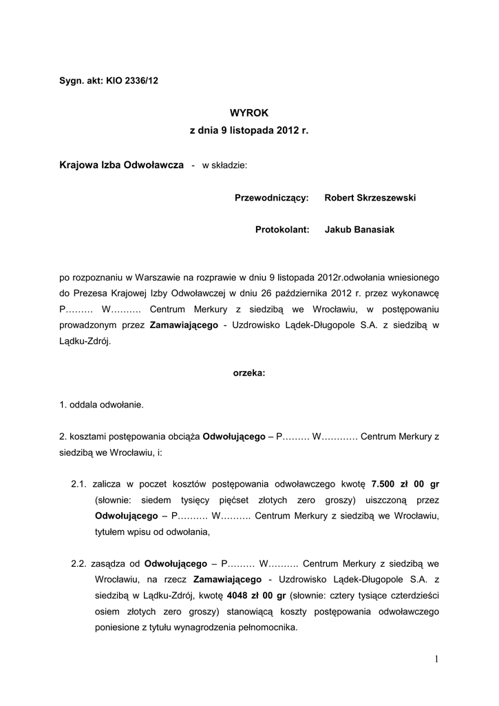 1 WYROK z dnia 9 listopada 2012 r. Krajowa Izba