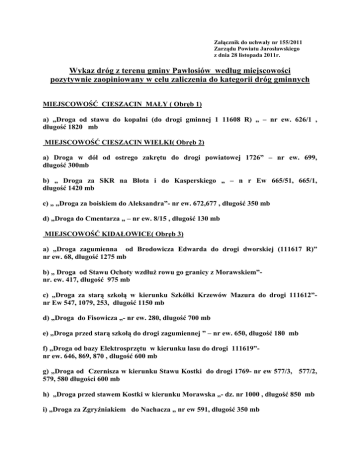 Załącznik do uchwały nr 155/2011 Zarządu Powiatu Jarosławskiego z dnia 28 listopada 2011r. Wykaz dróg z terenu gminy Pawłosiów według miejscowości pozytywnie zaopiniowany w celu zaliczenia do kategorii dróg gminnych MIEJSCOWOŚĆ CIESZACIN MAŁY ( Obręb 1) a) „Droga od stawu do kopalni (do drogi gminnej 1 11608 R) „ – nr ew. 626/1 , długość 1820 mb MIEJSCOWOŚĆ CIESZACIN WIELKI( Obręb 2) a) Droga w dół od ostrego zakrętu do drogi powiatowej 1726” – nr ew. 699, długość 300mb b) „ Droga za SKR na Błota i do Kasperskiego „ – n r Ew 665/51, 665/1, długość 1420 mb c) „ „Droga za boiskiem do Aleksandra”- nr ew. 672,677 , długość 350 mb d) „Droga do Cmentarza „ – nr ew. 8/15 , długość 130 mb MIEJSCOWOŚĆ KIDAŁOWICE( Obręb 3) a) „Droga zagumienna od Brodowicza Edwarda do drogi dworskiej (111617 R)” nr ew. 68, długość 1275 mb b) „ Droga od Stawu Ochoty wzdłuŜ rowu go granicy z Morawskiem”nr. ew. 417, długość 975 mb c) „Droga za starą szkołą w kierunku Szkółki Krzewów Mazura do drogi 111612”nr Ew 547, 1079, 253, długość 1150 mb d) „Droga do Fisowicza „- nr ew. 280, długość 700 mb e) „Droga przed starą szkołą do drogi zagumiennej ” – nr ew. 650, długość 180 mb f) „Droga od bazy Elektrosprzętu w kierunku lasu do drogi 111619”nr ew. 646, 869, 870 , długość 600 mb g) „Droga od Czernisza w kierunku Stawu Kostki do drogi 1769- nr ew 577/3, 577/2, 579, 580 długości 600 mb h) „Droga przed stawem Kostki w kierunku Morawska „- dz. nr 1000 , długość 850 mb i) „Droga za Zgryźniakiem do Nachacza „ nr ew 591, długość 350 mb j) „Droga od Magierskiego w kierunku lasu” – nr Ew. 702, długość 800 mb k) „ Droga I od drogi dworskiej w Kierunku Muniny do granicy Gminy”- nr ew. 298, długość 500 mb l) „ Droga II od drogi dworskiej w Kierunku Muniny do granicy Gminy”- nr ew. 416, długość 775 mb MIEJSCOWOSĆ OśAŃSK( obręb 4) a) „Droga na Stojadła do granicy z Zalesiem”- nr ew. 273/1, 271, 245, długość 1080 mb b) ”Droga od Hotelu Naftowca do Mirocina”-nr ew.277,279 długość 980 mb c) ”Droga od Przekaźnika do drogi powiatowej 1593 przy granicy z Mirocinem”nr ew. 281/1, długość 1270 mb d) „Droga koło Kościoła od drogi powiatowej ( 1726) do drogi gminnej 111601R „ nr ew. 290, długość 155 mb e) „ Droga łącznik do drogi w kierunku lasu ( 111601)” – nr ew. 282/2, długość 300 mb f) „Droga od Barana do drogi gminnej 111601) ”nr ew 293,długość 150 mb g) „ Droga za Kulikowską- łącznik miedzy drogami gminnymi 111607 i 111610 ” nr ew 294/1, długość 660 mb PAWŁOSIÓW ( obręb ) 5 MIEJSCOWOŚĆ WIDNA GÓRA a) „droga od sklepu Grabiona do granicy z miastem Jarosław i do drogi gminnej 111612”- nr Ew. 19/3 , długości 850 mb b) „Droga na Wodociągi”- nr ew. 25/21, długość 800 mb c) „Droga Pańska od Kapinosa w kierunku Pawłosiowa do drogi nr ew. 995”nr ew. 27/2, długość 1225 mb d) „ Droga od ulicy Strzeleckiej koło nr ew. 27/76, długość670 mb Strzelca do drogi Pańskiej( dz. 27/2)” - e) „ Droga od ulicy Strzeleckiej koło Wilusza do drogi Pańskiej( dz. 27/2)” - nr ew. 27/100, długość 725 mb f) „Droga od ulicy Strzeleckiej koło Koprowicza do drogi Pańskiej (dz. 27/2)” nr ew. 27/101, długość 730 mb g) „Droga za lipkami do drogi na Rokietnicę ( 1770)”- nr ew. 681/12, 681/97, długość 1200 mb 2 MIEJSCOWOŚĆ PAWŁOSIÓW h) „ Droga górą od Świętoniowskiego do budynku długość 825 mb 49 ( Kurpiel)”-nr ew. 995, i) ”Droga przed SKR w kierunku Pastwisk wraz z łącznikami do drogi powiatowej przez wieś” „- nr ew.260/14 ,186/4,164/13, 163, 164/18, 165, 164/16, 164/21, długość 900 mb j) droga koło zakładu wulkanizacji- nr ew. 979,96, długość 130 mb k) droga koło budynku nr 12 ( Kądziołka) do drogi gminnej 111611- nr ew. 164/23, długość 100 mb l) droga koło budynku nr 72 ( Trojnar Emila ), sklepu, urzędu gminy w kierunku szkoły- nr ew. 917/5 , długość 370 mb ł) droga w kierunku ciastkarni- nr ew. 1008, 162/1, 162/7 MIEJSCOWOŚĆ MALENISKA m) „Droga za Szkołą Ogrodniczą do ulicy Zbyszka Kopcia w Jarosławiu”- nr ew. 981, 47/11, długość 375 mb n) „Droga za składem Gałuszki do ulicy Szczytniańskiej”- nr ew. 57, 64/12, długość 650 mb o)” Droga koło Fugla kierunku ścieŜek” nr ew.69/12 –długość 950 mb p) „Droga kolo Adama Niemczyckiego” – nr ew. 56 długość 280 mb MIEJSCOWOŚĆ TYWONIA ( Obręb 7) a) ”Droga na Pruchnik od Rząsy długość (650+ 590) 1240 mb do drogi gminnej 111605”- nr ew. 227 228 b) „Droga Pętla od Wańczyckiego w kierunku Wierzbnej i do Kubasa” – nr ew. 223, 222, 84/17, długość 1350 mb MIEJSCOWOŚĆ WIERZBNA ( Obręb 8) a) „Droga od oczyszczalni do drogi powiatowej w kierunku Pełkiń (1722)” nr. ew. 520,521 , długość 550 mb 3