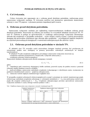 POMIAR IMPEDANCJI PĘTLI ZWARCIA 1. Cel ćwiczenia. Celem ćwiczenia jest zapoznanie się z ochroną przed dotykiem pośrednim, realizowaną przez samoczynne wyłączenie zasilania. W ćwiczeniu możliwe jest pomiarowe sprawdzenie skuteczności ochrony w sieci TN poprzez wykonanie pomiaru impedancji pętli zwarcia. 2. Ochrona przed dotykiem pośrednim. Samoczynne wyłączenie zasilania jest najbardziej rozpowszechnionym środkiem ochrony przed dotykiem pośrednim. Stosowanie tej ochrony jest możliwe we wszystkich układach sieciowych TN, TT oraz IT. Ochrona ta polega na spowodowaniu w szybkiego samoczynnego wyłączenia chronionego obwodu lub urządzenia w przypadku uszkodzeń – zwarć między częścią czynną i częścią przewodzącą dostępną lub przewodem ochronnym tego obwodu albo urządzenia – wywołujących napięcie dotykowe na częściach przewodzących dostępnych o wartościach niebezpiecznych dla zdrowia i życia. 2.1. Ochrona przed dotykiem pośrednim w sieciach TN. W układach sieci TN wszystkie części przewodzące dostępne instalacji powinny być przyłączone do uziemionego punktu sieci zasilającej za pomocą przewodów ochronnych uziemionych na każdym transformatorze. W układach TN jako urządzenia nadprądowe powodujące samoczynne wyłączenie stosowane są: – urządzenia ochronne przetężeniowe ( bezpiecznik, wyłącznik samoczynny ), – urządzenia ochronne różnicowoprądowe. Skuteczność działania zabezpieczenia określa następujący warunek: Zs × Ia ≤ Uo , (6.1) gdzie: Zs – impedancja pętli zwarciowej obejmującej źródło zasilania, przewód czynny do punktu zwarcia i przewód ochronny między punktem zwarcia a źródłem, Ia – prąd powodujący samoczynne zadziałanie urządzenia wyłączającego w określonym czasie, wyznaczony na podstawie charakterystyki czasowo – prądowej zabezpieczenia, Uo – skuteczna wartość napięcia znamionowego względem sieci. W przypadku urządzeń ochronnych różnicowoprądowych za prąd Ia przyjmuje się wartość znamionowego prądu różnicowego zadziałania urządzenia ochronnego w wykonaniu normalnym Ia = I∆N oraz podwojoną wartość tego prądu dla urządzeń selektywnych Ia = 2I∆N. Urządzenie zabezpieczające powinno spowodować samoczynne wyłączenie zasilania w czasie, którego wartości podano w tab.1. Tab. 1 Najdłuższe dopuszczalne czasy wyłączenia w sieciach i instalacjach typu TN Napięcie znamionowe Najdłuższe dopuszczalne czasy wyłączenia względem ziemi Uo [s] [V] 50 V~, 120 V25 V~, 60 V120 0,8 0,35 230 0,4 0,20 277 0,4 0,20 400 0,2 0,05 480 0,1 0,05 0,02 580 0,1 Dotyczy urządzeń odbiorczych I klasy ochronności ręcznych lub przenośnych, przeznaczonych do ręcznego przemieszczania w czasie użytkowania 2.2. Ochrona przed dotykiem pośrednim w sieciach TT. W układzie TT punkt neutralny sieci powinien być uziemiony w każdej stacji transformatorowej. Niezależnie od uziemienia punktu neutralnego sieci wymaga się bezpośredniego połączenia z ziemią podlegających ochronie dostępnych części przewodzących. Części przewodzące jednocześnie dostępne powinny być przyłączone do tego samego uziemienia indywidualnie, grupowo lub zespołowo. W układzie TT mogą być stosowane następujące urządzenia ochronne: - urządzenia ochronne różnicowoprądowe, - urządzenia ochronne przetężeniowe. Działanie tych urządzeń uznaje się za skuteczne wówczas, gdy spełniony jest następujący warunek: R A × I a ≤ 50 V (2) gdzie: RA – suma rezystancji uziomu i przewodu ochronnego części przewodzących dostępnych, Ia – prąd powodujący samoczynne zadziałanie urządzenia ochronnego. Jeżeli urządzeniem ochronnym jest wyłącznik różnicowoprądowy Ia jest znamionowych prądem różnicowym zadziałania I N. Jeżeli natomiast urządzeniem ochronnym jest urządzenie o zależnej charakterystyce czasowo - prądowej prąd Ia powinien być prądem zapewniającym samoczynne zadziałanie w czasie nie dłuższym niż 5 s. Dla urządzenia z działaniem natychmiastowym prąd Ia powinien być minimalnym prądem zapewniającym natychmiastowe wyłączenie. 3. Pomiar impedancji pętli zwarcia. Pomiar impedancji pętli zwarciowej jest podstawowym pomiarem kontrolującym poprawność działania ochrony przeciwporażeniowej przez samoczynne wyłączenie zasilania. Wyróżnia się następujące metody pomiaru impedancji pętli zwarcia: - metoda techniczna, - metoda z zastosowaniem specjalistycznych mierników, np. typu MZC-2, MZC-300 Pomiaru impedancji pętli zwarcia w tych metodach dokonuje się przez wykonanie celowego zwarcia pomiarowego podczas normalnej pracy badanego urządzenia. Pomiar metodą techniczną wykonuje się za pomocą woltomierza i amperomierza (rys.1). Rys.1. Pomiar impedancji pętli zwarcia metodą techniczną. 2 Badanie polega na dwukrotnym pomiarze napięcia: U1– przed zwarciem, U2– podczas sztucznego zwarcia przez rezystor R, które wymusza przepływ prądu zwarciowego I2. Różnica wskazań woltomierza U1 – U2 to spadek napięcia na rezystancji pętli zwarcia wywołany przepływem prądu sztucznego zwarcia. Rezystancję pętli zwarcia możemy wyznaczyć z zależności: Rs = ∆U I2 (3) Jeżeli rezystancja badanego obwodu jest duża w stosunku do reaktancji (w obwodach odbiorczych gdzie w skład pętli zwarcia zalicza się przewody i kable), można uznać, że impedancja pętli zwarcia Zs równa jest wartości zmierzonej rezystancji. Jeżeli natomiast nie można pominąć wpływu reaktancji Xs na wartość impedancji Zs (np. elementami pętli zwarcia są linie napowietrzne lub pomiar odbywa się w pobliżu stacji o dużym udziale impedancji transformatora ) to wykonuje się dodatkowo celowe zwarcie za pomocą dławika lub kondensatora o impedancji X2 . Wówczas: Xs = U x1 − U x 2 ∆U x = I x2 I x2 (4) Impedancję pętli zwarcia wyznacza się wówczas ze wzoru: Z s = Rs2 + X s2 (5) W praktyce, w instalacjach niskiego napięcia składow
