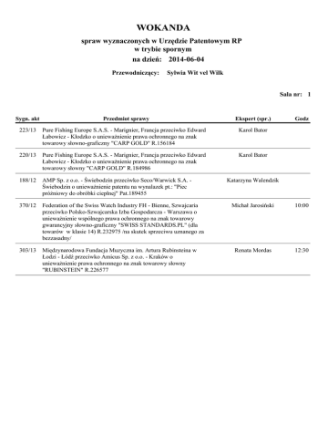WOKANDA spraw wyznaczonych w Urzędzie Patentowym RP w trybie spornym na dzień: 2014-06-04 Przewodniczący: Sylwia Wit vel Wilk Sala nr: 1 Sygn. akt Przedmiot sprawy Ekspert (spr.) 223/13 Pure Fishing Europe S.A.S. - Marignier, Francja przeciwko Edward Łabowicz - Kłodzko o unieważnienie prawa ochronnego na znak towarowy słowno-graficzny "CARP GOLD" R.156184 Karol Bator 220/13 Pure Fishing Europe S.A.S. - Marignier, Francja przeciwko Edward Łabowicz - Kłodzko o unieważnienie prawa ochronnego na znak towarowy słowny "CARP GOLD" R.184986 Karol Bator 188/12 AMP Sp. z o.o. - Świebodzin przeciwko Seco/Warwick S.A. Świebodzin o unieważnienie patentu na wynalazek pt.: "Piec próżniowy do obróbki cieplnej" Pat.189455 370/12 Federation of the Swiss Watch Industry FH - Bienne, Szwajcaria przeciwko Polsko-Szwajcarska Izba Gospodarcza - Warszawa o unieważnienie wspólnego prawa ochronnego na znak towarowy gwarancyjny słowno-graficzny "SWISS STANDARDS.PL" (dla towarów w klasie 14) R.232975 /na skutek sprzeciwu uznanego za bezzasadny/ 303/13 Międzynarodowa Fundacja Muzyczna im. Artura Rubinsteina w Łodzi - Łódź przeciwko Amicus Sp. z o.o. - Kraków o unieważnienie prawa ochronnego na znak towarowy słowny "RUBINSTEIN" R.226577 Godz Katarzyna Walendzik Michał Jarosiński 10:00 Renata Mordas 12:30