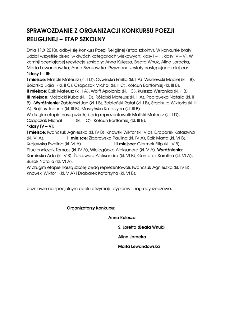 SPRAWOZDANIE Z ORGANIZACJI KONKURSU POEZJI RELIGIJNEJ – ETAP SZKOLNY Dnia 11.X.2010r. odbył się Konkurs Poezji Religijnej (etap szkolny). W konkursie brały udział wszystkie dzieci w dwóch kategoriach wiekowych: klasy I – III, klasy IV – VI. W komisji oceniającej recytacje zasiadły: Anna Kulesza, Beata Wnuk, Alina Jarocka, Marta Lewandowska, Anna Brzozowska. Przyznane zostały następujące miejsca: *klasy I – III: I miejsce: Malicki Mateusz (kl. I D), Cywińska Emilia (kl. I A), Wiśniewski Maciej (kl. I B), Bojarska Lidia (kl. II C), Czapczak Michał (kl. II C), Kołcun Bartłomiej (kl. III B). II miejsce: Dzik Mateusz (kl. I A), Wolff Apolonia (kl. I C), Kulesza Weronika (kl. II B). III miejsce: Mościcki Kuba (kl. I D), RóŜalski Mateusz (kl. II A), Popławska Natalia (kl. II B). -WyróŜnienie: Zabłoński Jan (kl. I B), Zabłoński Rafał (kl. I B), Stachura Wiktoria (kl. III A), Bajbus Joanna (kl. III B), Moszyńska Katarzyna (kl. III B). W drugim etapie naszą szkołę będą reprezentowali: Malicki Mateusz (kl. I D), Czapczak Michał (kl. II C) i Kołcun Bartłomiej (kl. III B). *klasy IV – VI: I miejsce: Iwańczuk Agnieszka (kl. IV B), Knowski Wiktor (kl. V a), Drabarek Katarzyna (kl. VI A). II miejsce: Ziąbrowska Paulina (kl. IV A), Dzik Marta (kl. VI B), Krajewska Ewelina (kl. VI A). III miejsce: Giermek Filip (kl. IV B), Płucienniczak Tomasz (kl. IV A), Wielogórska Aleksandra (kl. V A). WyróŜnienia: Kamińska Ada (kl. V S), śółkowska Aleksandra (kl. VI B), Gontarek Karolina (kl. VI A), Buzak Natalia (kl. VI A). W drugim etapie naszą szkołę będą reprezentowali: Iwańczuk Agnieszka (kl. IV B), Knowski Wiktor (kl. V A) i Drabarek Katarzyna (kl. VI B). Uczniowie na specjalnym apelu otrzymają dyplomy i nagrody rzeczowe. Organizatorzy konkursu: Anna Kulesza S. Loretta (Beata Wnuk) Alina Jarocka Marta Lewandowska