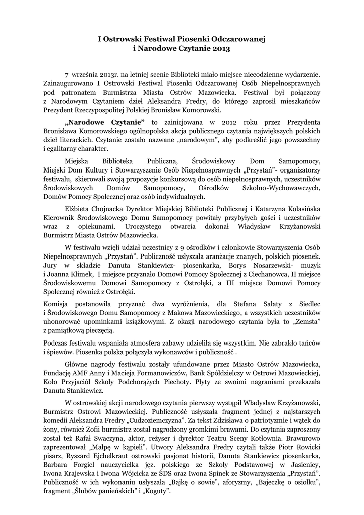 I Ostrowski Festiwal Piosenki Odczarowanej i Narodowe Czytanie 2013 7 września 2013r. na letniej scenie Biblioteki miało miejsce niecodzienne wydarzenie. Zainaugurowano I Ostrowski Festiwal Piosenki Odczarowanej Osób Niepełnosprawnych pod patronatem Burmistrza Miasta Ostrów Mazowiecka. Festiwal był połączony z Narodowym Czytaniem dzieł Aleksandra Fredry, do którego zaprosił mieszkańców Prezydent Rzeczypospolitej Polskiej Bronisław Komorowski. „Narodowe Czytanie” to zainicjowana w 2012 roku przez Prezydenta Bronisława Komorowskiego ogólnopolska akcja publicznego czytania największych polskich dzieł literackich. Czytanie zostało nazwane „narodowym”, aby podkreślić jego powszechny i egalitarny charakter. Miejska Biblioteka Publiczna, Środowiskowy Dom Samopomocy, Miejski Dom Kultury i Stowarzyszenie Osób Niepełnosprawnych „Przystań”- organizatorzy festiwalu, skierowali swoją propozycje konkursową do osób niepełnosprawnych, uczestników Środowiskowych Domów Samopomocy, Ośrodków Szkolno-Wychowawczych, Domów Pomocy Społecznej oraz osób indywidualnych. Elżbieta Chojnacka Dyrektor Miejskiej Biblioteki Publicznej i Katarzyna Kolasińska Kierownik Środowiskowego Domu Samopomocy powitały przybyłych gości i uczestników wraz z opiekunami. Uroczystego otwarcia dokonał Władysław Krzyżanowski Burmistrz Miasta Ostrów Mazowiecka. W festiwalu wzięli udział uczestnicy z 9 ośrodków i członkowie Stowarzyszenia Osób Niepełnosprawnych „Przystań”. Publiczność usłyszała aranżacje znanych, polskich piosenek. Jury w składzie Danuta Stankiewicz- piosenkarka, Borys Nosarzewski- muzyk i Joanna Klimek, I miejsce przyznało Domowi Pomocy Społecznej z Ciechanowca, II miejsce Środowiskowemu Domowi Samopomocy z Ostrołęki, a III miejsce Domowi Pomocy Społecznej również z Ostrołęki. Komisja postanowiła przyznać dwa wyróżnienia, dla Stefana Sałaty z Siedlec i Środowiskowego Domu Samopomocy z Makowa Mazowieckiego, a wszystkich uczestników uhonorować upominkami książkowymi. Z okazji narodowego czytania była to „Zemsta” z pamiątkową pieczęcią. Podczas festiwalu wspaniała atmosfera zabawy udzieliła się wszystkim. Nie zabrakło tańców i śpiewów. Piosenka polska połączyła wykonawców i publiczność . Główne nagrody festiwalu zostały ufundowane przez Miasto Ostrów Mazowiecka, Fundację AMF Anny i Macieja Formanowiczów, Bank Spółdzielczy w Ostrowi Mazowieckiej, Koło Przyjaciół Szkoły Podchorążych Piechoty. Płyty ze swoimi nagraniami przekazała Danuta Stankiewicz. W ostrowskiej akcji narodowego czytania pierwszy wystąpił Władysław Krzyżanowski, Burmistrz Ostrowi Mazowieckiej. Publiczność usłyszała fragment jednej z najstarszych komedii Aleksandra Fredry „Cudzoziemczyzna”. Za tekst Zdzisława o patriotyzmie i wątek do żony, również Zofii burmistrz został nagrodzony gromkimi brawami. Do czytania zaproszony został też Rafał Swaczyna, aktor, reżyser i dyrektor Teatru Sceny Kotłownia. Brawurowo zaprezentował „Małpę w kąpieli”. Utwory Aleksandra Fredry czytali także Piotr Rowicki pisarz, Ryszard Ejchelkraut ostrowski pasjonat historii, Danuta Stankiewicz piosenkarka, Barbara Forgiel nauczycielka jęz. polskiego ze Szkoły Podstawowej w Jasienicy, Iwona Krajewska i Iwona Wójcicka ze ŚDS oraz Iwona Spinek ze Stowarzyszenia „Przystań”. Publiczność w ich wykonaniu usłyszała „Bajkę o sowie”, aforyzmy, „Bajeczkę o osiołku”, fragment „Ślubów panieńskich” i „Koguty”. Wspólnie przeczytano „Pawła i Gawła”, a młodzież z Gimnazjum Publicznego Nr 3 w Ostrowi Mazowieckiej wystawiła fragment „Zemsty”. W sztuce role zagrali: Joanna Brzostek- Cześnik, Michalina Tarasiuk- Papkin z kl. III c, Kamil Kisło- Rejent, Magdalena Kuczyńska- Wacław, Natalia Rafeenko- Podstolina, Aleksandra Więcław- Klara, Joanna Małyszko- Dyndalski, Julia Łukaszewska- Śmigalski z kl. III a. Młodzi artyści przygotowali się do występu pod bacznym okiem swojej polonistki Pani Marii Lewickiej. Zwieńczeniem Festiwalu i Narodowego Czytania 2013, był recital „Moje piosenki”, w wykonaniu Danuty Stankiewicz. Piosenkarka zaśpiewała swoje najsłynniejsze przeboje, zapraszając do tańca gości i uczestników. Pierwsza edycja Ostrowskiego Festiwalu Piosenki Odczarowanej spotkała się z dużym zainteresowaniem. Cieszy to organizatorów. Wystąpili wspaniali uczestnicy i dopisała publiczność. Dzięki połączeniu z akcją Narodowego Czytania słowo mówione i śpiewane miało okazję być słyszane. Dziękujemy Państwu i zapraszamy za rok.