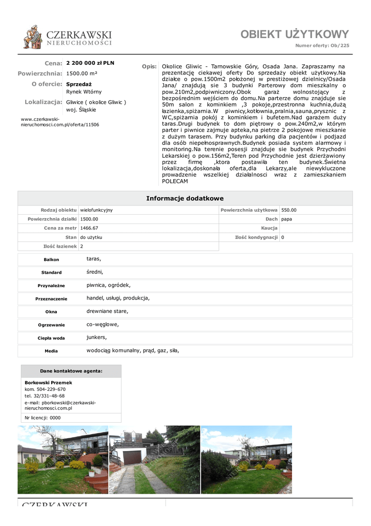 OBIEKT UŻYTKOWY Numer oferty: Ob/225 Cena: 2 200 000 zł PLN Powierzchnia: 1500.00 m² O ofercie: Sprzedaż Rynek Wtórny Lokalizacja: Gliwice ( okolice Gliwic ) woj. Śląskie www.czerkawskinieruchomosci.com.pl/oferta/11506 Opis: Okolice Gliwic - Tarnowskie Góry, Osada Jana. Zapraszamy na prezentację ciekawej oferty Do sprzedaży obiekt użytkowy.Na działce o pow.1500m2 położonej w prestiżowej dzielnicy/Osada Jana/ znajdują sie 3 budynki Parterowy dom mieszkalny o pow.210m2,podpiwniczony.Obok garaż wolnostojący z bezpośrednim wejściem do domu.Na parterze domu znajduje sie 50m salon z kominkiem ,3 pokoje,przestronna kuchnia,dużą łazienka,spiżarnia.W piwnicy,kotłownia,pralnia,sauna,prysznic z WC,spiżarnia pokój z kominkiem i bufetem.Nad garażem duży taras.Drugi budynek to dom piętrowy o pow.240m2,w którym parter i piwnice zajmuje apteka,na pietrze 2 pokojowe mieszkanie z dużym tarasem. Przy budynku parking dla pacjentów i podjazd dla osób niepełnosprawnych.Budynek posiada system alarmowy i monitoring.Na terenie posesji znajduje sie budynek Przychodni Lekarskiej o pow.156m2,Teren pod Przychodnie jest dzierżawiony przez firmę ,ktora postawiła ten budynek.Świetna lokalizacja,doskonała oferta,dla Lekarzy,ale niewykluczone prowadzenie wszelkiej działalnosci wraz z zamieszkaniem POLECAM Informacje dodatkowe Rodzaj obiektu wielofunkcyjny Powierzchnia działki 1500.00 Cena za metr 1466.67 Stan do użytku Ilość łazienek 2 Balkon taras, Standard średni, Przynależne Przeznaczenie Okna piwnica, ogródek, handel, usługi, produkcja, drewniane stare, Ogrzewanie co-węglowe, Ciepła woda junkers, Media wodociąg komunalny, prąd, gaz, siła, Dane kontaktowe agenta: Borkowski Przemek kom. 504-229-670 tel. 32/331-48-68 e-mail: [email protected] Nr licencji: 0000 Powierzchnia użytkowa 550.00 Dach papa Kaucja Ilość kondygnacji 0 www.czerkawski-nieruchomosci.com.pl