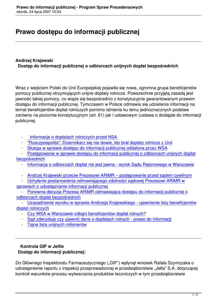 Prawo do informacji publicznej - Program Spraw Precedensowych wtorek, 24 lipca 2007 10:53 Prawo dostępu do informacji publicznej Andrzej Krajewski Dostęp do informacji publicznej o odbiorcach unijnych dopłat bezpośrednich Wraz z wejściem Polski do Unii Europejskiej pojawiła się nowa, ogromna grupa beneficjentów pomocy publicznej otrzymujących unijne dopłaty rolnicze. Powszechnie przyjętą zasadą jest jawność takiej pomocy, co wiąże się bezpośrednio z konstytucyjnie gwarantowanym prawem dostępu do informacji publicznej. Tymczasem w Polsce odmawia się udzielenia informacji na temat beneficjentów dopłat rolniczych pomimo istnienia ku temu jednoznacznych podstaw zarówno na poziomie konstytucyjnym (art. 61) jak i ustawowym (ustawa o dostępie do informacji publicznej. Informacje o dopłatach rolniczych przed NSA - "Rzeczpospolita": Dziennikarz się nie dowie, kto brał dopłaty rolnicze z Unii - Skarga w sprawie dostępu do informacji publicznej oddalona przez WSA - Postępowanie w sprawie dostępu do informacji publicznej o odbiorcach unijnych dopłat bezpośrednich - Informacja o odbiorcach dopłat nie jest jawna - wyrok Sądu Rejonowego w Warszawie - Andrzej Krajewski przeciw Prezesowi ARiMR – postępowanie przed sądem cywilnym - Uchylenie postanowienia odmawiającego zdolności sądowej Prezesowi ARiMR w sprawach o udostępnianie informacji publicznej - Ponowna decyzja Prezesa ARiMR odmawiająca dostępu do informacji publicznej o odbiorcach dopłat bezpośrednich - Uzasadnienie wyroku w sprawie Andrzeja Krajewskiego - ujawnienie listy beneficjentów dopłat rolniczych - Czy WSA w Warszawie odtajni beneficjentów dopłat rolnych? - Sąd zdecyduje czy ujawnić dane o dopłatach rolnych - prawo do informacji - Tajna lista unijnych milionerów Kontrola GIF w Jelfie Dostęp do informacji publicznej Do Głównego Inspektoratu Farmaceutycznego („GIF”) wpłynął wniosek Rafała Szymczaka o udostępnienie raportu z inspekcji przeprowadzonej w przedsiębiorstwie „Jelfa” S.A. dotyczącej kontroli warunków procesu wytwarzania produktów leczniczych w tym przedsiębiorstwie 1/3 Prawo do informacji publicznej - Program Spraw Precedensowych wtorek, 24 lipca 2007 10:53 (sprawa była przedmiotem dużego zainteresowania mediów). GIF wydał decyzję odmawiającą udostępnienia informacji publicznej, jako informacji zawierającej tajemnicę przedsiębiorcy. Raport zdaniem GIF zawiera istotne informacje technologiczne, organizacyjne „Jelfy” a także inne informacje posiadające wartość gospodarczą i jako takie w świetle art. 5§2 ustawy o dostępie do informacji publicznej, stanowią tajemnicę przedsiębiorstwa. Ponadto GIF stwierdził, że przepisy obowiązującego prawa nie przewidują dla organu nadzoru farmaceutycznego obowiązku upublicznienia raportu pokontrolnego. Rafał Szymczak złożył wniosek o ponowne rozpatrzenie sprawy, w którym podnosił, że raport z inspekcji przeprowadzonej w „Jelfie” stosownie do Ustawy stanowi informację publiczną i jako taki podlega udostępnieniu przez GIF. Udostępnienie tej informacji jest ponadto uzasadnione ważnym interesem publicznym. GIF ponadto jest władny udostępnić raport z części, która nie stanowi tajemnicy przedsiębiorstwa. W uzasadnieniu decyzji o odmowie uwzględnienia wniosku, GIF powtarza argumentację z wcześniejszej decyzji. W marcu 2007 r. została wniesiona skarga na decyzję GIF do WSA w Warszawie. Postępowanie przed WSA zostało umorzone ze względu na niewłaściwość sądu administracyjnego w tej sprawie. Obecnie sprawa toczy się przed Sądem Rejonowym dla Warszawy Śródmieścia. W sprawie przedstawiliśmy opinię przyjaciela sądu, którą można znaleźć tutaj. - Opinia przyjaciela sądu w sprawie Rafała Szymczaka - dostęp do informacji publicznej - Dostęp do informacji publicznej – wyrok Sądu Okręgowego w Warszawie Rzeczpospolita: Informacja publiczna a tajemnica przedsiębiorcy Stowarzyszenie "Przychodnia" Dostęp do informacji publicznej na temat treści obrad KRRiTV P. Dobrowolski wystąpił w imieniu Stowarzyszenia „Przychodnia” do Krajowej Rady Radiofonii i Telewizji o udzielenie mu informacji, dotyczącej treści (przebiegu) obrad Krajowej Rady Radiofonii i Telewizji podczas posiedzenia w dniu 20 kwietnia 2006 roku, dotyczących złożonego przez Stowarzyszenie „Przychodnia” wniosku do Komisji Europejskiej o uznanie ustawy o opłatach abonamentowych 2/3 Prawo do informacji publicznej - Program Spraw Precedensowych wtorek, 24 lipca 2007 10:53 za sprzeczną z prawem. Wniósł o wyrażenie zgody na przeglądanie akt i wydanie mu protokołu z posiedzenia. W pismie z 8 marca KRRiTV odpowiedziała odmownie na wniosek. Jako uzasadnienie podano, że żądane informacje nie stanowią dokumentu urzędowego, a KRRiTV nie jest ciałem kolegialnym pochodzącym z wyboru powszechnego. P. Dobrowolski wystąpił z ponownym wnioskiem. W odpowiedzi z dnia 27 kwietnia 2007 r. Przewodnicząca KRRiTV odmawiając dostępu do protokołu z posiedzenia KRRiTV stwierdziła, że "sama dyskusja, a więc wypowiedzi członków KKRiTV oraz pracowników KRRiTV ujęte w stenogramie z posiedzenia KRRiTV nie stanowią informacji publicznej". Na ponowną decyzję KRRiTV P. Dobrowolski wniósł w dniu 30 maja 2007 r. skargę do WSA w Warszawie. HFPC rozważa przystąpienie do postępowania przed WSA w charakterze organizacji społecznej. Joomla SEF URLs by Artio 3/3