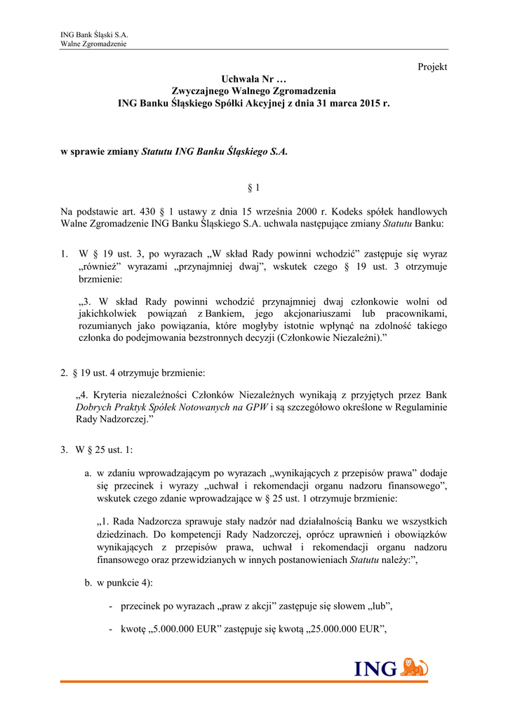 ING Bank Śląski S.A. Walne Zgromadzenie Projekt Uchwała Nr … Zwyczajnego Walnego Zgromadzenia ING Banku Śląskiego Spółki Akcyjnej z dnia 31 marca 2015 r. w sprawie zmiany Statutu ING Banku Śląskiego S.A. §1 Na podstawie art. 430 § 1 ustawy z dnia 15 września 2000 r. Kodeks spółek handlowych Walne Zgromadzenie ING Banku Śląskiego S.A. uchwala następujące zmiany Statutu Banku: 1. W § 19 ust. 3, po wyrazach „W skład Rady powinni wchodzić” zastępuje się wyraz „również” wyrazami „przynajmniej dwaj”, wskutek czego § 19 ust. 3 otrzymuje brzmienie: „3. W skład Rady powinni wchodzić przynajmniej dwaj członkowie wolni od jakichkolwiek powiązań z Bankiem, jego akcjonariuszami lub pracownikami, rozumianych jako powiązania, które mogłyby istotnie wpłynąć na zdolność takiego członka do podejmowania bezstronnych decyzji (Członkowie Niezależni).” 2. § 19 ust. 4 otrzymuje brzmienie: „4. Kryteria niezależności Członków Niezależnych wynikają z przyjętych przez Bank Dobrych Praktyk Spółek Notowanych na GPW i są szczegółowo określone w Regulaminie Rady Nadzorczej.” 3. W § 25 ust. 1: a. w zdaniu wprowadzającym po wyrazach „wynikających z przepisów prawa” dodaje się przecinek i wyrazy „uchwał i rekomendacji organu nadzoru finansowego”, wskutek czego zdanie wprowadzające w § 25 ust. 1 otrzymuje brzmienie: „1. Rada Nadzorcza sprawuje stały nadzór nad działalnością Banku we wszystkich dziedzinach. Do kompetencji Rady Nadzorczej, oprócz uprawnień i obowiązków wynikających z przepisów prawa, uchwał i rekomendacji organu nadzoru finansowego oraz przewidzianych w innych postanowieniach Statutu należy:”, b. w punkcie 4): - przecinek po wyrazach „praw z akcji” zastępuje się słowem „lub”, - kwotę „5.000.000 EUR” zastępuje się kwotą „25.000.000 EUR”, ING Bank Śląski S.A. Walne Zgromadzenie - po słowach „aktywów stanowiących co najmniej” zastępuje się wartość „20%” wartością „50%”, - po wyrazach „zgoda Rady” skreśla się wyrazy „- z zastrzeżeniem postanowień ust. 2 - ” wskutek czego, §25 ust. 1 pkt 4) otrzymuje brzmienie: „4) wyrażanie zgody na nabycie lub zbycie przez Bank akcji i praw z akcji lub udziałów innych osób prawnych, o ile wartość aktywów przekracza jednorazowo równowartość w złotych polskich kwoty 25.000.000 EUR lub czynność dotyczy aktywów stanowiących co najmniej 50% kapitału zakładowego innej osoby prawnej; zgoda Rady nie jest wymagana w przypadku zaangażowania Banku wynikającego z zamiany wierzytelności, realizacji przyjętego przez Bank zabezpieczenia lub usługi underwritingowej,” , c. w punkcie 8), po wyrazach „na podstawie rekomendacji Komitetu Audytu Rady” dodaje się wyrazy „oraz wyrażania opinii w sprawie rozwiązania umowy z tym podmiotem”, wskutek czego §25 ust. 1 pkt 8) otrzymuje brzmienie: „8) dokonywanie wyboru podmiotu uprawnionego do badania sprawozdania finansowego Banku, na podstawie rekomendacji Komitetu Audytu Rady oraz wyrażanie opinii w sprawie rozwiązania umowy z tym podmiotem,”, d. punkt 10) otrzymuje brzmienie: „10) wyrażanie zgody na zaciągnięcie przez Bank zobowiązania lub podjęcie czynności rozporządzającej, której wartość jednorazowo lub łącznie w stosunku do jednego podmiotu lub podmiotów powiązanych z tym podmiotem przekracza 10% funduszy własnych Banku, z zastrzeżeniem postanowień pkt 4) i 11),”, e. w punkcie 11) kwotę „5.000.000 EUR” zastępuje się kwotą „25.000.000 EUR”, a po wyrazach „z zastrzeżeniem postanowień” zastępuje się odesłanie do „ust. 2” odesłaniem do „pkt 10”, wskutek czego §25 ust. 1 pkt 11) otrzymuje brzmienie: „11) wyrażanie zgody na nabycie, zbycie lub obciążenie przez Bank środka trwałego, którego wartość przekracza równowartość w złotych polskich kwoty 25.000.000 EUR; zgoda Rady – z zastrzeżeniem postanowień pkt 10 – nie jest wymagana w przypadku, gdy nabycie środka trwałego następuje w drodze przejęcia takiego środka przez Bank jako wierzyciela wskutek windykacji należności Banku,”, f. punkt 12 otrzymuje brzmienie: „12) przedstawianie zwyczajnemu Walnemu Zgromadzeniu sprawozdań i ocen określonych w przepisach, rekomendacjach organu nadzoru oraz w innych regulacjach przyjętych przez Bank,”, g. skreśla się zdanie ostatnie, rozpoczynające się od wyrazów: „Użyte w statucie pojęcia...”. ING Bank Śląski S.A. Walne Zgromadzenie 4. § 25 ust. 2 otrzymuje brzmienie: „2. Do kompetencji Rady Nadzorczej należy także wydawanie opinii dotyczących zawarcia umów z podmiotami powiązanymi z Bankiem, w rozumieniu przepisów dotyczących obowiązków informacyjnych spółek publicznych, których przedmiotem jest zaciągnięcie zobowiązania lub rozporządzenie aktywami, o wartości przekraczającej 5% funduszy własnych Banku oraz innych umów z takimi podmiotami, które mogą mieć istotny wpływ na sytuację finansową lub prawną Banku; Rada Nadzorcza może określić rodzaje umów, które wymagają zasięgnięcia jej opinii.” 5. W § 25 ust. 3 po wyrazach „Rada Nadzorcza może wykonać uprawnienie, o którym mowa w ust. 1 pkt 10)” skreśla się wyrazy „oraz ust. 2”, a po wyrazach „przesłanki określone” zastępuje się wyrazy „w tych ustępach” wyrazami „w tym ustępie” wskutek czego § 25 ust. 3 otrzymuje brzmienie: „3. Rada Nadzorcza może wykonać uprawnienie, o którym mowa w ust. 1 pkt 10) również poprzez wyrażenie zgody na zawieranie z określonymi podmiotami czynności prawnych, spełniających przesłanki określone w tym ustępie, bez odrębnej zgody Rady na poszczególne transakcje. W takim przypadku Zarząd zobowiązany jest do przedkładania Radzie informacji o zawartych transakcjach w ramach powyższej zgody na najbliższym posiedzeniu Rady Nadzorczej.” 6. § 36 otrzymuje brzmienie: „§ 36. 1. Fundusze własne Bank