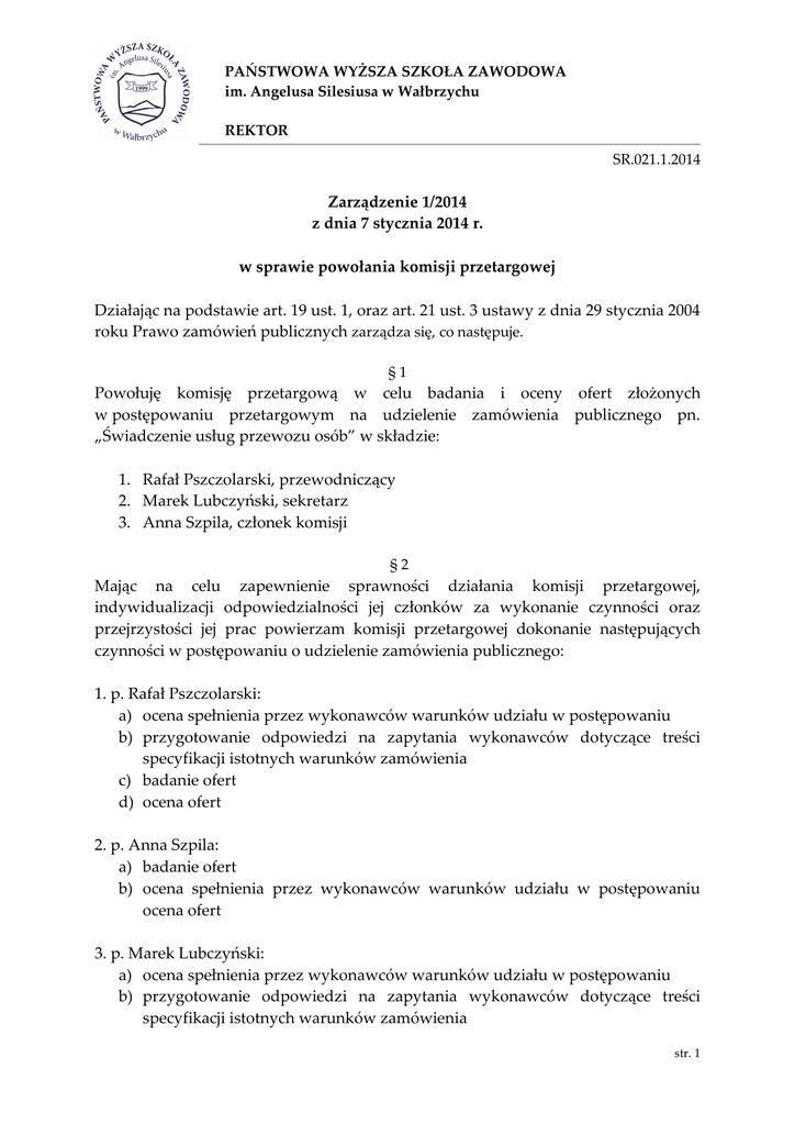 [Wpisz cytat z PAŃSTWOWA WYŻSZA SZKOŁA ZAWODOWA im. Angelusa Silesiusa w Wałbrzychu REKTOR SR.021.1.2014 Zarządzenie 1/2014 z dnia 7 stycznia 2014 r. w sprawie powołania komisji przetargowej Działając na podstawie art. 19 ust. 1, oraz art. 21 ust. 3 ustawy z dnia 29 stycznia 2004 roku Prawo zamówień publicznych zarządza się, co następuje. §1 Powołuję komisję przetargową w celu badania i oceny ofert złożonych w postępowaniu przetargowym na udzielenie zamówienia publicznego pn. „Świadczenie usług przewozu osób” w składzie: 1. Rafał Pszczolarski, przewodniczący 2. Marek Lubczyński, sekretarz 3. Anna Szpila, członek komisji §2 Mając na celu zapewnienie sprawności działania komisji przetargowej, indywidualizacji odpowiedzialności jej członków za wykonanie czynności oraz przejrzystości jej prac powierzam komisji przetargowej dokonanie następujących czynności w postępowaniu o udzielenie zamówienia publicznego: 1. p. Rafał Pszczolarski: a) ocena spełnienia przez wykonawców warunków udziału w postępowaniu b) przygotowanie odpowiedzi na zapytania wykonawców dotyczące treści specyfikacji istotnych warunków zamówienia c) badanie ofert d) ocena ofert 2. p. Anna Szpila: a) badanie ofert b) ocena spełnienia przez wykonawców warunków udziału w postępowaniu ocena ofert 3. p. Marek Lubczyński: a) ocena spełnienia przez wykonawców warunków udziału w postępowaniu b) przygotowanie odpowiedzi na zapytania wykonawców dotyczące treści specyfikacji istotnych warunków zamówienia str. 1 c) badanie ofert d) ocena ofert e) prowadzenie protokołu postępowania §3 W sprawach nieuregulowanych w zarządzeniu mają zastosowanie przepisy ustawy Prawo zamówień publicznych oraz Regulaminu udzielania zamówień publicznych w PWSZ AS. §4 Zarządzenie wchodzi w życie z dniem podpisania. REKTOR prof. zw. dr hab. Elżbieta Lonc str. 2