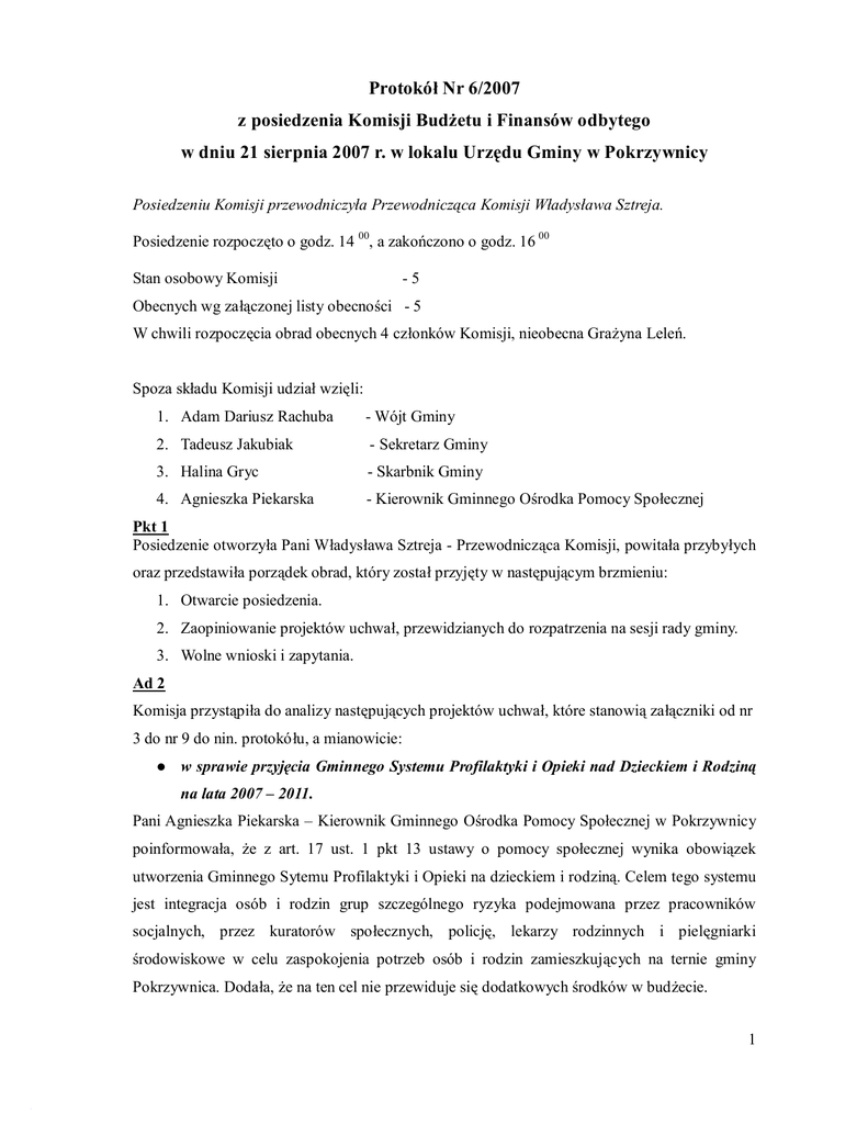 Protokół Nr 6/2007 z posiedzenia Komisji Budżetu i Finansów odbytego w dniu 21 sierpnia 2007 r. w lokalu Urzędu Gminy w Pokrzywnicy Posiedzeniu Komisji przewodniczyła Przewodnicząca Komisji Władysława Sztreja. Posiedzenie rozpoczęto o godz. 14 00, a zakończono o godz. 16 00 Stan osobowy Komisji -5 Obecnych wg załączonej listy obecności - 5 W chwili rozpoczęcia obrad obecnych 4 członków Komisji, nieobecna Grażyna Leleń. Spoza składu Komisji udział wzięli: 1. Adam Dariusz Rachuba - Wójt Gminy 2. Tadeusz Jakubiak - Sekretarz Gminy 3. Halina Gryc - Skarbnik Gminy 4. Agnieszka Piekarska - Kierownik Gminnego Ośrodka Pomocy Społecznej Pkt 1 Posiedzenie otworzyła Pani Władysława Sztreja - Przewodnicząca Komisji, powitała przybyłych oraz przedstawiła porządek obrad, który został przyjęty w następującym brzmieniu: 1. Otwarcie posiedzenia. 2. Zaopiniowanie projektów uchwał, przewidzianych do rozpatrzenia na sesji rady gminy. 3. Wolne wnioski i zapytania. Ad 2 Komisja przystąpiła do analizy następujących projektów uchwał, które stanowią załączniki od nr 3 do nr 9 do nin. protokółu, a mianowicie: l w sprawie przyjęcia Gminnego Systemu Profilaktyki i Opieki nad Dzieckiem i Rodziną na lata 2007 – 2011. Pani Agnieszka Piekarska – Kierownik Gminnego Ośrodka Pomocy Społecznej w Pokrzywnicy poinformowała, że z art. 17 ust. 1 pkt 13 ustawy o pomocy społecznej wynika obowiązek utworzenia Gminnego Sytemu Profilaktyki i Opieki na dzieckiem i rodziną. Celem tego systemu jest integracja osób i rodzin grup szczególnego ryzyka podejmowana przez pracowników socjalnych, przez kuratorów społecznych, policję, lekarzy rodzinnych i pielęgniarki środowiskowe w celu zaspokojenia potrzeb osób i rodzin zamieszkujących na ternie gminy Pokrzywnica. Dodała, że na ten cel nie przewiduje się dodatkowych środków w budżecie. 1 O godz. 14 15 na posiedzenie Komisji przybyła radna Grażyna Leleń. Uwag do projektu uchwały nie zgłoszono. Przewodnicząca Komisji zarządziła głosowanie w sprawie zaopiniowania powyższego projektu uchwały: - za pozytywnym zaopiniowaniem głosowało – 5 radnych (jednogłośnie) Komisja pozytywnie zaopiniowała projekt uchwały. l w sprawie zamiany gruntów. Wójt A. Rachuba przypomniał, że zgodnie z wcześniejszymi ustaleniami został przygotowany projekt uchwały w sprawie zamiany gruntu stanowiącego własność gminy Pokrzywnica położonego w Pokrzywnicy (za dawną Lecznicą Zwierząt) nabytego nieodpłatnie od Agencji Nieruchomości Rolnej, oznaczonego numerem ewidencyjnym nr 512/4 o powierzchni 1,40 ha, na grunt położony w Pokrzywnicy oznaczony numerem ewidencyjnym nr 409/1 o powierzchni 1,40 ha stanowiący własność Parafii Rzymsko – Katolickiej w Pokrzywnicy i leżący w bezpośrednim sąsiedztwie Szkoły Podstawowej w Pokrzywnicy. Nadmienił, że zarówno Agencja Nieruchomości Rolnej jak i Kanclerz Biskupa Płockiego wyrazili zgodę na zamianę gruntów. Dodał, że pozostałą część działki (ok. 0,60 ha) nabytej od Agencji Nieruchomości Rolnej planuje się przeznaczyć pod budowę oczyszczalni ścieków. Uwag do projektu uchwały nie zgłoszono. Przewodnicząca Komisji zarządziła głosowanie w sprawie zaopiniowania powyższego projektu uchwały: - za pozytywnym zaopiniowaniem głosowało – 5 radnych (jednogłośnie) Komisja pozytywnie zaopiniowała projekt uchwały. l w sprawie zbycia nieruchomości stanowiącej własność mienia komunalnego Gminy Pokrzywnica w drodze przetargu ustnego nieograniczonego. Wójt A. Rachuba zaproponował zbycie działki w drodze przetargu ustnego nieograniczonego nieruchomości niezabudowanej stanowiącej mienie komunalne gminy Pokrzywnica, położonej w m. Dzierżenin, oznaczonej nr 101/1 o powierzchni 0,1133 ha z przeznaczeniem pod budowę budynku, w którym będzie mieścić się filia banku i punkt apteczny. Władze Banku Spółdzielczego zadeklarowały wykup gruntu i wybudowanie budynku w przyszłym roku. Uwag do projektu uchwały nie zgłoszono. Przewodnicząca Komisji zarządziła głosowanie w sprawie zaopiniowania powyższego projektu uchwały: - za pozytywnym zaopiniowaniem głosowało – 5 radnych (jednogłośnie) Komisja pozytywnie zaopiniowała projekt uchwały. 2 l Zajęcie stanowiska w sprawie nabycia przez Gminę Pokrzywnica ok. 70 m2 gruntu na powiększenie nieruchomości zabudowanej, oznaczonej nr ew. 162 w miejscowości Dzierżenin. Wójt A. Rachuba zaproponował nabycie przez Gminę Pokrzywnica ok. 70 m2 gruntu na powiększenie nieruchomości zabudowanej (remiza OSP), oznaczonej nr ewidencyjnym 162 w m. Dzierżenin. Obecnie odległość budynku od granicy działki wynosi ok. 1,5 m. Wyjaśnił, iż w związku z planowaną modernizacją tego budynku zachodzi konieczność dokupienia gruntu, aby odległość od granicy działki wynosiła co najmniej 4 m. Zaznaczył, że OSP Dzierżenin zadeklarowało pokrycie kosztów zakupu działki w wys. ok. 3500 zł. Przewodnicząca Komisji zarządziła głosowanie w sprawie nabycia przez Gminę Pokrzywnica ok. 70 m2 gruntu na powiększenie nieruchomości zabudowanej, oznaczonej nr ew. 162 w miejscowości Dzierżenin: - za nabyciem gruntu głosowało – 5 radnych (jednogłośnie) Komisja zajęła pozytywne stanowisko. l Zajęcie stanowiska w sprawie zbycia przez Gminę Pokrzywnica części działek: nr 76/3 i nr 76/5 w miejscowości Klaski na powiększenie nieruchomości zabudowanej nr 76/1 Wójt A. Rachuba poinformował, że do Urzędu Gminy wpłynął wniosek Pani Żołyńskiej, która jest właścicielką działki o pow. 400 m2 wraz z budynkiem po byłej zlewni mleka w Klaskach nabytej od syndyka i zaadoptowanego na cele mieszkaniowe, o umożliwienie zakupu działki na powiększenie siedliska, co pozwoli zalegalizować budynek. W związku z powyższym wystąpił z propozycją zbycia przez Gminę Pokrzywnica części działek: nr 76/3 i 76/5 w miejscowości Klaski na których umiejscowiona jest remiza 