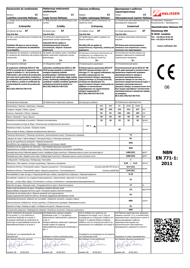 Declaración de rendimiento 12 Ladrillos caravista Nelissen Número: Deklaracja właściwości użytkowych 12 Numer: 3/Amarillo 67 Cap Gris Nez Декларация о рабочих характеристиках Αριθμός: 12 Τούβλα πρόσοψης Nelissen Номер: (1) Μοναδικός κωδικός αναγνώρισης του προϊόντος-τύπου: (1) Уникальный идентификационный код разновидности продукции: Cegły licowe Nelissen (1) Código único de identificación del tipo de (1) Niepowtarzalny kod identyfikacyjny typu wyrobu: producto: (2) Número de tipo: Δήλωση απόδοσης 3/żółty 67 (2) Numer typu: 3/κίτρινος Unidades HD para su uso en muros, columnas y particiones de albañilería no protegidos 2+ (4) Fabricante / Producent / Κατασκευαστής / Производитель: Steenfabrieken Nelissen NV Cap Gris Nez Cap Gris Nez Kiezelweg 460 B-3620 Lanaken (3) Προβλεπόμενη χρήση ή χρήσεις του δομικού προϊόντος: (3) Целевое назначение строительных изделий: Tel: +32 (0)12 44 02 44 Fax: +32 (0)12 45 53 89 Jednostki HD do użytku w niezabezpieczonych ścianach murowanych, słupach i ścianach działowych (6) Sistema/s de valoración y verificación de (6) System lub systemy oceny i weryfikacji la constancia del rendimiento del producto de stałości właściwości użytkowych wyrobu budowlanego: construcción: 3/желтый 67 (2) Αριθμός τύπου: Cap Gris Nez (3) Uso o usos previstos para el producto de (3) Zamierzone zastosowanie lub construcción: zastosowania wyrobu budowlanego: 12 Облицовочный кирпич Nelissen (2) Номер разновидности: 67 Μονάδες HD για χρήση σε HD-блоки для использования в απροστάτευτες τοιχοποιίες, κολόνες και каменных или кирпичных стенах, χωρίσματα колоннах или перегородках (6) Σύστημα ή συστήματα αξιολόγησης και επαλήθευσης της σταθερότητας της απόδοσης του δομικού προϊόντος: 2+ (6) Система или системы оценки или проверки стабильности показателей строительного материала: 2+ 2+ (7) Organismo notificado: (7) l’Organisme notifié: (7) Διακοινωμένος οργανισμός: (7) Уполномоченный орган: El organismo notificado BCCA N° NB 0749 se encargó de la inspección inicial, según el sistema 2+, de la planta de fabricación y del control de producción, así como de la supervisión constante y la evaluación del control de producción de la fábrica y emitió el certificado de conformidad de control de producción N°: BC2/201/496/013-00-P/01 Jednostka notyfikowana BCCA nr NB 0749 przeprowadziła w systemie 2 + wstępną inspekcję zakładu produkcyjnego i zakładowej kontroli produkcji oraz wykonała ciągły nadzór, ocenę i ewaluację zakładowej kontroli produkcji i wydała certyfikat zgodności zakładowej kontroli produkcji nr: BC2/201/496/013-00-P/01 Ο διακοινωμένος οργανισμός BCCA N° NB 0749 πραγματοποίησε υπό το σύστημα 2+ την αρχική επιθεώρηση της μονάδας παραγωγής και του εργοστασιακού ελέγχου παραγωγής, πραγματοποίησε τη συνεχή εποπτεία, εκτίμηση και αξιολόγηση του εργοστασιακού ελέγχου παραγωγής και εξέδωσε το πιστοποιητικό συμμόρφωσης του εργοστασιακού ελέγχου παραγωγής N° : BC2/201/496/013-00-P/01 Уполномоченный орган BCCA N° NB 0749, действующий в соответствии с правилами первичной проверки производственного завода и контроля производственных процессов завода по системе 2+, выполнил продолжительный аудит и проверку производственного процесса завода, по результатам чего был выдан сертификат соответствия производственных процессов завода за номером: BC2/201/496/013-00-P/01 (9) Rendimiento declarado: (9) Deklarowane właściwości użytkowe (9) Δηλωμένη απόδοση: (9) Заявленные характеристики: Dimensiones / Wymiary / Διαστάσεις / Размеры M50 M65 RF WV50 WV65 Longitud / Długość / Μήκος / Длина 192 192 212 212 217 mm Anchura / Szerokość / Πλάτος / Ширина 91 91 101 101 102 mm Altura / Wysokość / Ύψος / Высота 49 64 39 49 64 mm Resistencia normalizada a la presión / Ściskanie znormalizowane 22 25 22 22 25 N/mm² Κανονικοποιημένη αντοχή σε θλίψη / Номинальная компрессионная прочность cat. I , Resistencia media a la presión / Ściskanie średnie ﬩ 30 Μέση αντοχή σε θλίψη / Средняя компрессионная прочность T2 Categoría de rango / Zakres kategorii / Κατηγορία Εύρους / Категория диапазона R1 Liso de las superficies de colocación / Płaskość powierzchni Επιπεδότητα των επιφανειών κλίνης / Равномерность постельных граней NPD Paralelismo de las superficies de colocación / Równoległość płaszczyzn powierzchni Παραλληλότητα επίπεδων επιφανειών κλίνης / Плоско-параллельность по
