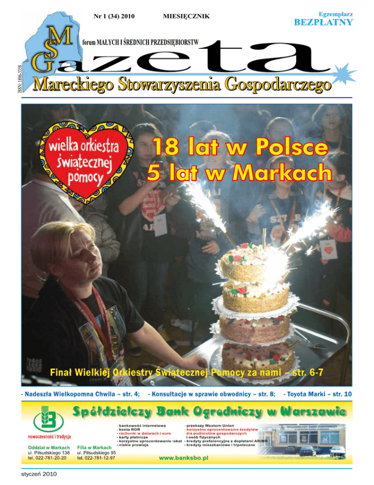 Nr 1 (34) 2010 MIESIĘCZNIK 18 lat w Polsce 5 lat w Markach Finał Wielkiej Orkiestry Świątecznej Pomocy za nami – str. 6-7 - Nadeszła Wielkopomna Chwila – str. 4; styczeń 2010 - Konsultacje w sprawie obwodnicy – str. 8; - Toyota Marki – str. 10 wiadomości z miasta Okażmy pomocną dłoń Drodzy Czytelnicy, Mieszkańcy Marek! Nie tak dawno przeżyliśmy najgorętsze Święta w najzimniejszej porze roku. Składaliśmy sobie życzenia, a serca nasze były przepełnione miłością i dobrocią. Tak się złożyło, że nie dla wszystkich ten okres był czasem uroczystego świętowania. 24 grudnia, w samą wigilię Świąt Bożego Narodzenia, jedną z mareckich rodzin dotknęło nieszczęście. Wybuchł pożar, który doszczętnie strawił warsztat oraz znacząco uszkodził dach budynku mieszkalnego. Spłonęło całkowicie jedyne źródło utrzymania całej rodziny. W warsztacie znajdowały się wszystkie narzędzia oraz materiały niezbędne do prowadzenia działalności. Dach budynku w znacznym stopniu się nadpalił, a straż - chcąc ugasić pożar - dodatkowo zalała górną kondygnację. Mareckie Stowarzyszenie Gospodarcze postanowiło wesprzeć rodzinę Państwa Bąkowskich kwotą 2500 zł. Jednocześnie zwracamy się z ogromną prośbą do wszystkich ludzi dobrej woli o wsparcie dla poszkodowanych. W tym celu uruchamiamy konto, na które każdy może dokonać wpłaty SBO w Warszawie O/Marki 97 8015 0004 0010 0869 2020 0101 z dopiskiem „dla poszkodowanych w pożarze” Głęboko wierzymy w otwartość serc mieszkańców naszego miasta. Ubiegłoroczna wigilia na zawsze będzie złym wspomnieniem dla rodziny Bąkowskich, ale zróbmy wszystko, aby udało się te gorzkie wspomnienia osłodzić naszą otwartością i szczodrością. Głęboko w to wierzymy. Zarząd i redakcja Gazety Mareckiego Stowarzyszenia Gospodarczego PS.Darowiznę można odliczyć od dochodu w zeznaniu podatkowym za 2010 r. Rekordowy FINAŁ !!! XVIII Finał Wielkiej Orkiestry Świątecznej Pomocy za nami. Po raz 5 mieszkańcy Marek mogli wziąć udział w imprezie zorganizowanej w Szkole Podstawowej nr 1. W tym roku Sztab Marki składał się przede wszystkim z ludzi zrzeszonych w pozarządowych organizacjach działających na terenie miasta. Ramię w ramię współpracowali członkowie Mareckiego Stowarzyszenia Gospodarczego (MSG), Towarzystwa Przyjaciół Marek (TPM), Stowarzyszenia RockDzieciak, wspierani przez Urząd Miasta. Owocem tej współpracy była impreza, podczas której Marki zebrały 64 277,54 zł oraz różne waluty (euro, dolary, korony), a także 6,5 litra krwi. Ustanowiliśmy kolejny rekord ofiarności!!!! 10 stycznia 2010 roku dzieci-wolontariusze (192 osób) pod okiem opiekunów zebrały do puszek kwestarskich 49.666, 65 zł. Nie przeszkodził im mróz ani zaśnieżone ulice, a czerwone serducha na koszulkach sztabowych ufundowanych przez Toyota Marki odcinały się wyraźnie od zimowej bieli ulic miasta. Podczas przygotowań do Finału nie zawiedli jak zwykle sponsorzy - mareckie firmy i instytucje wspomogły nas finansowo i rzeczowo. To dzięki ich hojności mogliśmy przeprowadzić loterię fantową oraz aukcje, z których dochód wspomoże leczenie dzieci z chorobami onkologicznymi. Brawurowe występy dzieci i młodzieży podczas finałowego koncertu przygotowane przez mareckie szkoły, przedszkole Smerfy, Stowarzyszenie Rock-Dzieciak, MOK w Markach, Egurrola Dance Studio i UKS-y: Joker i Sanchin, udowodniły jak wielki potencjał drzemie w naszych dzieciach – dziękujemy wszystkim młodym artystom i ich mistrzom. Serdecznie dziękujemy wszystkim, którzy wrzucili grosz do puszki lub zostali honorowym dawcą krwi, rodzicom którzy opiekowali się wolontariuszami podczas kwesty. Dziękujemy zespołom Telson, Fabryka i Większy Obciach za fantastyczną muzykę, p. Dyrektor Mareckiego Ośrodka Kultury, Krystynie Klimeckiej, za wsparcie i ufundowanie nagród w konkursach, pracownikom Urzędu Miasta i Zakładu Usług Komunalnych za przygotowanie sceny i odśnieżenie terenu, p. Dyrektor SP 1, Annie Jusińskiej oraz jej pracownikom za gościnę i ogromną pomoc, pracownikom pozostałych szkół mareckich: Szkoły Podstawowej nr 2, Szkoły Podstawowej nr 3, Szkoły Podstawowej nr 4, Zespołowi Szkół nr 2 oraz Zespołowi Szkół Specjalnych przy ul. Kasztanowej za przygotowanie dzieci do występów. Dziękujemy policjantom z komisariatu w Markach i firmie Lupus za zapewnienie bezpieczeństwa podczas imprezy. Dziękujemy serdecznie p. Darkowi Myszkinisowi i jego Ekipie za nagłośnienie i oświetlenie koncertu, dziękujemy Paniom z przedszkoli Teletubiś i Wesoły Teletubiś za opiekę nad najmłodszymi, Paniom Kucharkom za wspaniałe jedzenie, Paniom Pielęgniarkom z opiekę medyczną. Dziękujemy Państwu Antkiewiczom i Pawłowskim za pomoc w zorganizowaniu Loterii, Panu Urbaniakowi za pyszny tort urodzinowy, Państwu Wośko za ufundowanie nagród rzeczowych. Chylimy czoła przed wszystkimi, którzy nas wspierali finansowo, rzeczowo i duchowo. Dziękujemy firmom i osobom prywatnym które przekazywały cenne przedmioty, dzięki którym pieniądze trafiały do puszki. Współpraca z Wami była dla Sztabu Marki zaszczytem. Pełna relacja www.marki.net.pl/wosp Dziękujemy wszystkim osobom, firmom, instytucjom, dzięki którym XVIII Finał WOŚP w Markach był świętem radości: Toyota Marki Werso Monika Popławska Parmapress Eurozoo Ravimed Eskulap UOKiK Sylmag Godex Opifex Grzegorz Miechowicz Doradztwo Marketingowe CentrSpaw Silmak Piekarnia Klementynka Piekarnia Kobus Zakłady Wędliniarskie „TUR” PSB Interior Centrum Bulik Interm Sony Centre Gabinet Stomatologiczny A.M. Telżyńscy Pizza Hut Pizza Dominium Kancelatria Podatkowa Skłodowscy Biznes Marki Spółdzielczy Bank Ogrodniczy Dziecięcy Raj Teletubiś Wesoły Teletubiś Polski Czerwony Krzyż Kredania Globtroter Biuro Beaty Secpol Ryńscy Development Joanna Reckitt - Benckinser KP Legia KSP Polonia Clifford Chance PWPW E