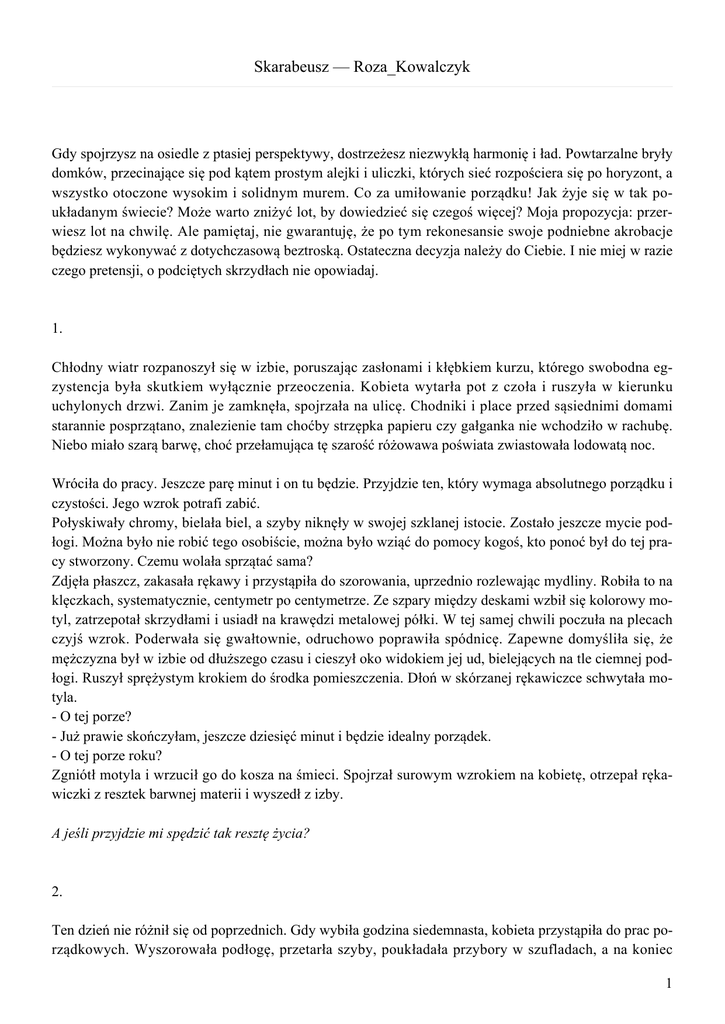 Skarabeusz — Roza_Kowalczyk Gdy spojrzysz na osiedle z ptasiej perspektywy, dostrzeżesz niezwykłą harmonię i ład. Powtarzalne bryły domków, przecinające się pod kątem prostym alejki i uliczki, których sieć rozpościera się po horyzont, a wszystko otoczone wysokim i solidnym murem. Co za umiłowanie porządku! Jak żyje się w tak poukładanym świecie? Może warto zniżyć lot, by dowiedzieć się czegoś więcej? Moja propozycja: przerwiesz lot na chwilę. Ale pamiętaj, nie gwarantuję, że po tym rekonesansie swoje podniebne akrobacje będziesz wykonywać z dotychczasową beztroską. Ostateczna decyzja należy do Ciebie. I nie miej w razie czego pretensji, o podciętych skrzydłach nie opowiadaj. 1. Chłodny wiatr rozpanoszył się w izbie, poruszając zasłonami i kłębkiem kurzu, którego swobodna egzystencja była skutkiem wyłącznie przeoczenia. Kobieta wytarła pot z czoła i ruszyła w kierunku uchylonych drzwi. Zanim je zamknęła, spojrzała na ulicę. Chodniki i place przed sąsiednimi domami starannie posprzątano, znalezienie tam choćby strzępka papieru czy gałganka nie wchodziło w rachubę. Niebo miało szarą barwę, choć przełamująca tę szarość różowawa poświata zwiastowała lodowatą noc. Wróciła do pracy. Jeszcze parę minut i on tu będzie. Przyjdzie ten, który wymaga absolutnego porządku i czystości. Jego wzrok potrafi zabić. Połyskiwały chromy, bielała biel, a szyby niknęły w swojej szklanej istocie. Zostało jeszcze mycie podłogi. Można było nie robić tego osobiście, można było wziąć do pomocy kogoś, kto ponoć był do tej pracy stworzony. Czemu wolała sprzątać sama? Zdjęła płaszcz, zakasała rękawy i przystąpiła do szorowania, uprzednio rozlewając mydliny. Robiła to na klęczkach, systematycznie, centymetr po centymetrze. Ze szpary między deskami wzbił się kolorowy motyl, zatrzepotał skrzydłami i usiadł na krawędzi metalowej półki. W tej samej chwili poczuła na plecach czyjś wzrok. Poderwała się gwałtownie, odruchowo poprawiła spódnicę. Zapewne domyśliła się, że mężczyzna był w izbie od dłuższego czasu i cieszył oko widokiem jej ud, bielejących na tle ciemnej podłogi. Ruszył sprężystym krokiem do środka pomieszczenia. Dłoń w skórzanej rękawiczce schwytała motyla. - O tej porze? - Już prawie skończyłam, jeszcze dziesięć minut i będzie idealny porządek. - O tej porze roku? Zgniótł motyla i wrzucił go do kosza na śmieci. Spojrzał surowym wzrokiem na kobietę, otrzepał rękawiczki z resztek barwnej materii i wyszedł z izby. A jeśli przyjdzie mi spędzić tak resztę życia? 2. Ten dzień nie różnił się od poprzednich. Gdy wybiła godzina siedemnasta, kobieta przystąpiła do prac porządkowych. Wyszorowała podłogę, przetarła szyby, poukładała przybory w szufladach, a na koniec 1 otworzyła drzwi, by przewietrzyć izbę. W nocy spadł śnieg. Chodniki i jezdnie zostały oczyszczone, ale i tak biały puch dominował w krajobrazie. Niebo słabo odcinało się od linii widnokręgu - coś w jego barwie sugerowało, że noc będzie lodowato zimna. A może to nie była kwestia poświaty? Może to wydobywający się z setek psich gardzieli skowyt wywoływał u niej dreszcze? Zamknęła drzwi i skuliła się. Ciepło bijące od ściany pieca przyniosło ukojenie. Zostanie jeszcze trochę. Napisze kilka zdań w dzienniku, który dopiero co zaczęła prowadzić. Wydaje mi się, że spędziłam tu całą wieczność, a to przecież dopiero dwa lata. I do kogo ja mogę mieć pretensję? Przecież sama dokonałam wyboru. Miałam dosyć mojego okrutnego ojca, zapijaczonego brata, pracy w prowincjonalnej przychodni, z jej okropnym kierownikiem. Nie ma powrotu w stare koleiny. Nie zniosłabym triumfu krewnych i dawnych przełożonych. Ale czy cena, którą przychodzi mi płacić za uwolnienie się od moich prześladowców nie jest aby za wysoka? Dotąd ufałam sobie, swojej intuicji. Jednak w panującej tu rzeczywistości zaczynam czuć się bezradna. Jestem świadkiem i narzędziem licznych zbrodni, od niedawna również tych wykonywanych na dzieciach. Początkowo rzecz tłumaczyłam sobie tak: muszę patrzeć na śmierć dzieci, bo jest to kara za to, co zrobiłam swojemu dziecku. Ale jak długo będzie trwała pokuta? Czy w ogóle kiedykolwiek skończy się? Dzisiaj przyniesiono dwoje niemowląt. To numery ich matek (są nieprzechodnie, może łatwiej będzie coś wyciągnąć z ewidencji). Chłopcy. Nie mam teraz głowy do wymyślania imion, ale zrobię to na pewno, lada dzień. Ktoś kiedyś powiedział, że każdy żyje po coś, dla jakieś roli, choćby była to rola najskromniejsza. I w związku z tym każdy dostanie od losu swoje „pięć minut”. Do jakiej roli powołano te dzieci? Niemowlęta w pierwszych tygodniach życia niewiele widzą, a jeszcze mniej rozumieją. Odchodzą nieświadome tego, co im się odbiera, co tracą. Czasem udaje mi się zebrać trochę sił, a wtedy myślę, że dam radę przeczekać trudny czas, że jak to wszystko się skończy, założę dom dla sierot. I że dzieciom w tym sierocińcu nadam nowe imiona – te same, które teraz daję niemowlętom. To może zadziałać, to może mieć sens. Są chwile, gdy wierzę w takie rzeczy. Czasem udaje mi się zebrać trochę sił… 3. Ranek był rześki, słoneczny, a powietrze przeraźliwie zimne. Ludziom wydawało się, że zamarzają im oczy. Kobieta pochuchała w dłonie, wyjęła z kieszeni klucze i otworzyła drzwi oznaczone krzyżem. Mężczyźni, którzy sprzątali śnieg na pobliskim placyku, przerwali rozmowę. - Wejdźcie na chwilę do mnie – powiedziała cicho. Rozejrzeli się i szybkim krokiem wstąpili do izby. Kobieta sięgnęła do szuflady. - Pokaż język. I ty też to zrób. Posłusznie wykonali polecenie. Kobieta wsunęła im w usta po kostce cukru. Ten drobny gest mógł przysporzyć jej niemałych kłopotów. Przełożony regularnie zjawiał się na kont
