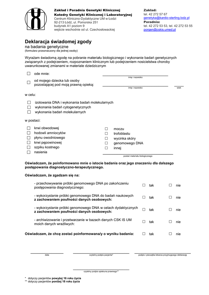 Deklaracja świadomej zgody - Katedra Genetyki Klinicznej i