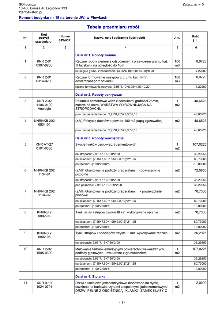 SOI Łomża 18-400 Łomża Al. Legionów 133 Identyfikator: jg Załącznik nr 5 Remont budynku nr 19 na terenie JW. w Plewkach Tabela przedmiaru robót Nr Kod pozycji przedmiaru 1 2 Numer STWiOR B 3 Nazwa, opis i obliczenie ilości robót 4 J.m. Ilość j.m. 5 6 Dział nr 1. Roboty ziemne 1 KNR 2-01 0307-0200 Ręczne roboty ziemne z odspojeniem i przewozem gruntu kat. III taczkami na odległość do 10m 100 m3 usunięcie gruntu z zadaszenia: (3,95*6,10+8,05+4,00)*0,20 2 KNR 2-01 0314-0200 Ręczne formowanie nasypów z gruntu kat. III-IV dostarczanego z odkładu 0,0723 7,22900 100 m3 ręczne formowanie nasypu: (3,95*6,10+8,05+4,00)*0,20 0,0723 7,22900 Dział nr 2. Roboty pokrywcze 3 KNR 2-02 1106-0100 Analogia Posadzki cementowe wraz z cokolikami grubości 25mm, zatarte na ostro. WARSTWA WYRÓWNUJĄCA NA STROPODACHU 1 m2 pow. zadaszenia beton.: 2,95*8,255+3,00*8,10 4 NNRNKB 202 0534-01 48,6523 48,65225 (z.V) Pokrycie dachów o pow.do 100 m2 papą zgrzewalną m2 pow. zadaszenia beton.: 2,95*8,255+3,00*8,10 48,6523 48,65225 Dział nr 3. Roboty wewnętrzne 5 KNR AT-27 0101-0300 Skucie tynków cem.-wap. i cementowych 1 m2 na stropach: 2,95*7,15+7,60*2,00 36,29250 na ścianach: (7,15+7,60+1,95+2,00*2)*2*1,95 80,73000 potrącenie: -(1,00*2,00)*5 6 7 NNRNKB 202 1134-01 NNRNKB 202 1134-02 -10,00000 (z.VII) Gruntowanie podłoży preparatami - powierzchnie poziome m2 36,29250 pod posadzki: 2,95*7,15+7,60*2,00 36,29250 (z.VII) Gruntowanie podłoży preparatami pionowe - powierzchnie m2 -10,00000 Tynki ścian i słupów zwykłe III kat. wykonywane ręcznie m2 na ścianach: (7,15+7,60+1,95+2,00*2)*2*1,95 KNKRB 2 0802-06 -10,00000 Tynki stropów i podciągów zwykłe III kat. wykonywane ręcznie m2 na stropach: 2,95*7,15+7,60*2,00 10 KNR 2-02 1505-0300 70,7300 80,73000 potrącenie: -(1,00*2,00)*5 9 70,7300 80,73000 potrącenie: -(1,00*2,00)*5 KNKRB 2 0802-03 72,5850 na stropach: 2,95*7,15+7,60*2,00 na ścianach: (7,15+7,60+1,95+2,00*2)*2*1,95 8 107,0225 Malowanie farbami emulsyjnymi powierzchni wewnętrznych; podłoży gipsowych - dwukrotne z gruntowaniem 36,2925 36,29250 1 m2 na stropach: 2,95*7,15+7,60*2,00 107,0225 36,29250 na ścianach: (7,15+7,60+1,95+2,00*2)*2*1,95 80,73000 potrącenie: -(1,00*2,00)*5 -10,00000 Dział nr 4. Stolarka 11 KNR 0-19 1024-0701 Drzwi aluminiowe jednoskrzydłowe mocowane na dyble, oszklone na budowie szybami zespolonymi jednokomorowymi. DRZWI PEŁNE Z OŚCIEŻNICĄ , KLAMKI I ZAMEK KLASY C -1- 1 m2 2,0000 4. Stolarka Nr Kod pozycji przedmiaru 1 2 Numer STWiOR B 3 Nazwa, opis i obliczenie ilości robót 4 J.m. Ilość j.m. 5 6 drzwi wewnętrzne: 1,00*2,00 12 KNR 2-02 1203-0200 2,00000 Drzwi stalowe pełne o powierzchni ponad 2m2. ZEWNĘTRZNE Z OŚCIEŻNICĄ, OCIEPLONE, ANTYWŁAMANIOWE RC5 KOLOR USTALIĆ Z INWESTOREM PODCZAS WYMIANY. DWA ZAMKI WEWNĘTRZNE KLASY C + ZABEZPIECZENIE PRZECIWWYWAŻENIOWE. m2 drzwi stalowe zewnętrzne: 1,00*2,00 2,0000 2,00000 Dział nr 5. Posadzki 13 KNNR 3W 0801-0300 Rozbiórki posadzek. Zerwanie posadzek cementowych i lastrykowych wraz z cokolikami 1 m2 powierzchnia posadzek: 2,95*7,15+7,60*2,00 14 KNKRB 2 0601-01 Izolacje przeciwwilgociowe powłokowe bitumiczne jednowarstw. powierzchni poziomych wykonywane na gorąco 36,29250 m2 powierzchnia posadzek: 2,95*7,15+7,60*2,00 15 TZKNBK 11 0070-0100 Analogia Podkłady i warstwy wyrównawcze, podkład betonowy na podłożu gruntowym .WARSTWA WYRÓWNAWCZA NA IZOLACJI PRZECIWWILGOCIOWEJ KNR 0-12 1118-0100 Posadzki płytkowe z kamieni sztucznych układanych na klej. Przygotowanie powierzchni 1 m2 KNR 2-02W 1111-0301 Posadzki jedno- i dwubarwne z płytek z kam.sztucz.na zapr.klej.układane metodą regul.i nieregularną. Płytki podłogowe o wymiarach 30 x 30 cm na zaprawie o najwyższej. obciążalności - układane metodą regularną. GRES 1 m2 KNR 2-02W 1115-0200 Cokoliki z kamieni sztucznych. Cokoliki z kształtek układanych na zaprawie klejowej 36,2925 36,29250 1 m2 powierzchnia posadzek: 2,95*7,15+7,60*2,00 18 36,2925 36,29250 powierzchnia posadzek: 2,95*7,15+7,60*2,00 17 36,2925 36,29250 powierzchnia posadzek: (2,95*7,15+7,60*2,00) 16 36,2925 36,2925 36,29250 1m COKOLIK: 6,15*2+1,95+7,60*2+2,00 31,4500 31,45000 Dział nr 6. Schody 19 20 KNKRB 3 0403-02 KNP 02 0411-0101 Rozbiorka elementow zelbetowych. ROZEBRANIE SCHODÓW ZEWNĘTRZNYCH m3 rozebranie schodów- stopnie (7 stopni): 0,90*1,30*0,15 0,17550 płyta: 1,80*1,1*0,10 0,19800 ściana: 1,30*0,20*1,40 0,36400 Deskowanie schodów prostych - ustawienie m2 deskowanie schodów z płytą i ścianką: 1,00*1,50+1,80*1,10+1,50*1,50*2*0,5 21 KNR 2-04 1701-0300 Przygotowanie,montaż zbrojenia fund.kominów,pom.specjalnych i stropów. Zbrojenie schodów pomieszczeń specjalnych KNNR 2 0107-0900 5,7300 5,73000 1t zbrojenie: 0,073 22 0,7375 0,0730 0,07300 Betonowanie konstrukcji zbrojonych w deskowaniu tradycyjnym. Betonowanie schodów prostych 1 m3 0,8730 wykonanie schodów- stopnie (7 stopni): 1,00*1,50*0,15 0,22500 płyta: 1,80*1,10*0,10 0,19800 ściana: 1,50*0,20*1,50 0,45000 -2- 6. Schody Nr Kod pozycji przedmiaru 1 2 23 KNR 0-12 1118-0100 Numer STWiOR B 3 Nazwa, opis i obliczenie ilości robót 4 Posadzki płytkowe z kamieni sztucznych układanych na klej. Przygotowanie powierzchni J.m. Ilość j.m. 5 6 1 m2 powierzchnia posadzki schodów: 1,00*1,50+1,80*1,10 24 KNR 0-12 1121-0600 Okładziny schodów z płytek z kamieni sztucznych układanych na klej. Okładzina z płytek o wymiarach 40x40cm, układanych metodą zwykłą 3,48000 m2 powierzchnia posadzki schodów: 1,00*1,50+1,80*1,10 25 KNKRB 2 1201-01 Balustrady schodowe z pręetow stalowych osadzone i zabet.w co trzecim stopniu. BALUSTRADA I POCHWYT ZE STALI NIERDZEWNEJ. 27 KNR 4-01 0108-1900 KNR 4-01 0108-2000 3,4800 3,48000 m BALUSTRADA: 2,90 26 3,4800 2,9000 2,90000 Wywóz gruzu z rozbieranych konstrukcji żwirobetonowych i żelbetowych samochodami samowyładowczymi na odległość do 1km 1 m3 5,7621 gruz z okutych tynków: 107,02*0,03 3,21060 gruz z posadzek: 36,29*0,05 1,81450 gruz z rozbiórk