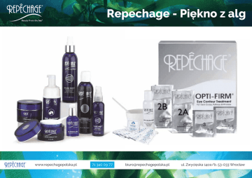 Repechage - Piękno z alg www.repechagepolska.pl 71 340 09 77 [email protected] ul. Zwycięska 14ce/b, 53-033 Wrocław Właścicielka marki • 1980- Rozpoczęcie: Repêchage® Four Layer Facial® 12 produktów do pielęgnacji domowej • Miejsce honorowe w CIDESCO USA • Autorka książki “Sukces w Twoich rękach” Okrzyknięta przez New York Times „Najlepszą kosmetyczką w USA”. “Jedna z najbardziej wpływowych kobiet w branży kosmetycznej” Repechage Polska [re-pe-szaż] franc. uratować, dać drugą szansę Repechage Polska to oficjalny przedstawiciel jednej z najlepszych na świecie firm kosmetycznych „Repechage”. Firma Repechage Polska zajmuje się dystrybucją najwyższej klasy kosmetyków, przeznaczonych dla profesjonalnych salonów, ale także do użytku domowego. Repêchage to prekursorzy w technologiach przetwarzania alg morskich oraz pionierzy w Stanach Zjednoczonych w zabiegach i kosmetykach opartych na ekstraktach z alg. Algi są poławiane w czystych wodach morskich u wybrzeży Bretanii i przetwarzane najnowocześniejszymi metodami, pozwalającymi zachować ich najważniejsze właściwości. Do produkcji kosmetyków wykorzystywane są tylko najwyższej jakości naturalne składniki oraz innowacyjne technologie. www.repechagepolska.pl 71 340 09 77 [email protected] ul. Zwycięska 14ce/b, 53-033 Wrocław Wyróżniki marki • Made in USA - cały proces produkcyjny odbywa się w siedzibie Repechage w Stanach Zjednoczonych • Wysoka jakość i bezpieczeństwo stosowania • Najnowsze technologie oraz składy produktów • Produkty oraz zabiegi bezpieczne dla pacjentów onkologicznych, kobiet w ciąży • Międzynarodowe certyfikaty: GMP, ISO 9001,Eco Cert www.repechagepolska.pl 71 340 09 77 [email protected] ul. Zwycięska 14ce/b, 53-033 Wrocław www.repechagepolska.pl 71 340 09 77 [email protected] ul. Zwycięska 14ce/b, 53-033 Wrocław ZABIEG 4 LAYER FACIAL Zabieg Czterowarstwowy • GŁĘBOKO NAWILŻA • ODŚWIEŻA • KOI I ŁAGODZI • GŁĘBOKO ODŻYWIA www.repechagepolska.pl 71 340 09 77 [email protected] ul. Zwycięska 14ce/b, 53-033 Wrocław BESTSELLER ROKU 2014 IMPERIUM KOBIET Cell Renewal na pierwsze oznaki starzenia • ODBUDOWA • REGENERACJA • ODNOWA PRZEZNACZONY DO WSZYSTKICH RODZAJÓW SKÓRY www.repechagepolska.pl 71 340 09 77 [email protected] ul. Zwycięska 14ce/b, 53-033 Wrocław OPTI-FIRM CONTOUR TREATMENT Set Zabiegowy poprawiający kontur oka Seaweed Treatment ekspresowy zabieg algowy www.repechagepolska.pl • ZMARSZCZKI • CIENIE • OPUCHLIZNA • PODKRĄŻENIA 71 340 09 77 [email protected] ul. Zwycięska 14ce/b, 53-033 Wrocław OPTI - FIRM Dla cery dojrzałej / zniszczonej słońcem • UJĘDRNIENIE • ODNOWA • REGENERACJA REZULTATY POTWIERDZONE KLINICZNIE! www.repechagepolska.pl 71 340 09 77 [email protected] ul. Zwycięska 14ce/b, 53-033 Wrocław Testowany dermatologicznie HYDRA MEDIC Set zabiegowy głęboko oczyszczający “To najbardziej kompletny, głęboko oczyszczający zabieg, o jakim słyszałam” dr.n.med. Joel Gerson www.repechagepolska.pl 71 340 09 77 [email protected] ul. Zwycięska 14ce/b, 53-033 Wrocław HYDRA MEDIC sposób na czystą skórę! • OCZYSZCZA • REGULUJE • ŁAGODZI STANY ZAPALNE “Rozwiązanie dla skóry trądzikowej!” www.repechagepolska.pl 71 340 09 77 [email protected] ul. Zwycięska 14ce/b, 53-033 Wrocław BIOLIGHT Set zabiegowy silnie rozjaśniający • ROZJAŚNIA • UJĘDRNIA • ODŻYWIA • WYRÓWNUJE KOLORYT “Nowoczesne i profesjonalne rezultaty!” www.repechagepolska.pl 71 340 09 77 [email protected] ul. Zwycięska 14ce/b, 53-033 Wrocław BIOLIGHT Cera z przebarwieniami / dojrzała “Ekspresowa kuracja zmęczonej skóry” Red Magazine www.repechagepolska.pl 71 340 09 77 [email protected] ul. Zwycięska 14ce/b, 53-033 Wrocław Vita Cura Silnie ujędrniający 5-fazowy set zabiegowy • ODMŁODZENIE • NAWILŻENIE • UJĘDRNIENIE • LIFT “Alternatywa dla zabiegów medycyny estetycznej” www.repechagepolska.pl 71 340 09 77 [email protected] ul. Zwycięska 14ce/b, 53-033 Wrocław Vita Cura Dla cery dojrzałej i zniszczonej “No w uję oczes drn ne i e n skó i ry” e “Spektakularne rezultaty! Program przeciw starzeniu się skóry” www.repechagepolska.pl 71 340 09 77 [email protected] ul. Zwycięska 14ce/b, 53-033 Wrocław Hydra Dew Express Lift Błyskawiczny lift przesuszonej skóry • GŁĘBOKIE NAWILŻENIE • REGENERACJA • UJĘDRNIENIE • WYGŁADZENIE www.repechagepolska.pl 71 340 09 77 [email protected] ul. Zwycięska 14ce/b, 53-033 Wrocław “Na s wyc ycona i ą z al gie g m naw morsk i prz ilżając ch y a j e do stó mność pig łów ” Hydra Dew Pożegnaj suchą skórę! www.repechagepolska.pl 71 340 09 77 [email protected] ul. Zwycięska 14ce/b, 53-033 Wrocław ZABIEGI EKSPRESOWE - FACIAL BAR Maksymalny efekt w minilanym czasie! Lamina Lift Mask - nawilżająca maska w płacie Międzynarodowy trend już w Polsce! Seaweed Treatment- ekspresowy zabieg algowy www.repechagepolska.pl 71 340 09 77 [email protected] ul. Zwycięska 14ce/b, 53-033 Wrocław ZABIEGI I RYTUAŁY SPA REPECHAGE • ZŁUSZCZENIE • UJĘDRNIENIE • WYSZCZUPLENIE • ODTOKSYCZNIENIE • WYGŁADZENIE www.repechagepolska.pl 71 340 09 77 [email protected] ul. Zwycięska 14ce/b, 53-033 Wrocław PEPPERMINT SEA TWIST Zabieg miętowy na ciało “Oczyszczona i pełna energii skóra. Warte każdych pieniędzy!” Elle Magazine www.repechagepolska.pl 71 340 09 77 [email protected] ul. Zwycięska 14ce/b, 53-033 Wrocław VITA CURA BODY LINE Ekskluzywna pielęgnacja ciała w domu Potrójnie ujędrniająca pielęgnacja ciała ze sładnikami morskimi www.repechagepolska.pl 71 340 09 77 [email protected] ul. Zwycięska 14ce/b, 53-033 Wrocław REPECHAGE W MEDIACH www.repechagepolska.pl 71 340 09 77 [email protected] ul. Zwycięska 14ce/b, 53-033 Wrocław ZAPRASZAMY DO WSPÓŁPRACY SALONY KOSMETYCZNE, OŚRODKI, HOTELE SPA&wellnes PROFESJONALNY DOBÓR MENU ZABIEGOWEGO WSPÓŁPRACA SZYTA NA MIARĘ