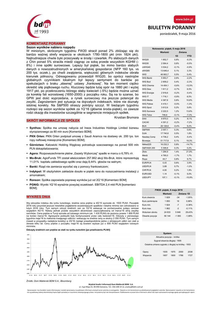 BIULETYN PORANNY poniedziałek, 9 maja 2016 KOMENTARZ PORANNY Sezon wyników nabiera rozpędu W minionym, skróconym tygodniu FW20 stracił ponad 2% zbliżając się do bardzo ważnej strefy wsparcia w okolicach 1780-1800 pkt (min 1824 pkt). Najtrudniejsze chwile byki przezywały w środę i czwartek. Po słabszych danych z Chin ponad 5% straciła miedź ciągnąc za sobą przede wszystkim KGHM (8%) i inne spółki surowcowe. Lepszy był piątek, bo mimo bardzo słabych danych o nowozatrudnionych w amerykańskiej gospodarce (NFP 160 tys. vs 200 tys. oczek.), po chwili zwątpienia, większość głównych indeksów obrała kierunek północny. Odreagowaniu przewodził WIG20, bo oprócz nastrojów globalnych czynnikiem lokalnym był lepszy sentyment do banków po spekulacjach o braku „sławnej” ustawy „frankowej”. Na ten moment ciężko określić siłę piątkowego ruchu. Kluczowy będzie tutaj opór na 1880 pkt i wyżej 1917 pkt, po przekroczeniu którego słaby kwiecień (-5%) będzie można uznać za korektę fali wzrostowej (1650-2000) z początku roku. Są na to szanse, bo GPW jest dość wyprzedana, a rynek surowcowy ma jeszcze potencjał do zwyżki. Zagrożeniem jest sytuacja na dojrzałych indeksach, które nie doznały istotnej korekty. Na S&P500 straszy potrójny szczyt. W bieżącym tygodniu rozkręci się sezon wyników spółek za 1Q’16 (głównie środa-piątek), co zawsze rodzi okazję dla inwestorów szczególnie w segmencie mniejszych spółek. SKRÓT INFORMACJI ZE SPÓŁEK Krystian Brymora Synthos: Spółka ma umowę nabycia od Ineos Industries Holdings Limited biznesu styropianowego za 80 mln euro [Komentarz BDM]; PKN Orlen: PKN Orlen podpisał umowę z Saudi Aramco na dostawy ok. 200 tys. ton ropy naftowej miesięcznie [Komentarz BDM]; Górnictwo: Katowicki Holding Węglowy potrzebuje szacowanego na ponad 500 mln PLN dokapitalizowania; Agora: Rozpowszechnienie płatne „Gazety Wyborczej” spadło w marcu o 6,78% r/r. Notowania: piątek, 6 maja 2016 Wartość Zmiana 1D YTD 0,8% -0,3% WIG20 1 852,7 WIG30 2 064,4 0,6% -0,5% mWIG40 3 534,2 -0,1% -0,9% sWIG80 13 646,4 0,1% 3,3% WIG 46 663,7 0,5% 0,4% WIG Banki 5 953,7 2,6% -2,2% WIG Bud 2 859,2 0,4% -2,3% WIG Chemia 14 404,1 -0,6% -12,5% WIG Dew 1 611,2 -0,7% 6,5% WIG Energia 2 916,6 -0,2% -0,4% WIG IT 1 716,1 -0,8% 6,5% WIG Media 4 367,8 0,8% 10,8% WIG Paliwa 4 410,1 -0,5% -1,3% WIG Spoż 3 612,6 0,2% 5,6% WIG Surowce 2 222,5 1,2% 13,6% WIG Telco 748,8 -0,1% -7,3% DAX 9 870,0 0,2% -8,1% CAC40 4 301,2 -0,2% -7,2% BUX 26 128,8 -0,4% 9,2% S&P500 2 057,1 0,3% 0,6% DJIA 17 740,6 0,5% 1,8% Nasdaq Comp 4 736,2 0,4% -5,4% Bovespa 51 717,8 0,1% 19,3% Nikkei225 16 232,3 0,8% -14,7% S&P/ASX 200 5 308,8 0,3% 0,2% Złoto 1 294,9 1,4% 21,9% Miedź 4 785,0 -1,7% 1,7% Mo-Bruk: AgioFunds TFI został właścicielem 257.862 akcji Mo-Bruk, które reprezentują 11,01% kapitału zakładowego spółki oraz dają 8,44% głosów na walnym; Ropa 44,7 0,8% 9,7% EUR/PLN 4,43 0,6% 3,9% Banki: Rząd nie zamierza wycofać się z pomocy frankowiczom; USD/PLN 3,89 0,7% -1,0% Indykpol: W olsztyńskim zakładzie doszło w piątek rano do rozszczelnienia instalacji z amoniakiem; CHF/PLN 4,00 0,2% 1,9% EUR/USD 1,14 -0,1% 5,0% USD/JPY 107,1 -0,1% -10,9% Ronson: Spółka zapowiada poprawę wyników już od 2Q’16 [Komentarz BDM] PGNiG: Wyniki 1Q’16 wyraźnie powyżej oczekiwań. EBITDA 2,4 mld PLN [komentarz BDM]; FW20: piątek, 6 maja 2016 Wartość WYKRES DNIA Wg odczytów indeksu dla rynku tureckiego, średnia cena prętów w 4Q’15 wyniosła ok. 1500 PLN/t. Początek 2016 roku przyniósł jeszcze niewielkie pogłębienie wcześniejszych spadków i lokalne minima cen odnotowano w lutym 2016 roku. Tym samym odczyt średnich cen za 1Q’16 wskazuje na porównywalne pułapy cenowe względem 4Q’15. Należy jednak przede wszystkim akcentować zapoczątkowaną od marca’16 silną zwyżkę cenników. Cena prętów w Turcji wzrosła od lutowego minimum (ok. 1 430 PLN/t) do poziomu prawie 1 600 PLN/t na koniec marca’16. Agresywne podwyżki były kontynuowane przez cały kwiecień’16. Odczyty z pierwszego tygodnia maja’16 to maksima trwającego odbicia i wskazują na średnie ceny w okolicy 2 050 PLN/t. Tym samym (nawet w przypadku nadejścia korekty) w 2Q’16 nastąpi prawdopodobnie jedne z silniejszych odbić cen stali w okresie kilku lat. Ceny prętów z początku maja’16 są bowiem wyższe już o 600 PLN/t względem lutowych minimów. Zmiana 1D Kurs otwarcia 1 829 -34 Kurs zamknięcia 1 850 18 -1,83% 0,98% Kurs min. 1 824 -7 -0,38% Kurs max. 1 862 -2 -0,11% Wolumen obrotu 24 833 5 646 29,43% Otwarte pozycje 56 144 -1 083 -1,89% Odczyty średnich cen prętów ze stali na rynku tureckim [po przeliczeniu PLN/t] System: Aktualna pozycja – krótka Sygnał otwarcia długiej– 1905 Ostatnia zmiana sygnału z długiej na krótką - 1933 Opory 1935 1975 2000 2038 Wsparcia 1857 1800 1786 1727 Źródło: Dom Maklerski BDM S.A., Bloomberg Wydział Analiz i Informacji Dom Maklerski BDM S.A. ul. 3-go Maja 23, 40-096 Katowice, Tel.: 032 208 14 12, [email protected] Opracowanie ma charakter czysto informacyjny i zostało opracowany na podstawie informacji uznanych przez autorów za wiarygodne . Zawarte w nim komentarze są subiektywnymi poglądami autorów. Opracowanie i zawarte w nim komentarze nie są podstawą żadnej rekomendacji kupna bądź sprzedaży w rozumieniu obowiązującego prawa i nie powinny być tak interpretowane. Publikowanie w prasie lub w Internecie całości lub części opracowania wymaga zgody sporządzających raport. BIULETYN PORANNY poniedziałek, 9 maja 2016 GPW PODSUMOWANIE FW20 (1,829.00, 1,862.00, 1,824.00, 1,850.00, +18.0000) Indeksy GPW 2150 2100 2050 2000 Zmiana Obrót Indeks Open Low High Close WIG20 1 838,8 1 827,4 1 860,4 1 852,7 0,8% 561 WIG30 2 055,5 2 040,6 2 071,8 2 064,4 0,6% 611 MWIG40 3 543,3 13 590,0 13 692,0 3 534,2 -0,1% 122 SWIG80 13 656,0 3 524,5 3 549,7 13 646,4 0,1% 20 WIG-PL 47 356,5 47 216,3 47 542