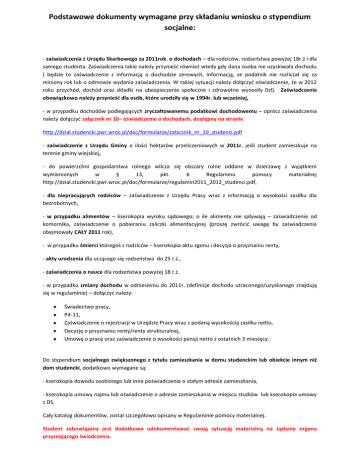 Podstawowe dokumenty wymagane przy składaniu wniosku o stypendium socjalne: - zaświadczenia z Urzędu Skarbowego za 2011rok. o dochodach – dla rodziców, rodzeństwa powyżej 18r.ż i dla samego studenta. Zaświadczenia takie należy przynieść również wtedy gdy dana osoba nie uzyskiwała dochodu ( będzie to zaświadczenie z informacją o dochodzie zerowych, informacją, ze podatnik nie rozliczał się za miniony rok lub o odmowie wydania zaświadczenia. W takiej sytuacji należy dołączyć oświadczenie, że w 2012 roku przychód, dochód oraz składki na ubezpieczenie społeczne i zdrowotne wynosiły 0zł). Zaświadczenie obowiązkowo należy przynieść dla osób, które urodziły się w 1994r. lub wcześniej, - w przypadku dochodów podlegających zryczałtowanemu podatkowi dochodowemu – oprócz zaświadczenia należy dołączyć załącznik nr 10– oświadczenie o dochodach, dostępny na stronie http://dzial.studencki.pwr.wroc.pl/doc/formularze/zalacznik_nr_10_studenci.pdf - zaświadczenie z Urzędu Gminy o ilości hektarów przeliczeniowych w 2011r. jeśli student zamieszkuje na terenie gminy wiejskiej, - do powierzchni gospodarstwa rolnego wlicza się obszary rolne oddane w dzierżawę z wyjątkiem wymienionych w § 13, pkt. 6 Regulaminu pomocy materialnej http://dzial.studencki.pwr.wroc.pl/doc/formularze/regulamin2011_2012_studenci.pdf, - dla niepracujących rodziców – zaświadczenie z Urzędu Pracy wraz z informacją o wysokości zasiłku dla bezrobotnych, - w przypadku alimentów – kserokopia wyroku sądowego; o ile alimenty nie spływają – zaświadczenie od komornika, zaświadczenie o pobieraniu zaliczki alimentacyjnej (proszę zwrócić uwagę by zaświadczenia obejmowały CAŁY 2011 rok), - w przypadku śmierci któregoś z rodziców – kserokopia aktu zgonu i decyzja o przyznaniu renty, - akty urodzenia dla uczącego się rodzeństwa do 25 r.ż., - zaświadczenia o nauce dla rodzeństwa powyżej 18 r.ż. - w przypadku zmiany dochodu w odniesieniu do 2011r. (definicje dochodu utraconego/uzyskanego znajdują się w regulaminie) – dołączyć należy: Świadectwo pracy, Pit-11, Zaświadczenie o rejestracji w Urzędzie Pracy wraz z podaną wysokością zasiłku netto, Decyzję o przyznaniu renty/renty strukturalnej, Umowę o pracę oraz zaświadczenie o wysokości pensji netto z ostatnich 3 miesięcy. Do stypendium socjalnego zwiększonego z tytułu zamieszkania w domu studenckim lub obiekcie innym niż dom studencki, dodatkowo wymagane są: - kserokopia dowodu osobistego lub inne poświadczenie o stałym adresie zamieszkania, - kserokopia umowy najmu lub oświadczenie o adresie zamieszkania w miejscu studiów lub kserokopia umowy z DS. Cały katalog dokumentów, został szczegółowo opisany w Regulaminie pomocy materialnej. Student zobowiązany jest dodatkowo udokumentować swoją sytuację materialną na żądanie organu przyznającego świadczenia.