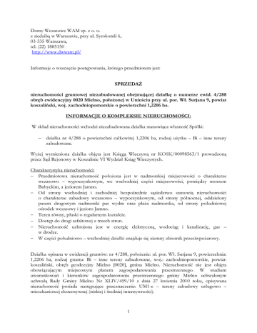 Domy Wczasowe WAM sp. z o. o. z siedzibą w Warszawie, przy ul. Syrokomli 6, 03-335 Warszawa, tel. (22) 1885150 http://www.dwwam.pl/ Informuje o wszczęciu postępowania, którego przedmiotem jest: SPRZEDAŻ nieruchomości gruntowej niezabudowanej obejmującej działkę o numerze ewid. 4/288 obręb ewidencyjny 0020 Mielno, położonej w Unieściu przy ul. por. Wł. Surjana 9, powiat koszaliński, woj. zachodniopomorskie o powierzchni 1,2206 ha. INFORMACJE O KOMPLEKSIE NIERUCHOMOŚCI: W skład nieruchomości wchodzi niezabudowana działka stanowiąca własność Spółki: − działka nr 4/288 o powierzchni całkowitej 1,2206 ha, rodzaj użytku – Bi – inne tereny zabudowane. Wyżej wymieniona działka objęta jest Księgą Wieczystą nr KO1K/00098563/1 prowadzoną przez Sąd Rejonowy w Koszalinie VI Wydział Ksiąg Wieczystych. Charakterystyka nieruchomości: − Przedmiotowa nieruchomość położona jest w nadmorskiej miejscowości o charakterze wczasowo – wypoczynkowym, we wschodniej części miejscowości, pomiędzy morzem Bałtyckim, a jeziorem Jamno. − Od strony wschodniej i zachodniej bezpośrednie sąsiedztwo stanowią nieruchomości o charakterze zabudowy wczasowo – wypoczynkowym, od strony północnej, oddzielony pasem drogowym nadmorski pas wydm oraz plaża nadmorska, od strony południowej ośrodek wczasowy i jezioro Jamno. − Teren równy, płaski o regularnym kształcie. − Dostęp do drogi asfaltowej z trzech stron. − Nieruchomość uzbrojona jest w energię elektryczną, wodociąg i kanalizację, gaz – w drodze. − W części południowo – wschodniej działki znajduje się ziemny zbiornik przeciwpożarowy. Działka opisana w ewidencji gruntów: nr 4/288, położenie: ul. por. Wł. Surjana 9, powierzchnia: 1,2206 ha, rodzaj gruntu: Bi – inne tereny zabudowane, woj.: zachodniopomorskie, powiat: koszaliński, obręb geodezyjny Mielno [0020], gmina Mielno. Nieruchomość nie jest objęta obowiązującym miejscowym planem zagospodarowania przestrzennego. W studium uwarunkowań i kierunków zagospodarowania przestrzennego gminy Mielno uchwalonym uchwałą Rady Gminy Mielno Nr XLIV/459/10 z dnia 27 kwietnia 2010 roku, opisywana nieruchomość posiada następujące przeznaczenie: UM1-e – tereny zabudowy usługowo – mieszkaniowej ekstensywnej (niskiej i średniej intensywności). 1 INFORMACJE O WARUNKACH SKŁADANIA OFERT: Szczegółowe warunki dotyczące ofert zawarte są w Wymaganiach przetargowych. Cena wywoławcza sprzedaży nieruchomości netto wynosi 3 700 000,00 zł (słownie: trzy miliony siedemset tysięcy złotych 00/100). Na dzień ogłoszenia sprzedaż nieruchomości podlega zwolnieniu z opodatkowania podatkiem od towarów i usług na podstawie art. 43 ust 1 pkt 10a ustawy o podatku od towarów i usług (tj. Dz.U. 2011r. nr 177 poz. 1054 z zm). Cena nieruchomości podlega zapłacie nie później niż do dnia zawarcia umowy przenoszącej własność. Za datę zapłaty przyjmuje się datę wpływu środków na rachunek Domy Wczasowe WAM Sp. z o.o. Oferent zobowiązany jest również do pokrycia kosztów zawarcia umowy i wszelkich innych opłat związanych z zawarciem umowy. Warunkiem przystąpienia do postępowania jest wpłacenie przez oferenta wadium w wysokości 370 000,00 zł (słownie: trzysta siedemdziesiąt tysięcy złotych 00/100) oraz dołączenie do oferty potwierdzenia wpłaty. Wadium należy wpłacić w nieprzekraczalnym terminie do dnia 27 maja 2013 r. w pieniądzu na konto Domy Wczasowe WAM Sp. z o.o. w banku Pekao S.A. nr 75 1240 6292 1111 0010 3708 8911 z zaznaczeniem celu wpłaty: „Przetarg Unieście, dz. 4/288”. Za dzień wniesienia wadium uznaje się datę wpływu żądanej kwoty na wskazane konto. Termin ważności wadium musi odpowiadać okresowi ważności oferty. Brak wpłaty wadium lub brak dołączenia do oferty kserokopii potwierdzenia wpłaty skutkuje niedopuszczeniem oferenta do przetargu. Wadium wniesione przez oferenta, którego oferta zostanie przyjęta, zalicza się na poczet ceny nabycia, a pozostałym uczestnikom zostanie zwrócone w wartości nominalnej na wskazane konto w terminie do 3 dni od dnia wyboru najkorzystniejszej oferty, jednak nie później niż w ciągu 30 dni od daty otwarcia ofert. Nieprzyjęcie ofert, unieważnienie przetargu lub zamknięcie bez wybrania którejkolwiek z ofert nie daje prawa do naliczania odsetek od wpłaconego wadium. Wadium przepada na rzecz Spółki, jeżeli żaden z oferentów nie zaoferuje co najmniej ceny wywoławczej lub jeżeli oferent, którego oferta została wybrana uchyli się od zawarcia umowy przedwstępnej lub umowy przenoszącej własność lub nie przystąpi do dodatkowego przetargu ustnego. OFERTA POWINNA ZAWIERAĆ W SZCZEGÓLNOŚCI: 1) imię, nazwisko i adres albo nazwę lub firmę oraz siedzibę oferenta; 2) datę sporządzenia oferty; 3) oferowaną cenę netto oraz sposób i termin jej zapłaty; wszelkie wartości kwotowe należy podać do dwóch miejsc po przecinku; 4) okres ważności oferty (co najmniej 6 miesięcy licząc od daty otwarcia oferty); 5) kopię dowodu wniesienia wadium w formie pieniężnej; 6) w przypadku podmiotu prowadzącego działalność gospodarczą – kserokopię aktualnego (wystawionego nie wcześniej niż 3 miesiące przed upływem terminu do składania ofert) odpisu z właściwego dla jednostki gospodarczej rejestru albo ewidencji w celu udokumentowania prawa do prowadzenia działalności gospodarczej oraz statusu jednostki; 7) w przypadku podmiotu prowadzącego działalność gospodarczą – kserokopię aktualnych (wystawionych nie wcześniej niż 3 miesiące przed upływem terminu do składania ofert) zaświadczeń właściwego naczelnika urzędu skarbowego oraz właściwego oddziału Zakładu Ubezpieczeń Społecznych (lub Kasy Rolniczego Ubezpieczenia Społecznego) potwierdzających odpowiednio, że oferent nie zalega z opłacaniem podatków, opłat oraz składek na ubezpieczenie zdrowotne i społeczne; 8) w przypadku podm