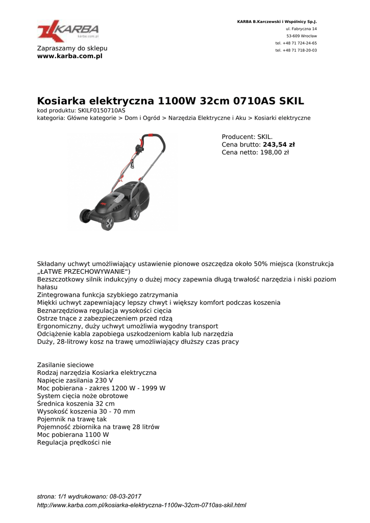 KARBA B.Karczewski i Wspólnicy Sp.J. ul. Fabryczna 14 53-609 Wrocław tel. +48 71 724-24-65 Zapraszamy do sklepu www.karba.com.pl tel. +48 71 718-20-03 Kosiarka elektryczna 1100W 32cm 0710AS SKIL kod produktu: SKILF0150710AS kategoria: Główne kategorie > Dom i Ogród > Narzędzia Elektryczne i Aku > Kosiarki elektryczne Producent: SKIL. Cena brutto: 243,54 zł Cena netto: 198,00 zł Składany uchwyt umożliwiający ustawienie pionowe oszczędza około 50% miejsca (konstrukcja „ŁATWE PRZECHOWYWANIE“) Bezszczotkowy silnik indukcyjny o dużej mocy zapewnia długą trwałość narzędzia i niski poziom hałasu Zintegrowana funkcja szybkiego zatrzymania Miękki uchwyt zapewniający lepszy chwyt i większy komfort podczas koszenia Beznarzędziowa regulacja wysokości cięcia Ostrze tnące z zabezpieczeniem przed rdzą Ergonomiczny, duży uchwyt umożliwia wygodny transport Odciążenie kabla zapobiega uszkodzeniom kabla lub narzędzia Duży, 28-litrowy kosz na trawę umożliwiający dłuższy czas pracy Zasilanie sieciowe Rodzaj narzędzia Kosiarka elektryczna Napięcie zasilania 230 V Moc pobierana - zakres 1200 W - 1999 W System cięcia noże obrotowe Średnica koszenia 32 cm Wysokość koszenia 30 - 70 mm Pojemnik na trawę tak Pojemność zbiornika na trawę 28 litrów Moc pobierana 1100 W Regulacja prędkości nie strona: 1/1 wydrukowano: 08-03-2017 http://www.karba.com.pl/kosiarka-elektryczna-1100w-32cm-0710as-skil.html