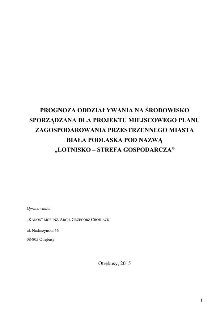PROGNOZA ODDZIAŁYWANIA NA ŚRODOWISKO SPORZĄDZANA DLA PROJEKTU MIEJSCOWEGO PLANU ZAGOSPODAROWANIA PRZESTRZENNEGO MIASTA BIAŁA PODLASKA POD NAZWĄ „LOTNISKO – STREFA GOSPODARCZA” Opracowanie: „KANON” MGR INŻ. ARCH. GRZEGORZ CHOJNACKI ul. Nadarzyńska 56 08-805 Otrębusy Otrębusy, 2015 1 SPIS TREŚCI 1. WIADOMOŚCI OGÓLNE ........................................................................................................ 4 1.1. Wstęp i podstawy prawne opracowania ....................................................................... 4 1.2. Zakres prognozy ............................................................................................................. 4 1.3. Metodyka ........................................................................................................................ 5 1.4. Materiały wejściowe ........................................................................................................ 6 1.5. Cele ochrony środowiska na szczeblu międzynarodowym, wspólnotowym i krajowym istotne z punktu widzenia niniejszego opracowania oraz sposoby, w jakich zostały uwzględnione podczas opracowywania dokumentu ................................................... 6 2. PROPOZYCJE DOTYCZĄCE PRZEWIDYWANYCH METOD ANALIZY SKUTKÓW REALIZACJI POSTANOWIEŃ PROJEKTOWANEGO DOKUMENTU ..................................................................... 9 3. INFORMACJE O MOŻLIWYM TRANSGRANICZNYM ODDZIAŁYWANIU NA ŚRODOWISKO ................. 9 4. S TAN I FUNKCJONOWANIE ŚRODOWISKA PRZYRODNICZEGO REJONU OBJĘTEGO PROJEKTEM PLANU 4.1. Krótka ................................................................................................................... 11 charakterystyka poszczególnych elementów środowiska przyrodniczego i kulturowego .......................................................................................................................... 11 4.1.1. Geomorfologia ..................................................................................................... 11 4.1.2. Budowa geologiczna ............................................................................................ 11 4.1.3. Wody podziemne i powierzchniowe.................................................................... 12 4.1.4. Gleby.................................................................................................................... 12 4.1.5. Klimat .................................................................................................................. 12 4.1.6. Roślinność ........................................................................................................... 12 4.1.7. Świat zwierząt...................................................................................................... 13 4.1.8. Walory krajobrazowe ...................................... Błąd! Nie zdefiniowano zakładki. 4.2. Obszary chronione ......................................................................................................... 13 4.3. Stan i funkcjonowanie środowiska ................................................................................. 13 4.4. Potencjalne zmiany stanu środowiska w przypadku braku realizacji postanowień planu.. ..................................................................................................................................... 14 4.5. Podstawowe uwarunkowania dla zagospodarowania wynikające z opracowania ekofizjograficznego .................................................................................................................. 15 4.6. 5. Istniejące problemy ochrony środowiska ........................................................................ 16 PROGNOZA ODDZIAŁYWANIA NA ŚRODOWISKO PROJEKTU PLANU ZAGOSPODAROWANIA PRZESTRZENNEGO ............................................................................. 18 5.1. Ustalenia projektu miejscowego planu....................................................................... 18 5.2. Przewidywane skutki wpływu ustaleń projektu planu na środowisko........................ 19 2 5.2.1. Skutki dla środowiska wynikające z projektowanego przeznaczenia terenu ....... 20 5.2.2. Wpływ ustaleń planu na poszczególne komponenty środowiska ........................ 20 5.3. 5.2.2.1. Środowisko wodno-gruntowe, wody powierzchniowe .............................. 20 5.2.2.2. Fauna .......................................................................................................... 21 5.2.2.3. Flora ........................................................................................................... 22 5.2.2.4. Bioróżnorodność ........................................................................................ 22 5.2.2.5. Powierzchnia ziemi .................................................................................... 22 5.2.2.6. Krajobraz .................................................................................................... 23 5.2.2.7. Atmosfera i klimat akustyczny ................................................................... 23 5.2.2.8. Wpływ na ludzi .......................................................................................... 23 5.2.2.9. Wpływ na obszary chronione ..................................................................... 24 Zgodność m.p.z.p. z zapisami Studium uwarunkowań i kierunków zagospodarowania przestrzennego oraz innymi dokumentami .............................................................................. 27 6. OCENA USTALEŃ PROJEKTU PLANU W ASPEKCIE OCHRONY ŚRODOWISKA ...................... 27 7. OCENA USTALEŃ PROJEKTU PLANU Z PUNKTU WIDZENIA MOŻLIWOŚCI OGRANICZENIA WPŁYWU NA ŚRODOWISKO.......................................................................................................... 27 8. WNIOSKI ...........................................................................................................................