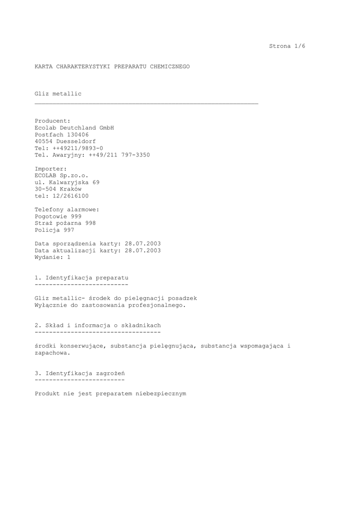 Strona 1/6 KARTA CHARAKTERYSTYKI PREPARATU CHEMICZNEGO Gliz metallic ______________________________________________________________ Producent: Ecolab Deutchland GmbH Postfach 130406 40554 Duesseldorf Tel: ++49211/9893-0 Tel. Awaryjny: ++49/211 797-3350 Importer: ECOLAB Sp.zo.o. ul. Kalwaryjska 69 30-504 Kraków tel: 12/2616100 Telefony alarmowe: Pogotowie 999 Straż pożarna 998 Policja 997 Data sporządzenia karty: 28.07.2003 Data aktualizacji karty: 28.07.2003 Wydanie: 1 1. Identyfikacja preparatu -------------------------Gliz metallic- środek do pielęgnacji posadzek Wyłącznie do zastosowania profesjonalnego. 2. Skład i informacja o składnikach ----------------------------------środki konserwujące, substancja pielęgnująca, substancja wspomagająca i zapachowa. 3. Identyfikacja zagrożeń ------------------------Produkt nie jest preparatem niebezpiecznym Strona 2/6 KARTA CHARAKTERYSTYKI PREPARATU CHEMICZNEGO Gliz metallic ______________________________________________________________ 4. Pierwsza pomoc ----------------W przypadku zatrucia przez wdychanie: Świeże powietrze W przypadku zabrudzenia skóry: Przemyć skórę pod bieżącą wodą. W przypadku zabrudzenia oczu: Przemyć natychmiast pod bieżącą wodą (min. 10 minut), w razie potrzeby skontaktować się z lekarzem okulistą. W przypadku spożycia: Pić wodę (1-2 szklanek), zasięgnąć porady lekarskiej. 5. Postępowanie w przypadku pożaru ---------------------------------Stosowne środki gaśnicze: Wszystkie zwykle stosowane środki gaśnicze Środki gaśnicze niewłaściwe ze względów bezpieczeństwa: nie są znane Szczególne zagrożenia poprzez sam produkt, jego produkty spalania lub powstające gazy: nie są znane Szczególne wyposażenie ochronne przy zwalczaniu ognia: Nie jest wymagane. 6. Postępowanie w przypadku niezamierzonego uwolnienia do środowiska -------------------------------------------------------------------Środki ostrożności w stosunku do osób: Zapewnić dobrą wentylację. Zasady ochrony środowiska naturalnego: Nie dopuścić aby produkt przedostał się do kanalizacji. Sposób czyszczenia/zbierania: Usuwać mechanicznie; pozostałość spłukać dużą ilością wody. Strona 3/6 KARTA CHARAKTERYSTYKI PREPARATU CHEMICZNEGO Gliz metallic ______________________________________________________________ 7. Postępowanie z preparatem i jego magazynowanie ------------------------------------------------Postępowanie z preparatem: Brak specjalnych wymagań Magazynowanie: Chronić przed mrozem. 8. Kontrola narażenia i środki ochrony indywidualnej ---------------------------------------------------Informacje o budowie systemu: Brak dodatkowych wymagań, patrz pkt. 7 Składniki z odnoszącymi się do stanowiska pracy, dopuszczalnymi wskaźnikami stężeń, które należy kontrolować: Brak Środki ochrony indywidualnej: Ochrona Ochrona Ochrona Ochrona układu oddechowego: nie jest wymagana rąk: nie jest wymagana oczu i twarzy: nie jest wymagana skóry: nie jest wymagana Strona 4/6 KARTA CHARAKTERYSTYKI PREPARATU CHEMICZNEGO Gliz metallic ______________________________________________________________ 9. Właściwości fizykochemiczne -----------------------------postać: zapach: pH: temperatura: wrzenia: topnienia: zapłonu: samozapłonu: zestalania: wrażliwy na niskie temperatury: palność: właściwości wybuchowe: właściwości utleniające: prężność par: gęstość względna: rozpuszczalność: w wodzie: w rozpuszczalnikach org. (współczynnik podziału n-oktanol/woda): lepkość: mleczno biała ciecz perfumowany (przy 10g/l H2O) (20'C) 8,5 (koncentrat) (20'C) 8,4 brak danych brak danych nie dotyczy nie dotyczy brak danych poniżej 0’C nie dotyczy brak brak brak danych (20'C) 1,033 g/cm3 (20'C) rozpuszczalny w wodzie brak danych (20'C) 21 sec kuweta 3mm DIN 10. Stabilność i reaktywność ---------------------------Warunki, których należy unikać: Nie są znane przy stosowaniu zgodnym z przeznaczeniem Materiały, których należy unikać: Nie są znane przy stosowaniu zgodnym z przeznaczeniem. Niebezpieczne produkty rozkładu: Nie są znane przy stosowaniu zgodnym z przeznaczeniem. 11. Informacje toksykologiczne -----------------------------Na podstawie dostępnych danych oraz bazując na wynikach analiz toksykologicznych produkt nie jest niebezpieczny dla zdrowia i życia. Strona 5/6 KARTA CHARAKTERYSTYKI PREPARATU CHEMICZNEGO Gliz metallic ______________________________________________________________ 12. Informacje ekologiczne -------------------------Dane dotyczące: mobilności: brak danych rozkładu: zawarte w produkcie środki powierzchniowo czynne ulegają biodegradacji co najmniej w 90%. kumulacji: brak danych ekotoksyczności: brak danych inne szkodliwe skutki: brak danych 13. Postępowanie z odpadami --------------------------Postępowanie z odpadami musi być uzgodnione z władzami lokalnymi. Klasyfikacja odpadów: 070199 (dotyczy produktu) Klasyfikacja odpadów: 150102 (dotyczy opakowania) Postępować z odpadami zgodnie z obowiązującymi przepisami: -USTAWA z dnia 11 maja 2001 r. o opakowaniach i odpadach opakowaniowych. -USTAWA z dnia 11 maja 2001 r. o obowiązkach przedsiębiorców w zakresie gospodarowania niektórymi odpadami oraz o opłacie produktowej i opłacie depozytowej. 14. Informacje o transporcie ---------------------------Produkt nie jest towarem niebezpiecznym według przepisów RID/ADR. 15. Informacje dotyczące przepisów prawnych ------------------------------------------Znaki ostrzegawcze: Nie dotyczy Zwroty wskazujące rodzaj zagrożenia (zwroty R): Nie dotyczy Zwroty określające warunki bezpiecznego stosowania preparatu (zwroty S): Nie dotyczy Strona 6/6 KARTA CHARAKTERYSTYKI PREPARATU CHEMICZNEGO Gliz metallic ______________________________________________________________ Przepisy prawne uwzględnione w karcie charakterystyki: -Ustawa z dnia 11 stycznia 2001 roku o substancjach i preparatach chemicznych -Rozporządzenie Ministra Środow