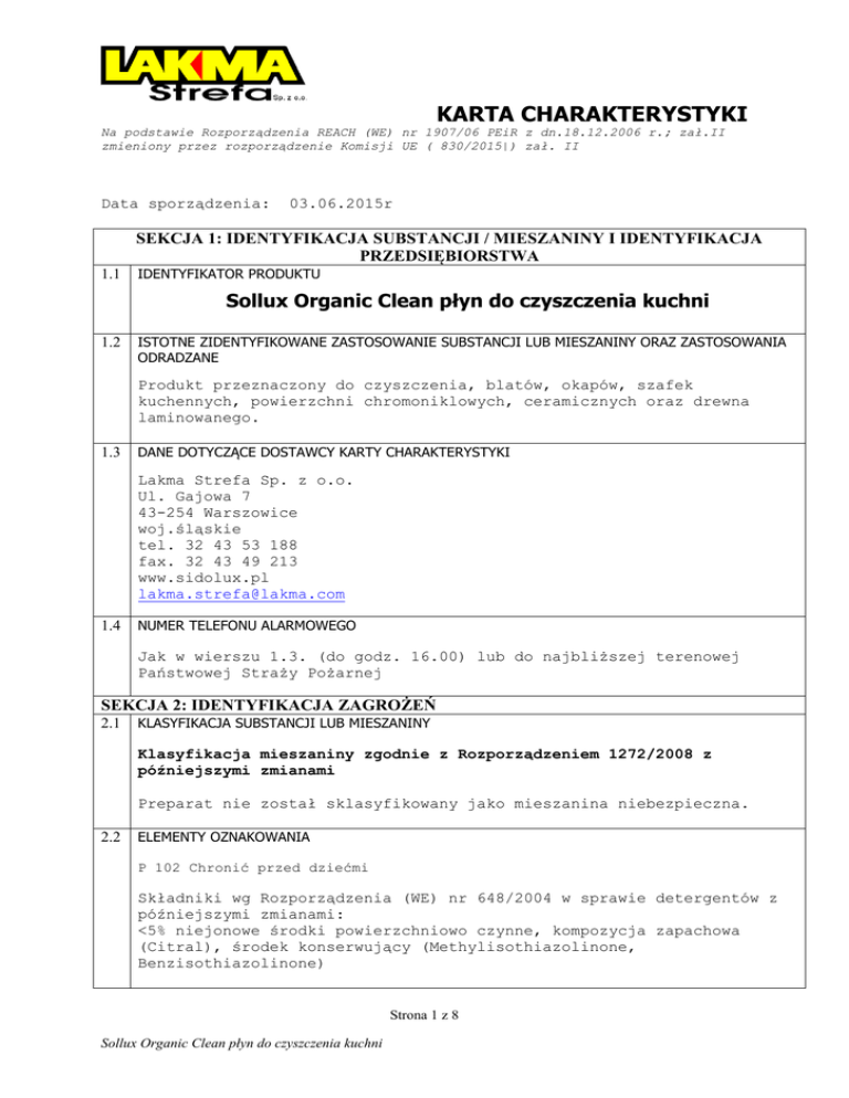 KARTA CHARAKTERYSTYKI Na podstawie Rozporządzenia REACH (WE) nr 1907/06 PEiR z dn.18.12.2006 r.; zał.II zmieniony przez rozporządzenie Komisji UE ( 830/2015|) zał. II Data sporządzenia: 03.06.2015r SEKCJA 1: IDENTYFIKACJA SUBSTANCJI / MIESZANINY I IDENTYFIKACJA PRZEDSIĘBIORSTWA 1.1 IDENTYFIKATOR PRODUKTU Sollux Organic Clean płyn do czyszczenia kuchni 1.2 ISTOTNE ZIDENTYFIKOWANE ZASTOSOWANIE SUBSTANCJI LUB MIESZANINY ORAZ ZASTOSOWANIA ODRADZANE Produkt przeznaczony do czyszczenia, blatów, okapów, szafek kuchennych, powierzchni chromoniklowych, ceramicznych oraz drewna laminowanego. 1.3 DANE DOTYCZĄCE DOSTAWCY KARTY CHARAKTERYSTYKI Lakma Strefa Sp. z o.o. Ul. Gajowa 7 43-254 Warszowice woj.śląskie tel. 32 43 53 188 fax. 32 43 49 213 www.sidolux.pl [email protected] 1.4 NUMER TELEFONU ALARMOWEGO Jak w wierszu 1.3. (do godz. 16.00) lub do najbliższej terenowej Państwowej Straży Pożarnej SEKCJA 2: IDENTYFIKACJA ZAGROŻEŃ 2.1 KLASYFIKACJA SUBSTANCJI LUB MIESZANINY Klasyfikacja mieszaniny zgodnie z Rozporządzeniem 1272/2008 z późniejszymi zmianami Preparat nie został sklasyfikowany jako mieszanina niebezpieczna. 2.2 ELEMENTY OZNAKOWANIA P 102 Chronić przed dziećmi Składniki wg Rozporządzenia (WE) nr 648/2004 w sprawie detergentów z późniejszymi zmianami: <5% niejonowe środki powierzchniowo czynne, kompozycja zapachowa (Citral), środek konserwujący (Methylisothiazolinone, Benzisothiazolinone) Strona 1 z 8 Sollux Organic Clean płyn do czyszczenia kuchni KARTA CHARAKTERYSTYKI Na podstawie Rozporządzenia REACH (WE) nr 1907/06 PEiR z dn.18.12.2006 r.; zał.II zmieniony przez rozporządzenie Komisji UE ( 830/2015|) zał. II 2.3 INNE ZAGROŻENIA Mieszanina nie jest ani PBT ( trwała, ulegająca bioakumulacji) ani vPvB ( bardzo trwała i ulegająca bioakumulacji w dużym stopniu) SEKCJA 3:SKŁAD/ INFORMACJA O SKŁADNIKACH 3.1 3.2 SUBSTANCJE Nie dotyczy MIESZANINY NIEBEZPIECZNE SKŁADNIKI MIESZANINY (WE) 1272/2008 Nazwa substancji/ INCI name D-pentoza i D-glukoza, oligomery, C8-10 alkioglukozydy Nr indeksowy Nr WE Nr CAS Nr rejestru ------- 483-960-7 68515-73-1 1235391-18-0 01-000002022090-0000 % wagowy 1 – 2,0 Klasa zagrożenia Zwroty H Eye Dam. 1 H318 SEKCJA 4: ŚRODKI PIERWSZEJ POMOCY 4.1 Opis środków pierwszej pomocy W przypadku wystąpienia jakichkolwiek niepokojących objawów wezwać natychmiast lekarza lub odwieźć poszkodowanego do szpitala, pokazać kartę charakterystyki, opakowanie produktu lub etykietę. Inhalacja W warunkach normalnych zagrożenie praktycznie nie istnieje. W warunkach awaryjnych wyprowadzić lub wynieść poszkodowanego na świeże powietrze. Kontakt z Przepłukać obficie wodą, jeżeli podrażnienie oczu oczami utrzymuje się, skonsultować się ze specjalistą. Kontakt ze Zapobiegawczo umyć wodą z mydłem. W przypadku skórą podrażnienia skóry skonsultować się z lekarzem. Połknięcie: Wypić 1-2 szklanki wody. W razie potrzeb skontaktować się z lekarzem, pokazać kartę charakterystyki, opakowanie produktu lub etykietę. Nieprzytomnej osobie nigdy nie podawać nic doustnie. 4.2 NAJWAŻNIEJSZE OSTRE I OPÓŹNIONE OBJAWY ORAZ SKUTKI NARAŻENIA Patrz pkt 11. 4.3 WSKAZANIA DOTYCZĄCE WSZELKIEJ NATYCHMIASTOWEJ POMOCY LEKARSKIEJ I SZCZEGÓLNEGO POSTĘPOWANIA Z POSZKODOWANYM Brak danych SEKCJA 5: POSTĘPOWANIE W PRZYPADKU POŻARU 5.1 ŚRODKI GAŚNICZE Dwutlenek węgla, proszki gaśnicze, gaśnica pianowa, prądy wodne rozproszone. 5.2 SZCZEGÓLNE ZAGROŻENIE ZWIĄZANE Z SUBSTANCJĄ LUB MIESZANINĄ Podczas pożaru powstają niebezpieczne dla zdrowia pary i dymy, które mogą zawierać tlenki węgla, siarki oraz związki organiczne i nieorganiczne. Nie wdychać dymów. 5.3 INFORMACJE DLA STRAŻY POŻARNEJ: Odzież gazoszczelna i aparaty izolujące drogi oddechowe nie zależne od otaczającego powietrza. SEKCJA 6: POSTĘPOWANIE W PRZYPADKU NIEZAMIERZONEGO UWOLNIENIA DO ŚRODOWISKA 6.1 INDYWIDUALNE ŚRODKI OCHRONY, WYPOSAŻENIE OCHRONNE I PROCEDURY W Strona 2 z 8 Sollux Organic Clean płyn do czyszczenia kuchni KARTA CHARAKTERYSTYKI Na podstawie Rozporządzenia REACH (WE) nr 1907/06 PEiR z dn.18.12.2006 r.; zał.II zmieniony przez rozporządzenie Komisji UE ( 830/2015|) zał. II SYTUACJACH AWARAYJNYCH Nie dopuszczać osób postronnych i nieupoważnionych. Unikać bezpośredniego kontaktu z produktem, zapewnić wentylację, stosować odpowiednie środki ochrony indywidualnej, patrz pkt.8. 6.2 ŚRODKI OSTROŻNOŚCI W ZAKRESIE OCHRONY ŚRODOWISKA Zapobiegać zanieczyszczeniu gleby i wody oraz przedostaniu się do kanalizacji, rowów lub rzek. 6.3 6.4 METODY I MATERIAŁY ZAPOBIEGAJĄCE ROZPRZESTRZENIANIU SIĘ SKAŻENIA I SŁUŻĄCE DO USUWANIA SKAŻENIA Niewielkie ilości uwolnionego materiału zetrzeć papierowym ręcznikiem i umieścić w pojemniku na odpady. Duże ilości uwolnionego produktu przesypać materiałem pochłaniającym (piasek, ziemia okrzemkowa, trociny) i zebrać do oznakowanego pojemnika na odpady. Miejsce wycieku zmyć starannie wodą ODNIESIENIA DO INNYCH SEKCJI Informacje dotyczące odpowiedniego sprzętu ochrony osobistej podano w sekcji 8 Informacje dotyczące usuwania odpadów podano w sekcji 13 SEKCJA 7: POSTĘPOWANIE Z SUBSTANCJAMI I MIESZANINAMI ORAZ ICH MAGAZYNOWANIE 7.1 ŚRODKI OSTROŻNOŚCI DOTYCZĄCE BEZPIECZNEGO POSTĘPOWANIA Postępować zgodnie z ogólnymi zasadami bezpieczeństwa i higieny pracy z substancjami chemicznymi oraz dobrej praktyki przemysłowej; ściśle przestrzegać opracowanych procedur postępowania oraz wszelkich zaleceń producenta; podczas pracy z produktem należy stosować ogólne przepisy bezpieczeństwa i higieny pracy zawarte w Rozporządzeniu Ministra Pracy i Polityki Socjalnej z dnia 26 września 1997 r. w sprawie ogólnych przepisów bezpieczeństwa i higieny pracy (Dz.U. nr 129/1997, poz. 844)wraz z późniejszymi zmianami. 7.2 WARUNKI BEZPIECZNEGO MAGAZYNOWANIA, ŁĄCZNIE Z INFORMACJAMI DOTYCZĄCYMI WSZELKICH WZAJEMNYCH NIEZGODNOŚCI Magazynować w pomieszczeniu z wentylac