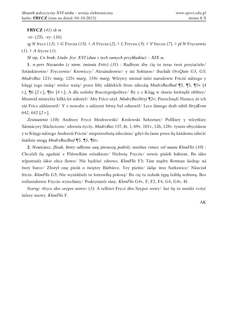 Słownik polszczyzny XVI wieku - wersja elektroniczna hasło: FRYCZ (stan na dzień: 04-10-2015) www.spxvi.edu.pl strona 1/1 FRYCZ (41) sb m -ri- (25), -ry- (16). sg N frycz (12). ◊ G Frycza (15). ◊ A Frycza (2). ◊ L Fryczu (3). ◊ V fryczu (7). ◊ pl N Fryczowie (1). ◊ A frycze (1). Sł stp, Cn brak, Linde: fryc XVI (dwa z tych samych przykładów) ‒ XIX w. 1. n-pers Nazwisko (z niem. imienia Fritz) (31) : Radbym áby ćię tu teraz twoi przyiaćiele/ Sztánkárowie/ Fryczowie/ Krowiccy/ Alexándrowie/ y ini Sektarze/ ſłucháli OrzQuin G3, G3; ModrzBaz 121v marg, 125v marg, 134v marg; Wſzytcy niemal inſzi narodowie Fricżá náſzego y kśięgi iego znáią/ wielce ważą/ przez liſty zdálekich ſtron zálecáią ModrzBazBud ¶5, ¶5, ¶5v [4 r.], ¶6 [2 r.], ¶6v [4 r.]; A dla ozdoby Rzecżypoſpolitey/ By y z Kśiąg w sławie kwitnęłá obfitey/ Monwid ninieyſzy kilká ſet náłożył/ Aby Fricż ożył. ModrzBazStryj ¶2v; Pierzchnęli Niemcy áż ich záś Fricz záſtánowił/ Y z nowuby z náſzymi bitwę był odnowił/ Lecz ſámego drab zábił StryjKron 642, 642 [2 r.]. Zestawienie (10): Andrzey Frycż Modrzewski/ Krolewski Sekretarz/ Polſkiey y wſzytkiey Sármácyey Sláchcicom/ zdrowia życży. ModrzBaz 137, kt, 1, 69v, 101v, 126, 128v. tymże obycżáiem y te Kśięgi náſzego Andrzeiá Fricżá/ niepotrzebuią zálecánia/ gdyż ſie ſame przez ſię káżdemu zálećić ſnádnie mogą ModrzBazBud ¶5, ¶5, ¶6v. 2. Nowicjusz, flisak, który odbywa swą pierwszą podróż; novitius remex vel nauta KlonFlis (10) : Chceſzli ſię zgadzáć z Fliſowſkim orſzakiem/ Niebożę Frycżu/ zowże piaſek hakiem. Bo iáko wſpomniſz iákie obce ſłowo/ Nie będźieć zdrowo. KlonFlis F3; Tám mądry Rotman śiedząc ná ſwey barce/ Złożył onę pieśń o świętey Bárbárce. Tey pieśni/ iádąc imo Sarkawice/ Náucżał fricże. KlonFlis G3; Nie wynidźieſz tu łotrowſką pokorą/ Bo cię tu iednák tępą ſzáblą wzbiorą. Bez roźlaniakrwie Frycżu wyiechány/ Podeymieſz rány. KlonFlis G4v, F, F2, F4, G4, G4v, H. Szereg: »frycz abo szyper nowy« (1): A ieſliżeś Frycż ábo Szyper nowy/ Iuż ſię tu muśiſz vcżyć inſzey mowy. KlonFlis F. AK