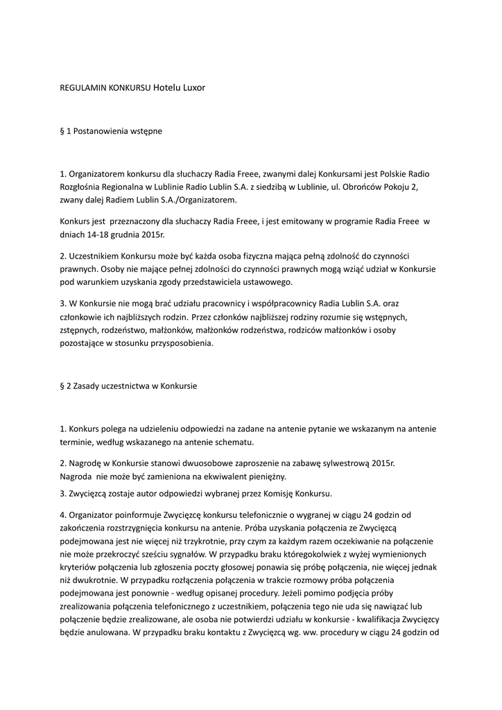 REGULAMIN KONKURSU Hotelu Luxor § 1 Postanowienia wstępne 1. Organizatorem konkursu dla słuchaczy Radia Freee, zwanymi dalej Konkursami jest Polskie Radio Rozgłośnia Regionalna w Lublinie Radio Lublin S.A. z siedzibą w Lublinie, ul. Obrońców Pokoju 2, zwany dalej Radiem Lublin S.A./Organizatorem. Konkurs jest przeznaczony dla słuchaczy Radia Freee, i jest emitowany w programie Radia Freee w dniach 14-18 grudnia 2015r. 2. Uczestnikiem Konkursu może być każda osoba fizyczna mająca pełną zdolność do czynności prawnych. Osoby nie mające pełnej zdolności do czynności prawnych mogą wziąć udział w Konkursie pod warunkiem uzyskania zgody przedstawiciela ustawowego. 3. W Konkursie nie mogą brać udziału pracownicy i współpracownicy Radia Lublin S.A. oraz członkowie ich najbliższych rodzin. Przez członków najbliższej rodziny rozumie się wstępnych, zstępnych, rodzeństwo, małżonków, małżonków rodzeństwa, rodziców małżonków i osoby pozostające w stosunku przysposobienia. § 2 Zasady uczestnictwa w Konkursie 1. Konkurs polega na udzieleniu odpowiedzi na zadane na antenie pytanie we wskazanym na antenie terminie, według wskazanego na antenie schematu. 2. Nagrodę w Konkursie stanowi dwuosobowe zaproszenie na zabawę sylwestrową 2015r. Nagroda nie może być zamieniona na ekwiwalent pieniężny. 3. Zwycięzcą zostaje autor odpowiedzi wybranej przez Komisję Konkursu. 4. Organizator poinformuje Zwycięzcę konkursu telefonicznie o wygranej w ciągu 24 godzin od zakończenia rozstrzygnięcia konkursu na antenie. Próba uzyskania połączenia ze Zwycięzcą podejmowana jest nie więcej niż trzykrotnie, przy czym za każdym razem oczekiwanie na połączenie nie może przekroczyć sześciu sygnałów. W przypadku braku któregokolwiek z wyżej wymienionych kryteriów połączenia lub zgłoszenia poczty głosowej ponawia się próbę połączenia, nie więcej jednak niż dwukrotnie. W przypadku rozłączenia połączenia w trakcie rozmowy próba połączenia podejmowana jest ponownie - według opisanej procedury. Jeżeli pomimo podjęcia próby zrealizowania połączenia telefonicznego z uczestnikiem, połączenia tego nie uda się nawiązać lub połączenie będzie zrealizowane, ale osoba nie potwierdzi udziału w konkursie - kwalifikacja Zwycięzcy będzie anulowana. W przypadku braku kontaktu z Zwycięzcą wg. ww. procedury w ciągu 24 godzin od zakończenia rozstrzygnięcia konkursu na antenie nagroda przepada na rzecz Organizatora, bez prawa Zwycięzcy do wynagrodzenia, odszkodowania lub innego rodzaju zadośćuczynienia z tego tytułu. 5. Nagroda będzie do odebrania przez laureata konkursu w siedzibie Radia Lublin, przy ul. Obrońców Pokoju 2, w Lublinie, w terminie nie później niż 7 dni od daty wygranej, tj. poinformowania uczestnika o zwycięstwie. Organizator nie ponosi odpowiedzialności w przypadku nie odebrania nagrody przez Zwycięzcę konkursu. 6. Administratorem danych osobowych przetwarzanych w związku z realizacją Konkursu jest organizator - Radio Lublin S.A. Dane osobowe przekazane Organizatorowi przez uczestników konkursu będą przetwarzane przez Organizatora tylko i wyłącznie w celu realizacji konkursu i doręczenia nagród. Podanie danych osobowych jest dobrowolne, jednak ich niepodanie uniemożliwia otrzymanie nagrody w konkursie. W celu przekazania Nagrody, Zwycięzca, po otrzymaniu informacji o wygranej, jest zobowiązany podać swoje dane osobowe tj. imię, nazwisko i miejsce zamieszkania oraz wyrazić zgodę na przetwarzanie danych osobowych. Każdy uczestnik konkursu posiada prawo wglądu do swoich danych osobowych oraz do ich poprawiania. Dane osobowe będą przetwarzane zgodnie z przepisami ustawy z dnia 29 sierpnia 1997r. o ochronie danych osobowych (t.j.: Dz.U. z 2014 r., poz. 1182), na co każdy uczestnik konkursu wyraża zgodę. 7. Wygrane o wartości nie przekraczającej kwoty ustalonej na podstawie art. 21 ust. 1 pkt 68 ustawy z dnia 26 lipca 1991 roku o podatku dochodowym od osób fizycznych (Dz. U. z 2012 r., poz. 361, ze zm.), tj. kwoty 760 zł, są wolne od podatku dochodowego. 8. Organizator nie ponosi odpowiedzialności za przypadki zgłoszeń w Konkursie przez osoby nieuprawnione. § 3 Reklamacje 1. Reklamacje związane z Konkursem mogą być kierowane do Radia Lublin S.A. wyłącznie w formie pisemnej, w terminie 3 dni od daty zakończenia danego Konkursu. 2. Reklamacja powinna zawierać imię, nazwisko, nr Karty Radia Lublin (jeśli uczestnik posiada), dokładny adres jak również dokładny opis i powód reklamacji. 3. W przypadku przesłania reklamacji złożonej za pośrednictwem poczty, decyduje data doręczenia przesyłki. 4. Złożone przez uczestników reklamacje będą rozpatrywane nie później niż w terminie 3 dni od daty otrzymania reklamacji. 5. Zainteresowani uczestnicy zostaną powiadomieni o rozpatrzeniu reklamacji listem poleconym najpóźniej w ciągu 7 dni roboczych od daty rozpatrzenia reklamacji. 6. Spory odnoszące się i wynikające z Konkursu będą rozwiązywane przez Radio Lublin S.A. Wszelkie decyzje Radia Lublin S.A. będą wiążące i ostateczne. § 4 Komisja Konkursowa. Wykluczenia z udziału w Konkursach 1. Kontrola poprawności prowadzenia Konkursu i jego zgodności z postanowieniami regulaminu spoczywa na dwuosobowej Komisji konkursowej. Decyzje w/w Komisja podejmuje wspólnie; w razie braku jednomyślności członków Komisji przy podejmowaniu decyzji rozstrzyga Redaktor Naczelny Radia Lublin S.A. sprawujący pieczę nad Konkursami organizowanymi przez Radio Lublin S.A. 2. Decyzje Komisji dotyczące rozstrzygnięć Konkursu są ostateczne. 3. Radio Lublin S.A. ma prawo w każdym momencie trwania Konkursów wykluczyć z udziału w nim (w tym odmówić przyznania nagrody) uczestnika, w stosunku do którego podjęło uzasadnione podejrzenie o działalności sprzecznej z niniejszym regulaminem. 4. Każdy uczestnik konkursu w bieżącej edycji konkursu może zostać nagr