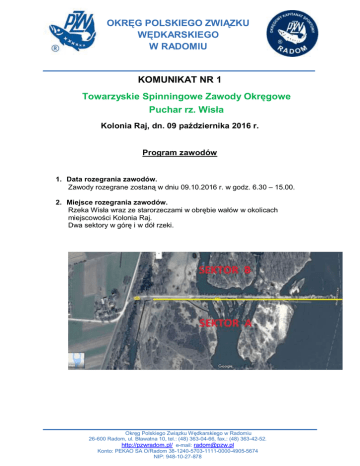 OKRĘG POLSKIEGO ZWIĄZKU WĘDKARSKIEGO W RADOMIU KOMUNIKAT NR 1 Towarzyskie Spinningowe Zawody Okręgowe Puchar rz. Wisła Kolonia Raj, dn. 09 października 2016 r. Program zawodów 1. Data rozegrania zawodów. Zawody rozegrane zostaną w dniu 09.10.2016 r. w godz. 6.30 – 15.00. 2. Miejsce rozegrania zawodów. Rzeka Wisła wraz ze starorzeczami w obrębie wałów w okolicach miejscowości Kolonia Raj. Dwa sektory w górę i w dół rzeki. Okręg Polskiego Związku Wędkarskiego w Radomiu 26-600 Radom, ul. Bławatna 10, tel.: (48) 363-04-66, fax.: (48) 363-42-52. http://pzwradom.pl/ e-mail: [email protected] Konto: PEKAO SA O/Radom 38-1240-5703-1111-0000-4905-5674 NIP: 948-10-27-878 OKRĘG POLSKIEGO ZWIĄZKU WĘDKARSKIEGO W RADOMIU 3. Biuro zawodów Biuro zawodów znajdować się będzie z lewej strony główki promowej w miejscowości Kolonia Raj. 4. Zgłoszenie i prawo startu. Prawo startu w zawodach mają członkowie Okręgu PZW w Radomiu, którzy zostali zgłoszeni przez macierzyste Koła i Kluby – Prezesów, Wiceprezesów ds. Sportu, Kapitanów Sportowych lub osoby przez nich upoważnione. Warunkiem startu w zawodach jest pisemne zgłoszenie udziału na obowiązującym formularzu zgłoszeniowym do dnia 06.10.2016 r. (czwartek) do godz. 1600w formie: - e-maila wysłanego na adres [email protected] - listu bądź faksu złożonego lub wysłanego na adres Biura Zarządu Okręgu PZW w Radomiu. Zgłoszenie musi zawierać: nazwę Koła lub Klubu,imię i nazwisko osoby startującej - w przypadku zgłoszenia indywidualnego; nazwę Koła lub Klubu, imię i nazwisko członków drużyny w przypadku zgłoszenia drużynowego; Regulamin nie przewiduje zmian barw Klubowych i Kołowych. Koła i Klubymają prawo zgłaszania kilku drużyn i oznaczają je kolejno I, II, III, itd. Okręg Polskiego Związku Wędkarskiego w Radomiu 26-600 Radom, ul. Bławatna 10, tel.: (48) 363-04-66, fax.: (48) 363-42-52. http://pzwradom.pl/ e-mail: [email protected] Konto: PEKAO SA O/Radom 38-1240-5703-1111-0000-4905-5674 NIP: 948-10-27-878 OKRĘG POLSKIEGO ZWIĄZKU WĘDKARSKIEGO W RADOMIU Zawodnicy i drużyny, które nie zostały zgłoszone w ww. sposób lub po ustalonym terminie nie mają prawa startu w zawodach. Za udział w zawodach o Puchar rzeki Wiły koszty uczestnictwa swoich zawodników pokrywają Koła i Kluby. Koła i Kluby, które zgłosiły zawodników zostaną obciążeni opłatą za start zawodnika nawet w przypadku niestawienia się zawodnika do zawodów, także z powodów usprawiedliwionych. Zawodnicy startujący w zawodach muszą posiadać aktualną kartę wędkarską oraz stosowne zezwolenie na amatorski połów ryb na 2016 rok. 5. Zasady finansowania. Opłata startowa wynosi 30 zł. za zawodnikai jest pokrywana przez macierzyste Koła i Kluby. 6. Sprzęt stosowany w zawodach. W zawodach dozwolone jest używanie sprzętu omówionego w „Zasadach organizacji wędkarskiego sportu kwalifikowanego w PZW” wg zapisów na stronie: http://www.pzw.org.pl/gks/wiadomosci/29812/67/zasady_organizacji_wedkar skiego_sportu_kwalifikowanego_pzw 7. Formuła zawodów. Zawody zostaną rozegrane w jednej turze i prowadzona będzie klasyfikacja indywidualna oraz klasyfikacja drużynowa. Drużyna składa się z dwóch zawodników.Juniorzy startują z seniorami, przy czym zawodnicy nie mający 16 lat obowiązkowo uczestniczą w zawodach z opiekunem. Zawody zaliczane będą do klasyfikacji Grand Prix Okręgu w dyscyplinie spinningowej. 8. Organizator zawodów. Organizatorem Zawodów jest Okręgowy Kapitanat Sportowy działający przy wsparciu pracowników Biura ZO. Organizatorem Technicznym jest Koło PZW nr 25Radom Miasto. Organizator zapewnia napoje, opiekę medyczną w czasie zawodów oraz posiłek po zawodach. 9. Komisja sędziowska zawodów. W skład Komisji Sędziowskiej zawodów wchodzą: Kol. Jerzy BANASZEK– Sędzia Główny. Pozostali członkowie Komisji Sędziowskiej przedstawieni zostaną podczas odprawy w dniu zawodów. Okręg Polskiego Związku Wędkarskiego w Radomiu 26-600 Radom, ul. Bławatna 10, tel.: (48) 363-04-66, fax.: (48) 363-42-52. http://pzwradom.pl/ e-mail: [email protected] Konto: PEKAO SA O/Radom 38-1240-5703-1111-0000-4905-5674 NIP: 948-10-27-878 OKRĘG POLSKIEGO ZWIĄZKU WĘDKARSKIEGO W RADOMIU 10. Szczegółowy program zawodów. Niedziela 09.10.2016 r. 6.30 – przyjmowanie zgłoszeń, sprawdzanie listy obecności 7.00 – uroczyste otwarcie zawodów, losowanie sektorów i stanowisk, 7.30 - pierwszy sygnał – podawany jest minimum 30 minut przed rozpoczęciem tury zawodów i oznacza zezwolenie na wyjście zawodników na wybrane stanowiska w sektorze. 8.00 - drugi sygnał – oznacza rozpoczęcie tury zawodów, 14.00 - trzeci sygnał – oznacza zakończenie tury zawodów. Po tym sygnale w zawodach rozgrywanych z brzegu obowiązuje zawodników określony czas (30 minut) na zdanie kart startowych sędziemu. 11. Regulamin zawodów. Zawody zostaną rozegrane z poszanowaniem zasad Regulaminu AmatorskiegoPołowu Ryb w oparciu o Regulamin zawodów spinningowych, zgodnie z zasadamisportu kwalifikowanego. http://pzwradom.pl/przepisy-sportowe/ 12. Nagrody w zawodach. W zawodach przewidziane są następujące nagrody: - dla zawodników zajmujących 1- 3 miejsce w klasyfikacji indywidualnej przewidzianesą puchary okolicznościowe, - zawodnicy sklasyfikowanych na miejscach 1-6 w klasyfikacji indywidualnej otrzymują dyplomy pamiątkowe, - zawodnicy sklasyfikowani na miejscach 1-6 w klasyfikacji indywidualnej otrzymują certyfikat o poniższej wartości: - I miejsce – 300 zł. - II miejsce – 200 zł. - III miejsce – 100 zł. - miejsca IV-VI – 50 zł. Certyfikaty upoważniają do zakupu dowolnego sprzęty sportowego i który zostanie rozliczony przez Biuro Zarządu Okręgu. - dla zawodników zajmujących 1- 3 miejsce w klasyfikacji drużynowej przewidziane są puchary okolicznościowe dla drużyny, - zawodnicy sklasyfikowanych na miejscach 1-6 w klasyfikacji drużynowej otrzymują dyplomy 