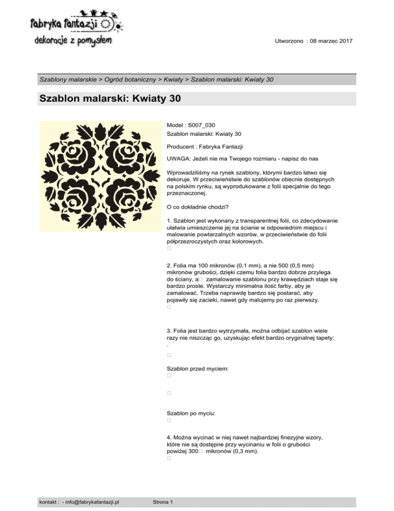Utworzono : 08 marzec 2017 Szablony malarskie > Ogród botaniczny > Kwiaty > Szablon malarski: Kwiaty 30 Szablon malarski: Kwiaty 30 Model : S007_030 Szablon malarski: Kwiaty 30 Producent : Fabryka Fantazji UWAGA: Jeżeli nie ma Twojego rozmiaru - napisz do nas Wprowadziliśmy na rynek szablony, którymi bardzo łatwo się dekoruje. W przeciwieństwie do szablonów obecnie dostępnych na polskim rynku, są wyprodukowane z folii specjalnie do tego przeznaczonej. O co dokładnie chodzi? 1. Szablon jest wykonany z transparentnej folii, co zdecydowanie ułatwia umieszczenie jej na ścianie w odpowiednim miejscu i malowanie powtarzalnych wzorów, w przeciwieństwie do folii półprzezroczystych oraz kolorowych. � 2. Folia ma 100 mikronów (0,1 mm), a nie 500 (0,5 mm) mikronów grubości, dzięki czemu folia bardzo dobrze przylega do ściany, a� zamalowanie szablonu przy krawędziach staje się bardzo proste. Wystarczy minimalna ilość farby, aby je zamalować. Trzeba naprawdę bardzo się postarać, aby pojawiły się zacieki, nawet gdy malujemy po raz pierwszy. � 3. Folia jest bardzo wytrzymała, można odbijać szablon wiele razy nie niszcząc go, uzyskując efekt bardzo oryginalnej tapety: . � Szablon przed myciem: � � Szablon po myciu: � 4. Można wycinać w niej nawet najbardziej finezyjne wzory, które nie są dostępne przy wycinaniu w folii o grubości powiżej 300� mikronów (0,3 mm). � kontakt : - [email protected] Strona 1 Utworzono : 08 marzec 2017 Szablony malarskie > Ogród botaniczny > Kwiaty > Szablon malarski: Kwiaty 30 Szablon malarski: Kwiaty 30 5. Folia nie zapamiętuje kształtu opakowania w którym jest wysyłana, a później przechowywana, dzięki czemu szablon idealnie przylega do ściany i żadne jego elementy nie odstają. 6. Folia, jest bardzo lekka, dlatego łatwo sie maluje, gdyż nie musisz jej trzymać, nawet malując sufit.� Do mocowania folii na ścianie służy specjalny klej w spray'u (który nie zostawia żadnych śladów). Po skończonym malowaniu wystarczy delikatnie zdjąć szablon ze ściany i gotowe! Szablony wykonane z grubej folii są ciężkie i nie utrzymają się na kleju. Wraz z szablonem dodatkowo otrzymasz dokładną instrukcję malowania do danego wzoru oraz jego przykładowe wersje kolorystyczne. Dodatkowo na naszej stronie znajdziesz obszerne poradniki, które poprawadzą Cię za rękę i krok po kroku dowiesz się, co trzeba zrobić, aby Twój malowany projekt był udany. Szukaj pod hasłami: � "Jak malować?"������� oraz������� "Malowane Projekty" A co jeżeli mam pomysł na własny szablon? - Jest możliwe wykonanie szablonu na podstawie Twojego pomysłu.� A resztę pozostaw nam ;) Wykonujemy szablony na zamówienie dla artystów, dekoratorów wnętrz, architektów. Tu czytaj o wizualizacjach i wzorach dopasowanych do Ciebie. W celu przyklejenia szablonu do ściany, należy użyć proponowanego przez nas kleju do repozycjonowania, sprawdzonego przez artystów i plastyków. Dzięki niemu, każdy najdrobniejszy element szablonu zostanie dokładnie przytwierdzony, a ryzyko podcieknięcia farby nie wystąpi. Kupując szablon firmy Fabryka Fantazji masz 100% gwarancję jakości sprzedawanych szablonów, farb, pędzli i wszystkich innych akcesoriów. Jeżeli masz zastrzeżenia do naszych produktów, pamiętaj, że masz prawo do zwrotu w ciągu 10 dni od dostarczenia produktu do Ciebie. Nic nie ryzykujesz. � kontakt : - [email protected] Strona 2 Utworzono : 08 marzec 2017 Szablony malarskie > Ogród botaniczny > Kwiaty > Szablon malarski: Kwiaty 30 Szablon malarski: Kwiaty 30 Cena : 43,35 zł Brutto ( 35,25 zł Netto) Dostępne opcje Szablon malarski: Kwiaty 30 : Rozmiar szablonu 38 x 38 cm. Dostępność: Produkt dostępny w naszym sklepie od 07 luty 2009 kontakt : - [email protected] Strona 3