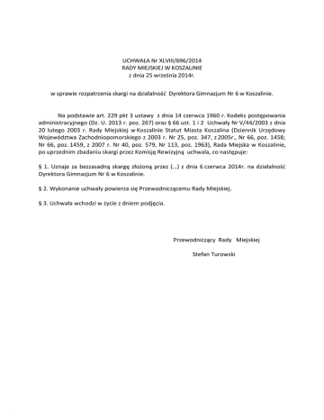 UCHWAŁA Nr XLVIII/696/2014 RADY MIEJSKIEJ W KOSZALINIE z dnia 25 września 2014r. w sprawie rozpatrzenia skargi na działalność Dyrektora Gimnazjum Nr 6 w Koszalinie. Na podstawie art. 229 pkt 3 ustawy z dnia 14 czerwca 1960 r. Kodeks postępowania administracyjnego (Dz. U. 2013 r. poz. 267) oraz § 66 ust. 1 i 2 Uchwały Nr V/44/2003 z dnia 20 lutego 2003 r. Rady Miejskiej w Koszalinie Statut Miasta Koszalina (Dziennik Urzędowy Województwa Zachodniopomorskiego z 2003 r. Nr 25, poz. 347, z 2005r., Nr 66, poz. 1458; Nr 66, poz. 1459, z 2007 r. Nr 40, poz. 579, Nr 113, poz. 1963), Rada Miejska w Koszalinie, po uprzednim zbadaniu skargi przez Komisję Rewizyjną uchwala, co następuje: § 1. Uznaje za bezzasadną skargę złożoną przez (…) z dnia 6 czerwca 2014r. na działalność Dyrektora Gimnazjum Nr 6 w Koszalinie. § 2. Wykonanie uchwały powierza się Przewodniczącemu Rady Miejskiej. § 3. Uchwała wchodzi w życie z dniem podjęcia. Przewodniczący Rady Miejskiej Stefan Turowski UZASADNIENIE W dniu 06.06.2014r. do Rady Miejskiej w Koszalinie wpłynęła skarga (…) zwanego w dalszej części Skarżącym), na dyrektora Gimnazjum nr 6 w Koszalinie. Skarżący działający jako organizacja związkowa wniósł skargę na Dyrektora Gimnazjum Nr 6 w Koszalinie oraz zwrócił się z wnioskiem o wszczęcie stosownych postępowań dyscyplinarnych wobec Dyrektora. Ponadto wniósł o wyznaczenie mediatora przez organ prowadzący, celem próby załagodzenia sytuacji oraz podjęcia zdecydowanych działań. Zarzuty zawarte w skardze dotyczą naruszenia przez Dyrektora prawa pracy, prawa pracowników, prawa oświatowego, dobra uczniów oraz materii funkcjonowania placówki. Do skargi załączone zostały: pismo z Kuratorium Oświaty w Szczecinie z dnia 22.04.2014r. (KO.I.K.5533.5.1.2014.IKĆ, trzy protokoły z Państwowej Inspekcji Pracy Oddział w Koszalinie z 26.03.2014r. (Nr rej. 14165-4600-Sw200-Sa07/14, 14165-4600-Sw200-Sa08/14, 141654600-Sw200-Sa09/14). W stanowisku do skargi z dnia 03.07.2014r. Prezydent Miasta Koszalina wskazuje, że w sprawie konfliktu panującego w Gimnazjum nr 6 w Koszalinie rozpatrywana była skarga złożona przez nauczycieli – pracowników ww. gimnazjum. Zarzuty występujące w skardze rozpatrzono w trybie skargowym przez Komisję Rewizyjną Rady Miejskiej w Koszalinie. Sytuacja została dokładnie przeanalizowana, z uwzględnieniem wyników kontroli dokonanej przez: - Kuratorium Oświaty w Szczecinie – Delegatura w Koszalinie, - Państwową Inspekcję Pracy - Biuro Kontroli Urzędu Miejskiego w Koszalinie (dokonaną na wniosek Dyrektora Gimnazjum Nr 6 w Koszalinie). Po przeprowadzonej kontroli przez Kuratorium Oświaty, organ kontrolny zobowiązał Dyrektora Gimnazjum Nr 6 w Koszalinie do wykonania poniższych zaleceń: 1) zgodnie z art. 43 ust. 2 ustawy z dnia 07.09.1991r. o systemie oświaty ustalić regulamin działalności Rady Pedagogicznej, w tym zasady protokołowania spotkań; 2) uaktualnić statut szkoły zgodnie z rozporządzeniem Ministra Edukacji Narodowej z dnia 21.05.2001r. w sprawie ramowych statutów publicznego przedszkola oraz publicznych szkół, uwzględniając aktualne zmiany w prawie oświatowym; 3) zgodnie z załącznikiem nr 4 rozporządzenia Ministra Edukacji Narodowej z dnia 27.08.2012r. w sprawie podstawy programowej wychowania przedszkolnego oraz kształcenia ogólnego w poszczególnych typach szkół, zapewnić uczniom, którzy uczyli się w szkole podstawowej języka niemieckiego, kontynuację tego języka w gimnazjum na poziomie III.1. Termin realizacji zaleceń pokontrolnych ustalono do dnia 27.02.2014r. W dniu 27.02.2014r. Dyrektor Szkoły zawiadomiła Zachodniopomorskiego Kuratora Oświaty o zrealizowaniu zaleceń pokontrolnych: 1) uchwałą Rady Pedagogicznej nr 12/2013/2014 z dnia 3.02.2014r. przyjęto Regulamin Rady Pedagogicznej Gimnazjum Nr 6 im. „Polskich Nauczycieli Tajnego Nauczania w latach 1939-1945”; 2) w dniu 26 lutego 2014r. zarządzeniem Dyrektora, przyjęto tekst jednolity Statutu Gimnazjum, zawierający aktualizacje dokonane na posiedzeniu Rady Pedagogicznej w dniu 3.02.2014r. oraz w dniu 26.02.2014r.; 3) zapewniono uczniom, którzy uczyli się w szkole podstawowej języka niemieckiego kontynuację tego języka w gimnazjum. W wyniku kontroli dokonanej przez Biuro Kontroli Urzędu Miejskiego nie potwierdzono naruszenia praw nauczycieli, a zalecenia dotyczyły drobnych uchybień i zostały natychmiast wykonane przez Dyrektora szkoły. Po kontroli przeprowadzonej przez Państwową Inspekcję Pracy Oddział w Koszalinie wydano dwa nakazy, które również niezwłocznie zostały wykonane. Ponadto, wskazano, że po zapoznaniu się z treścią skargi, wystąpiono do Zarządu Ogniska Związku Nauczycielstwa Polskiego w Gimnazjum nr 6 w Koszalinie o zajęcie stanowiska w przedmiotowej sprawie. W dniu 01.07.2014r. do Urzędu Miejskiego w Koszalinie wpłynęła odpowiedź Prezesa Ogniska Związku Nauczycielstwa Polskiego w Gimnazjum nr 6 w Koszalinie, podpisana przez wszystkich członków, w której zdecydowanie nie zgadzają się z treścią skargi, wręcz wyrażają sprzeciw wobec zawartych w niej zarzutów. Kopia pisma została przekazana Komisji Rewizyjnej Rady Miejskiej w Koszalinie. W związku z powyższym, Prezydent Miasta Koszalina wnosi o uznanie skargi złożonej na Dyrektora Gimnazjum Nr 6 w Koszalinie za bezzasadną. Komisja Rewizyjna Rady Miejskiej w Koszalinie zbadała zasadność skargi na posiedzeniu w dniu 04.09.2014r. w którym uczestniczyła Skarżąca. Zarzuty wskazane w skardze zostały podtrzymano oraz wskazano, że celem Skarżącego jest zakończenie sporu i konfliktu trwającego od dłuższego czasu pomiędzy kilkoma nauczycielami z Gimnazjum nr 6, a Dyrektorem placówki. Nie wniesiono nowych zarzutów. Skarżąca zwróciła się z wnioskiem o uznanie skargi za zasadną. Na wstępie wskazano, że zarzuty skierowane względem Dyrektora Gimnazjum nr 6 w Koszalinie sformułowane przez tr