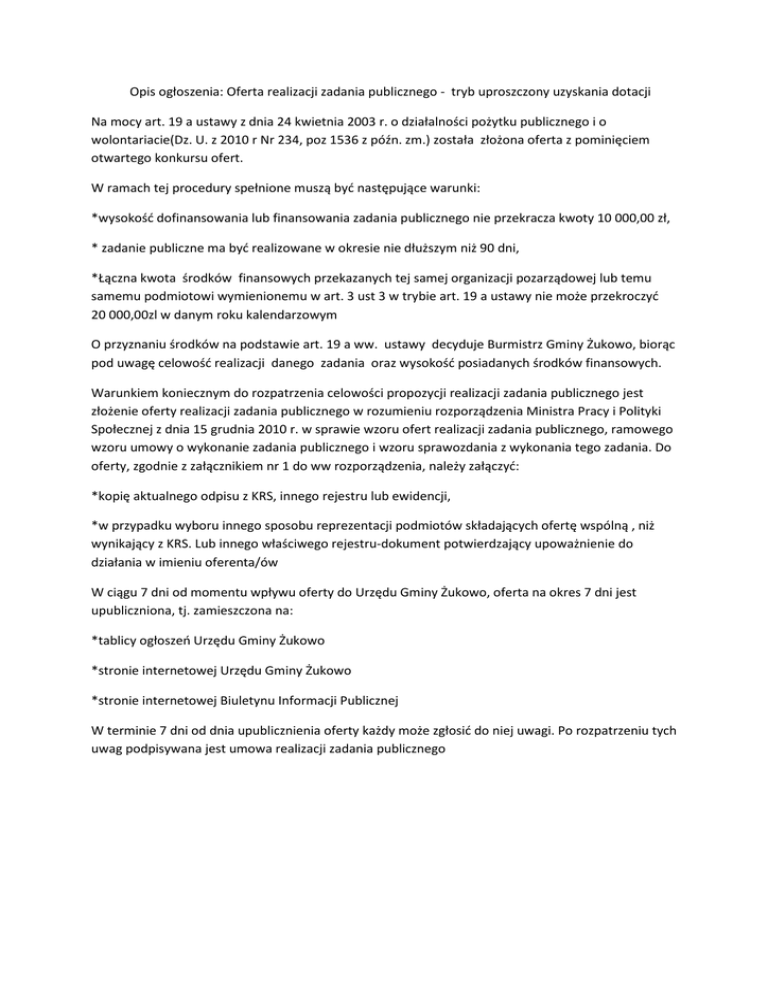 Opis ogłoszenia: Oferta realizacji zadania publicznego - tryb uproszczony uzyskania dotacji Na mocy art. 19 a ustawy z dnia 24 kwietnia 2003 r. o działalności pożytku publicznego i o wolontariacie(Dz. U. z 2010 r Nr 234, poz 1536 z późn. zm.) została złożona oferta z pominięciem otwartego konkursu ofert. W ramach tej procedury spełnione muszą być następujące warunki: *wysokość dofinansowania lub finansowania zadania publicznego nie przekracza kwoty 10 000,00 zł, * zadanie publiczne ma być realizowane w okresie nie dłuższym niż 90 dni, *Łączna kwota środków finansowych przekazanych tej samej organizacji pozarządowej lub temu samemu podmiotowi wymienionemu w art. 3 ust 3 w trybie art. 19 a ustawy nie może przekroczyć 20 000,00zl w danym roku kalendarzowym O przyznaniu środków na podstawie art. 19 a ww. ustawy decyduje Burmistrz Gminy Żukowo, biorąc pod uwagę celowość realizacji danego zadania oraz wysokość posiadanych środków finansowych. Warunkiem koniecznym do rozpatrzenia celowości propozycji realizacji zadania publicznego jest złożenie oferty realizacji zadania publicznego w rozumieniu rozporządzenia Ministra Pracy i Polityki Społecznej z dnia 15 grudnia 2010 r. w sprawie wzoru ofert realizacji zadania publicznego, ramowego wzoru umowy o wykonanie zadania publicznego i wzoru sprawozdania z wykonania tego zadania. Do oferty, zgodnie z załącznikiem nr 1 do ww rozporządzenia, należy załączyć: *kopię aktualnego odpisu z KRS, innego rejestru lub ewidencji, *w przypadku wyboru innego sposobu reprezentacji podmiotów składających ofertę wspólną , niż wynikający z KRS. Lub innego właściwego rejestru-dokument potwierdzający upoważnienie do działania w imieniu oferenta/ów W ciągu 7 dni od momentu wpływu oferty do Urzędu Gminy Żukowo, oferta na okres 7 dni jest upubliczniona, tj. zamieszczona na: *tablicy ogłoszeń Urzędu Gminy Żukowo *stronie internetowej Urzędu Gminy Żukowo *stronie internetowej Biuletynu Informacji Publicznej W terminie 7 dni od dnia upublicznienia oferty każdy może zgłosić do niej uwagi. Po rozpatrzeniu tych uwag podpisywana jest umowa realizacji zadania publicznego