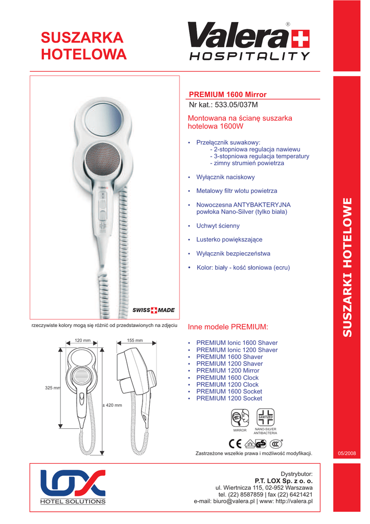 SUSZARKA HOTELOWA PREMIUM 1600 Mirror Nr kat.: 533.05/037M ? Przełącznik suwakowy: - 2-stopniowa regulacja nawiewu - 3-stopniowa regulacja temperatury - zimny strumień powietrza ? Wyłącznik naciskowy ? Metalowy filtr wlotu powietrza ? Nowoczesna ANTYBAKTERYJNA powłoka Nano-Silver (tylko biała) ? Uchwyt ścienny ? Lusterko powiększające ? Wyłącznik bezpieczeństwa ? Kolor: biały - kość słoniowa (ecru) rzeczywiste kolory mogą się różnić od przedstawionych na zdjęciu 120 mm 155 mm 325 mm Inne modele PREMIUM: ? ? ? ? ? ? ? ? ? SUSZARKI HOTELOWE Montowana na ścianę suszarka hotelowa 1600W PREMIUM Ionic 1600 Shaver PREMIUM Ionic 1200 Shaver PREMIUM 1600 Shaver PREMIUM 1200 Shaver PREMIUM 1200 Mirror PREMIUM 1600 Clock PREMIUM 1200 Clock PREMIUM 1600 Socket PREMIUM 1200 Socket ± 420 mm SANITIZED MIRROR NANO-SILVER ANTIBACTERIA * Zastrzeżone wszelkie prawa i możliwość modyfikacji. Dystrybutor: P.T. LOX Sp. z o. o. ul. Wiertnicza 115, 02-952 Warszawa tel. (22) 8587859 | fax (22) 6421421 e-mail: [email protected] | www: http://valera.pl 05/2008