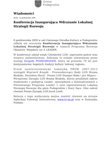 Wiadomości Środa, 14 października 2009 Konferencja Inaugurująca Wdrażanie Lokalnej Strategii Rozwoju 8 października 2009 w sali Gminnego Ośrodka Kultury w Podegrodziu odbyła sie uroczysta Konferencja Inaugurująca Wdrażanie Lokalnej Strategii Rozwoju w ramach Programu Rozwoju Obszarów Wiejskich osi 4 LEADER. W konferencji udział wzięli Członkowie LGD, zaproszeni goście oraz wszyscy zainteresowani. Zebranie to zostało uświetnione przez występ Zespołu PODEGRODZIE, który od przeszło 70 lat jest kontynuatorem bogatych tradycji kultury ludowej regionu. Przed zainteresowanymi tematyką PROW 2007-2013 wystąpili Wojciech Knapik - Przewodniczący Rady LGD Brama Beskidu, Stanisław Haraf - Prezes LGD Dunajec-Biała i Jan Migacz Wiceprezes Zarządu LGD Brama Beskidu, którzy przybliżyli zakres wiadomości z podejścia Leader, opowiedzieli o doświadczeniach z Pilotażowego Programu Leader + oraz zaprezentowali Lokalną Strategię Rozwoju dla gmin Podegrodzie i Stary Sącz. Głos zabrał również Prezes Zarządu LGD Jacek Lelek. Relacje z tego wydarzenia można znaleźć również na stronie Sądeckiej Telewizji Internetowej: www.tv-ns.pl oraz w Dzienniku Polskim.