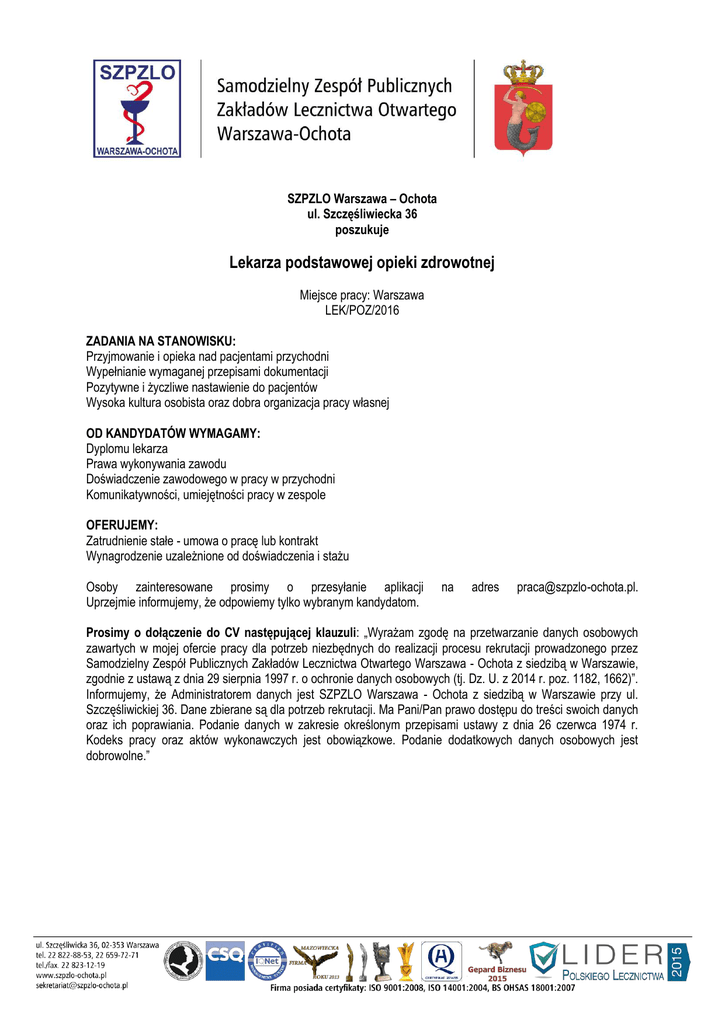 SZPZLO Warszawa – Ochota ul. Szczęśliwiecka 36 poszukuje Lekarza podstawowej opieki zdrowotnej Miejsce pracy: Warszawa LEK/POZ/2016 ZADANIA NA STANOWISKU: Przyjmowanie i opieka nad pacjentami przychodni Wypełnianie wymaganej przepisami dokumentacji Pozytywne i życzliwe nastawienie do pacjentów Wysoka kultura osobista oraz dobra organizacja pracy własnej OD KANDYDATÓW WYMAGAMY: Dyplomu lekarza Prawa wykonywania zawodu Doświadczenie zawodowego w pracy w przychodni Komunikatywności, umiejętności pracy w zespole OFERUJEMY: Zatrudnienie stałe - umowa o pracę lub kontrakt Wynagrodzenie uzależnione od doświadczenia i stażu Osoby zainteresowane prosimy o przesyłanie aplikacji Uprzejmie informujemy, że odpowiemy tylko wybranym kandydatom. na adres [email protected]. Prosimy o dołączenie do CV następującej klauzuli: „Wyrażam zgodę na przetwarzanie danych osobowych zawartych w mojej ofercie pracy dla potrzeb niezbędnych do realizacji procesu rekrutacji prowadzonego przez Samodzielny Zespół Publicznych Zakładów Lecznictwa Otwartego Warszawa - Ochota z siedzibą w Warszawie, zgodnie z ustawą z dnia 29 sierpnia 1997 r. o ochronie danych osobowych (tj. Dz. U. z 2014 r. poz. 1182, 1662)”. Informujemy, że Administratorem danych jest SZPZLO Warszawa - Ochota z siedzibą w Warszawie przy ul. Szczęśliwickiej 36. Dane zbierane są dla potrzeb rekrutacji. Ma Pani/Pan prawo dostępu do treści swoich danych oraz ich poprawiania. Podanie danych w zakresie określonym przepisami ustawy z dnia 26 czerwca 1974 r. Kodeks pracy oraz aktów wykonawczych jest obowiązkowe. Podanie dodatkowych danych osobowych jest dobrowolne.”